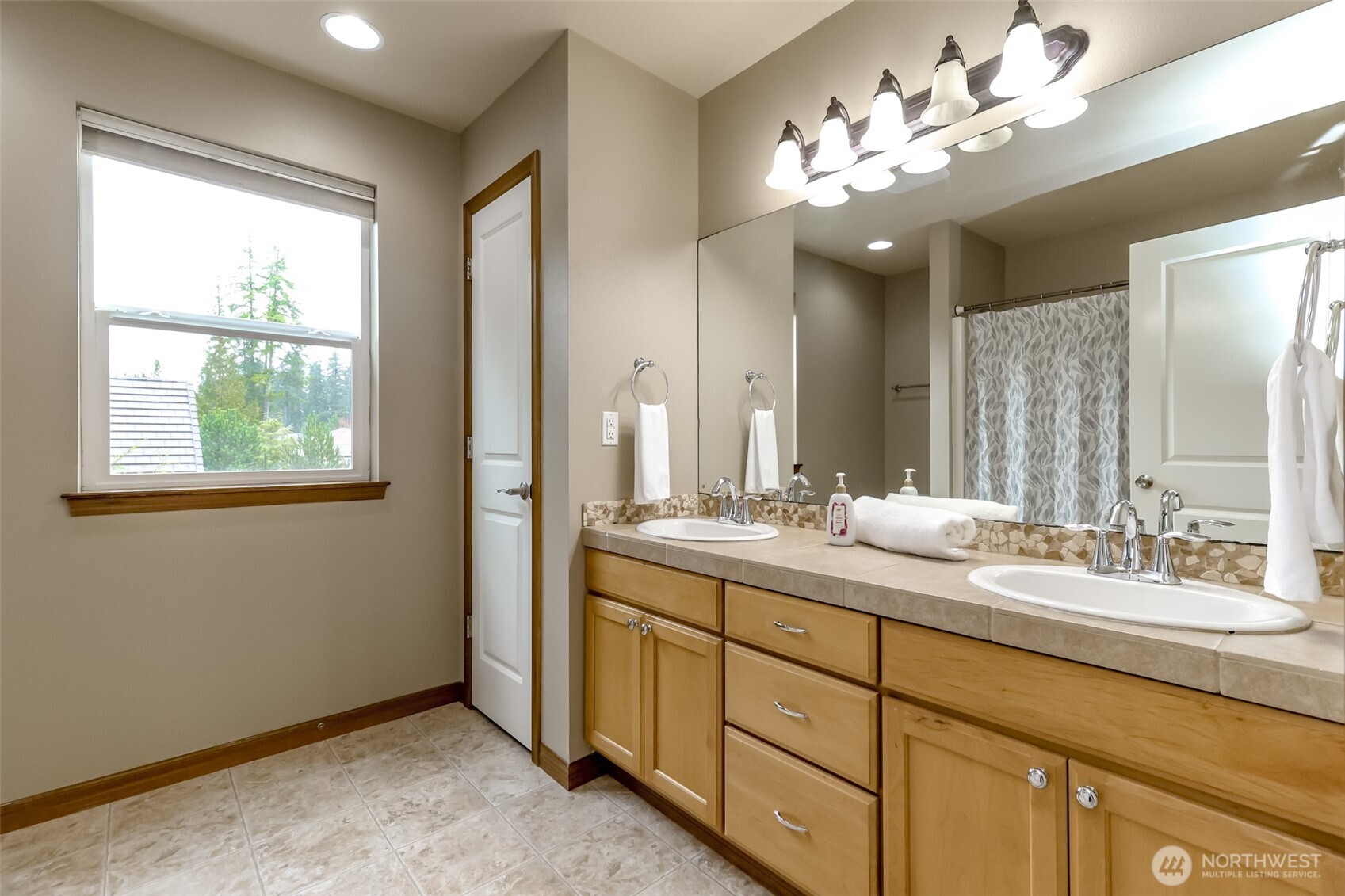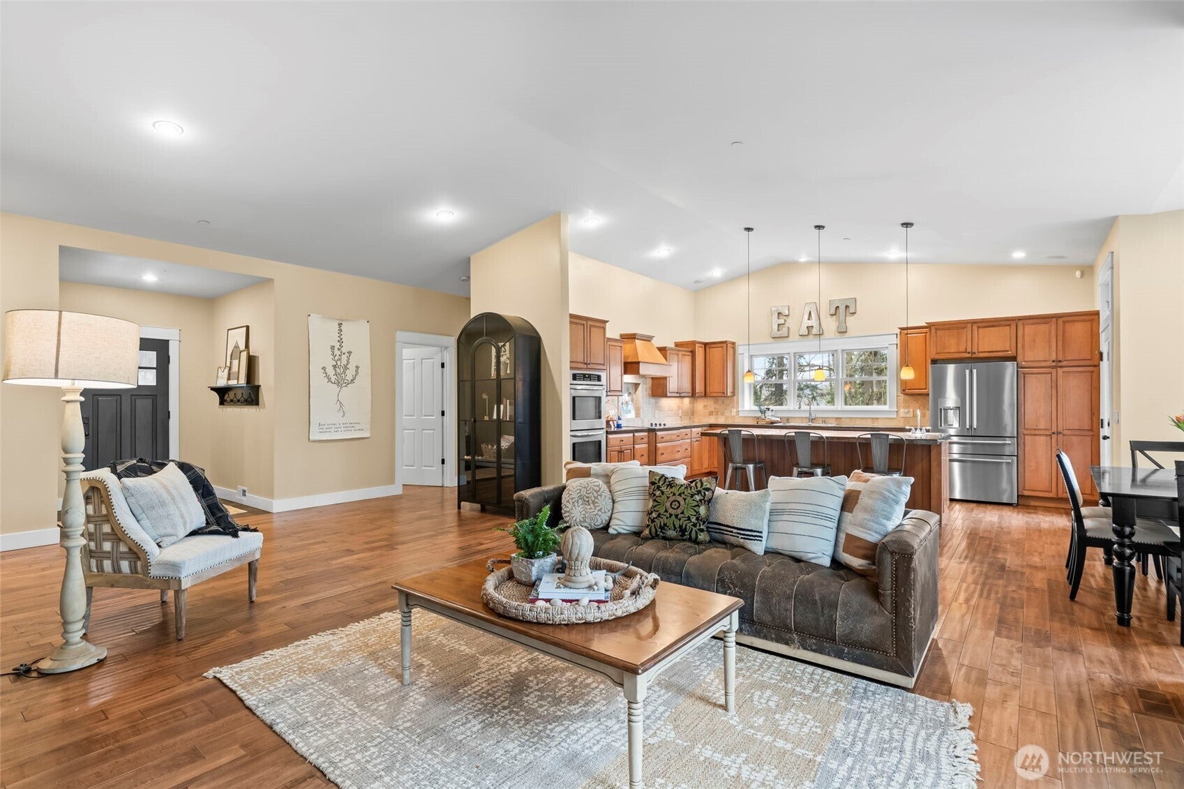 Country living at its finest in the highly sought-after Agnew areajust 15 minutes to both Sequim and Port Angeles. Built in 2019, this thoughtfully designed custom home rests on 1.26 acres at the end of a peaceful cul-de-sac, less than a mile from the Olympic Discovery Trail. Step inside to a light-filled interior where quality craftsmanship and elevated finishes shine. The open-concept kitchen is a true centerpiece, featuring an oversized island with seating for four, a farmhouse sink, walk-in pantry, stainless steel appliances, an upgraded exhaust hood, and cabinetry extended to the ceiling with decorative glass accents. Quartz countertops run throughout the entire homeincluding the stunning primary bath shower wallscreating a seamless, upscale aesthetic. Vaulted ceilings and pet-friendly wide-plank luxury vinyl flooring enhance the spacious feel. The living room offers warmth and comfort with a remote-controlled propane fireplace and a wall of windows perfectly framing views of Hurricane Ridge and the Olympic Mountains. A smart split floor plan provides privacy, with the primary suite set apart from the guest bedrooms. In the spa-inspired primary bath, enjoy a sunken jetted tub and step onto thermostat-controlled heated tile floors for everyday luxury. The well-appointed laundry room includes a dedicated office nook with storage cabinetry and quartz countertopsideal for working from home or managing household tasks. Outside, the amenities continue: a heated oversized three-car attached garage with a workbench and mountain views, an 800 sq. ft. detached RV shop with 60-amp service and attached carport, plus a separate full-service RV pad with complete hookups. The paved driveway, 11-zone underground sprinkler system with a 1,500-gallon holding tank, and dual water sources (PUD and seasonal Agnew Irrigation District) add both convenience and peace of mind. A rare combination of luxury, functionality, and breathtaking scenerythis is Pacific Northwest living at its best.