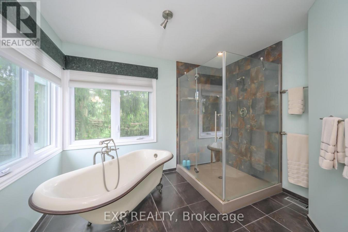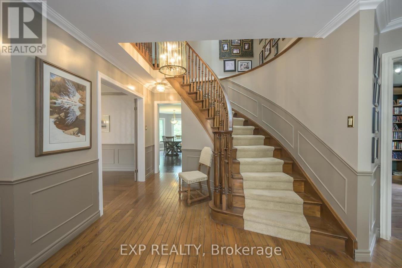 Welcome to this exceptional property nestled on a pie-shaped ravine lot, backing directly onto a protected conservation area offering the ultimate in privacy, serenity, and space. Situated on approximately 1/3 of an acre, the grounds are professionally landscaped with irrigation, accent lighting, a gazebo, and a stamped concrete driveway, creating a picturesque outdoor living experience. The fenced yard is perfect for families, pets, and entertaining while still offering stunning, unobstructed views of nature all year round. Inside, this meticulously maintained home features over 3, 100 sq ft above grade, plus a fully finished walk-out lower level, providing more than 4, 300 sq ft of total living space. The layout is both functional and elegant, with hardwood flooring, crown molding, and two natural gas fireplaces. The main floor includes a private home office, a formal dining room, main-floor laundry, and a spacious open-concept living area that suits both relaxed evenings and lively gatherings. Upstairs, the primary suite is a true retreat, complete with hardwood floors, a walk-in closet, and a spa-like 5-piece ensuite with heated floors. On the lower level, youll find a workshop, a generous rec room with a built-in bar fridge, and a mounted 60" TV (included) ideal for in-laws, teens, or entertaining. A second 50" TV is mounted on the main floor in the cozy family room, perfect for everyday relaxation. Major updates have all been done for you: a metal roof (2022) with a transferable 50-year warranty, a new furnace (2023), and updated windows and garage doors (2016). The oversized 3-car garage provides ample space for vehicles, tools, and toys. This is a rare opportunity to own a beautifully upgraded, move-in-ready home in one of the most peaceful and sought-after settings in the area, perfect for families, professionals, or anyone looking to blend luxury with nature. (id: 58753)