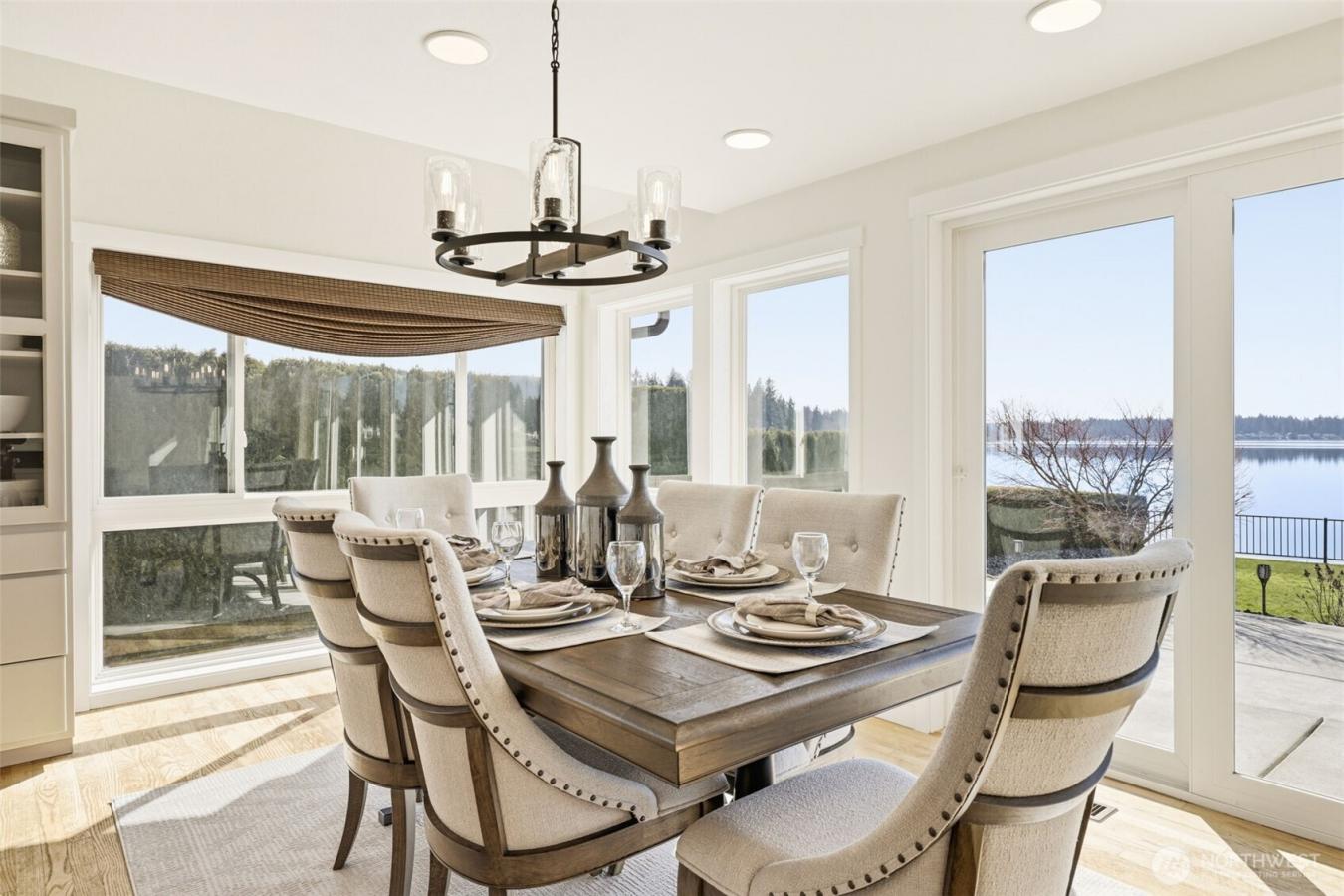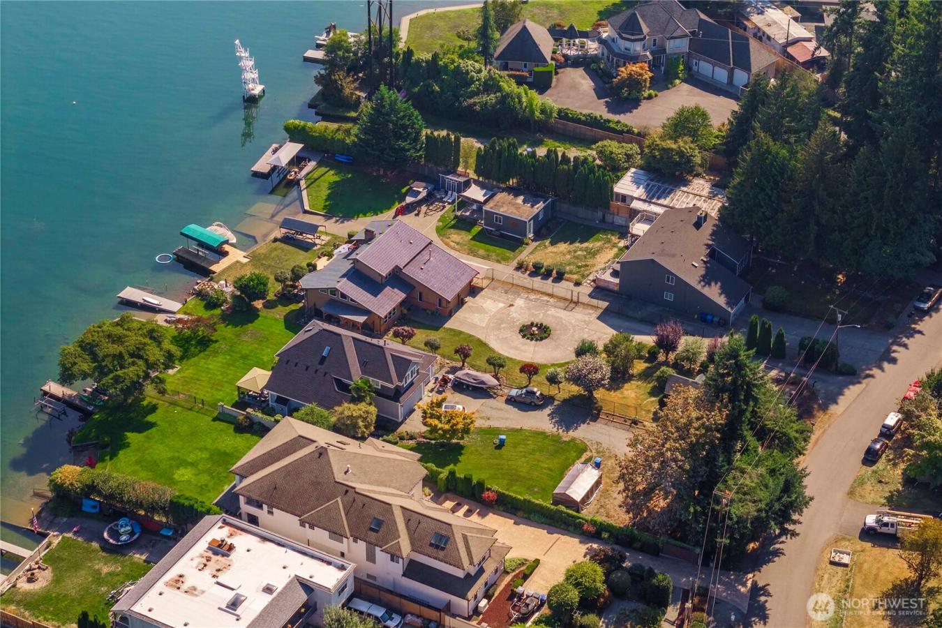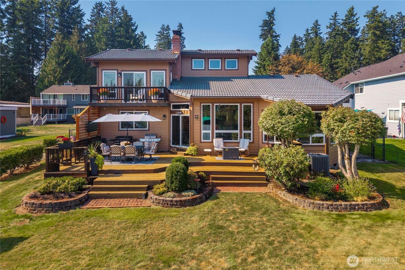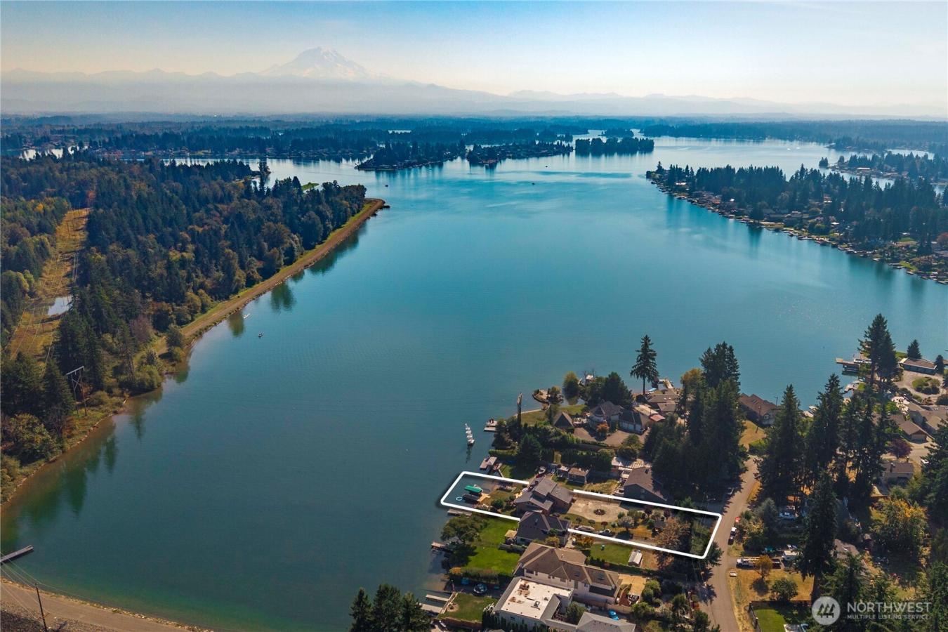 Exceptional Tapps Island waterfront home situated on a rare no-bank lot with 87 feet of pristine Lake Tapps frontage, offering sweeping open-water views and a stunning backdrop of Mt. Rainier. Designed to capture the beauty of the lake, this home offers over 3,064 square feet of living space with dramatic floor-to-ceiling windows showcasing breathtaking lake views throughout. The impressive great room features vaulted ceilings and expansive windows, creating a light-filled space that flows seamlessly to the outdoors. The oversized kitchen and spacious dining area were designed for entertaining, offering abundant counter space, a large island, and sliding doors leading to the expansive patio overlooking the lake. The main-floor primary suite features beautiful lake views, a spacious bath with a large walk-in shower, and an oversized walk-in closet. A large main-floor media room or office provides flexible living space. Upstairs youll find two spacious bedrooms with lake views and an updated full bathroom. The flat backyard is truly an entertainers dream with a large patio overlooking the water, perfect for gatherings and relaxing lakeside. Waterfront amenities include an expansive dock with a slip, ideal for boating and lake recreation. A detached garage connected by a portico provides excellent space for vehicles and lake toys. Presidential 50-year roof in 2023. Located in the Tapps Island community with golf, parks, and Dieringer Schools.