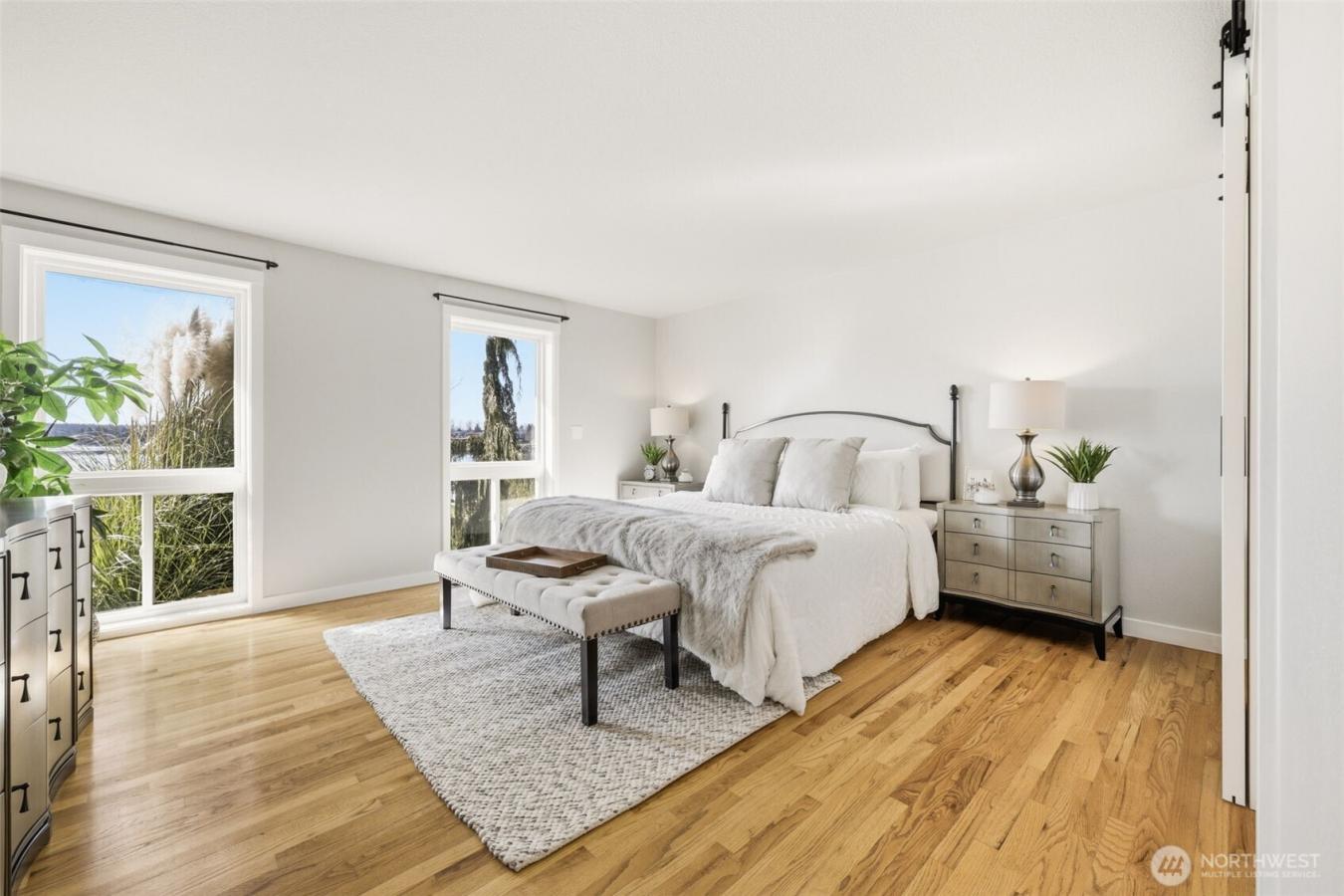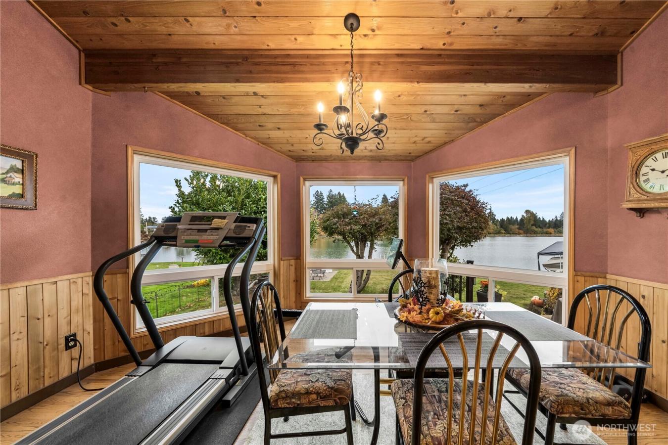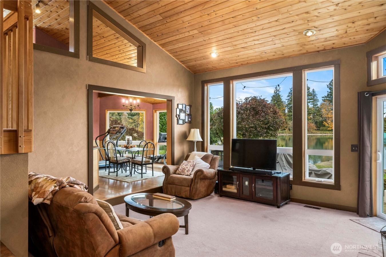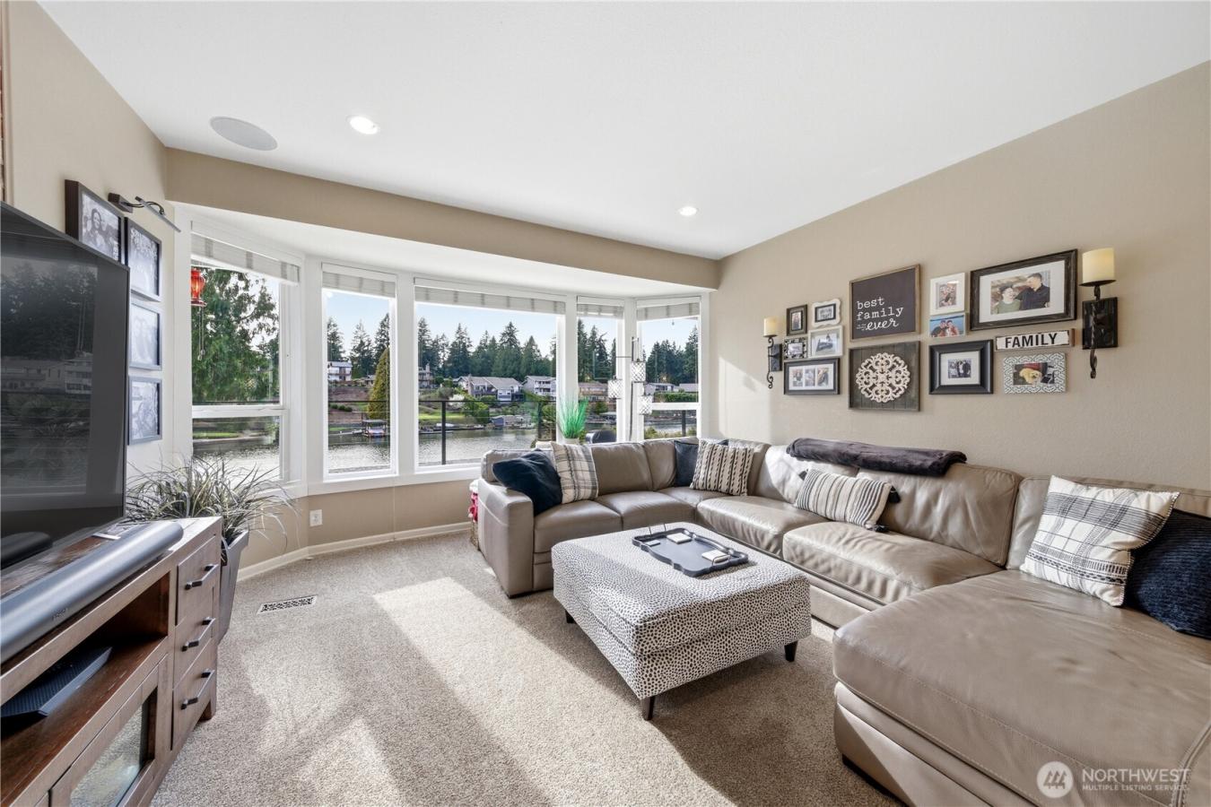 Exceptional Tapps Island waterfront home situated on a rare no-bank lot with 87 feet of pristine Lake Tapps frontage, offering sweeping open-water views and a stunning backdrop of Mt. Rainier. Designed to capture the beauty of the lake, this home offers over 3,064 square feet of living space with dramatic floor-to-ceiling windows showcasing breathtaking lake views throughout. The impressive great room features vaulted ceilings and expansive windows, creating a light-filled space that flows seamlessly to the outdoors. The oversized kitchen and spacious dining area were designed for entertaining, offering abundant counter space, a large island, and sliding doors leading to the expansive patio overlooking the lake. The main-floor primary suite features beautiful lake views, a spacious bath with a large walk-in shower, and an oversized walk-in closet. A large main-floor media room or office provides flexible living space. Upstairs youll find two spacious bedrooms with lake views and an updated full bathroom. The flat backyard is truly an entertainers dream with a large patio overlooking the water, perfect for gatherings and relaxing lakeside. Waterfront amenities include an expansive dock with a slip, ideal for boating and lake recreation. A detached garage connected by a portico provides excellent space for vehicles and lake toys. Presidential 50-year roof in 2023. Located in the Tapps Island community with golf, parks, and Dieringer Schools.