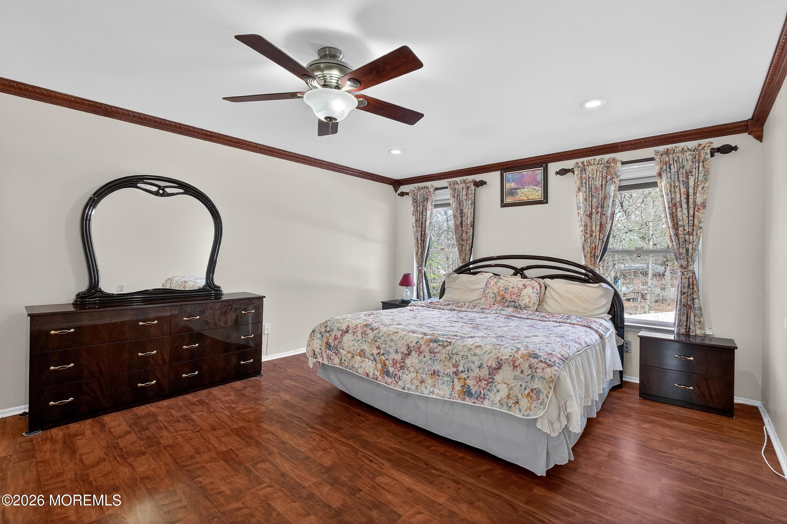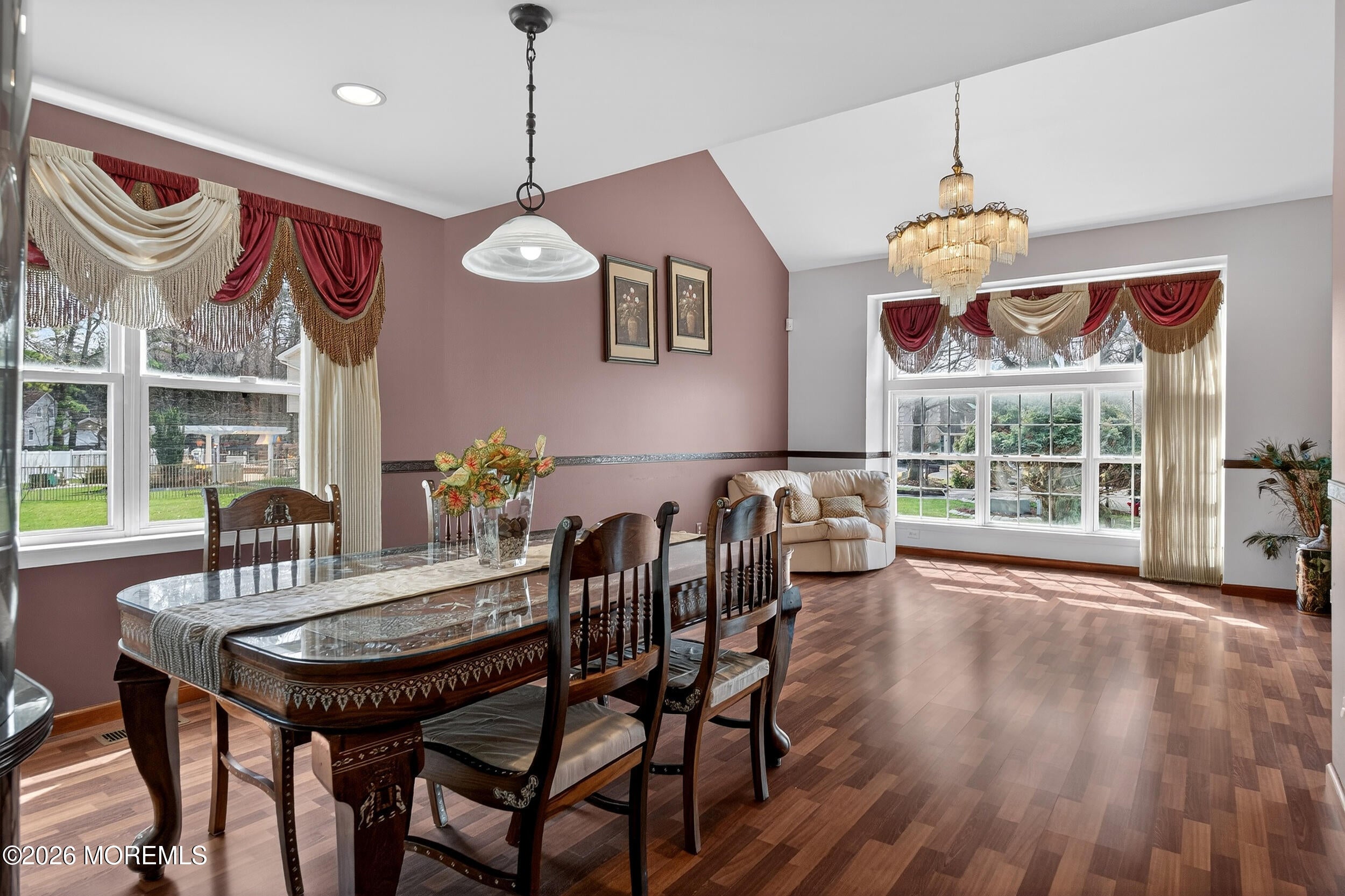 Beautifully expanded 4BR/3BA Colonial on a cul-de-sac offering approx. 3,100 sq ft, including a stunning 900 sq ft addition off the kitchen. Double doors open to a diamond-cut ceramic tile foyer with coat closet and full bath. Formal living and dining rooms feature Pergo floors, cathedral ceilings, floor-to-ceiling windows, decorative molding and recessed lighting.