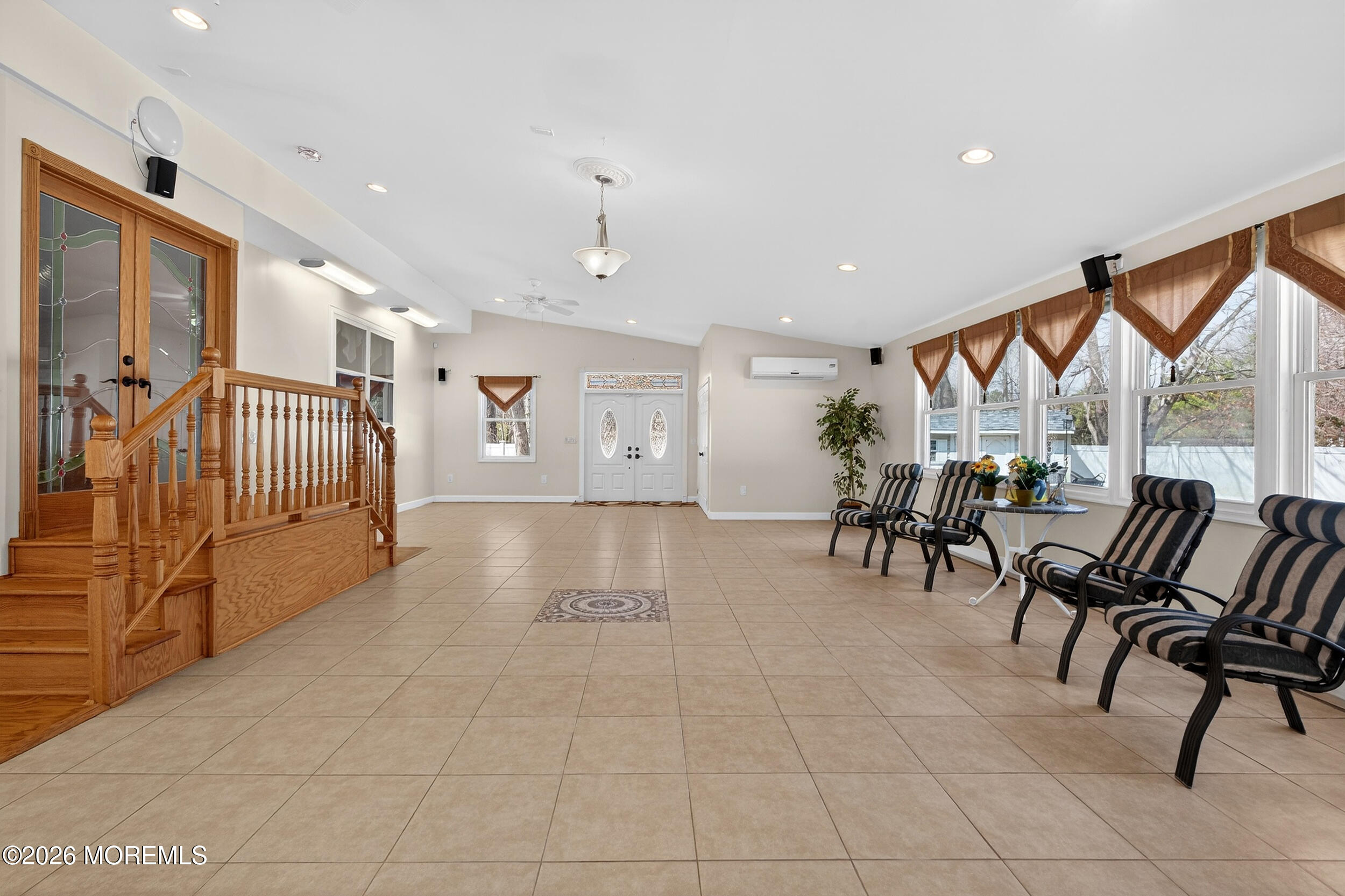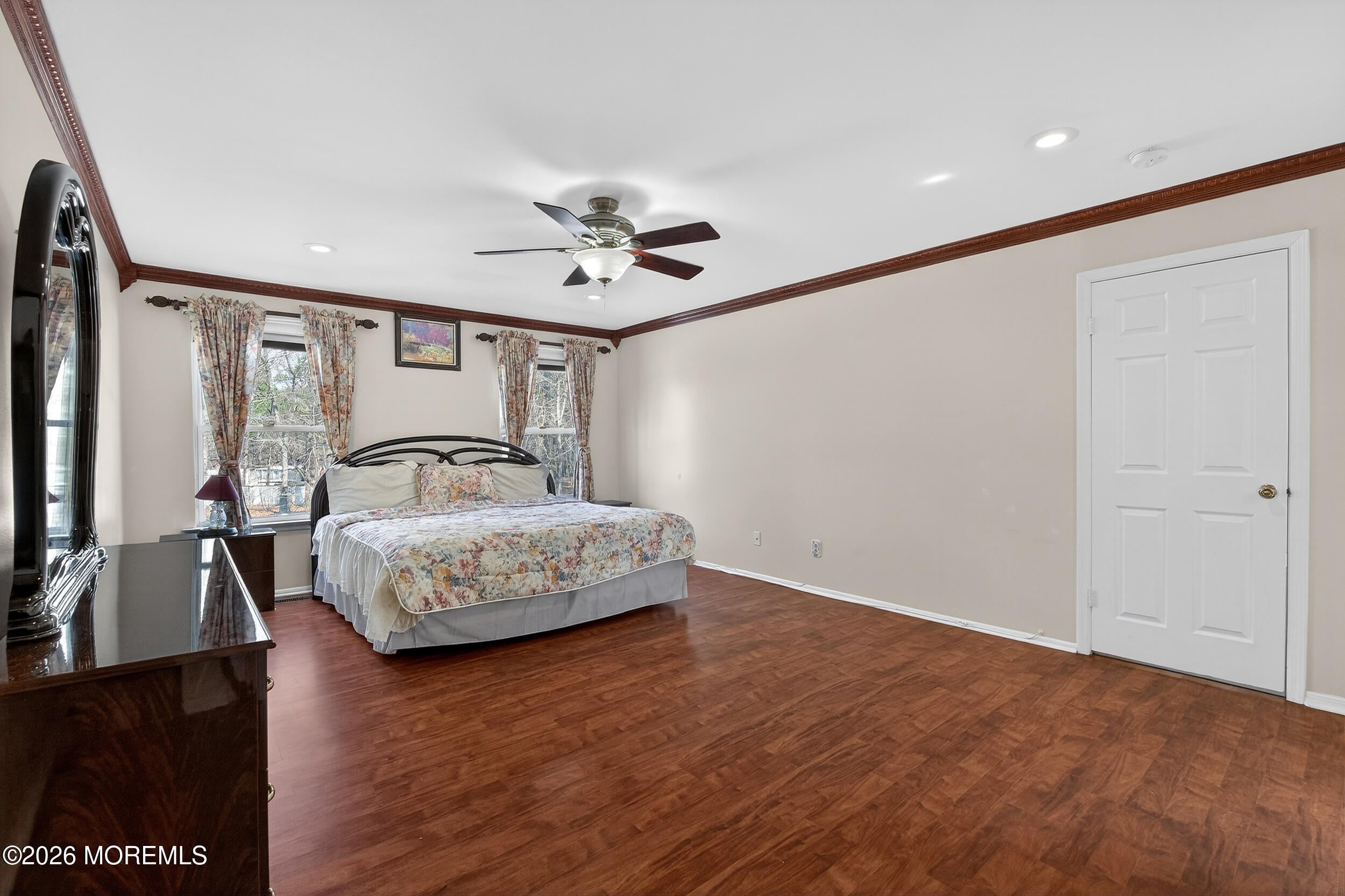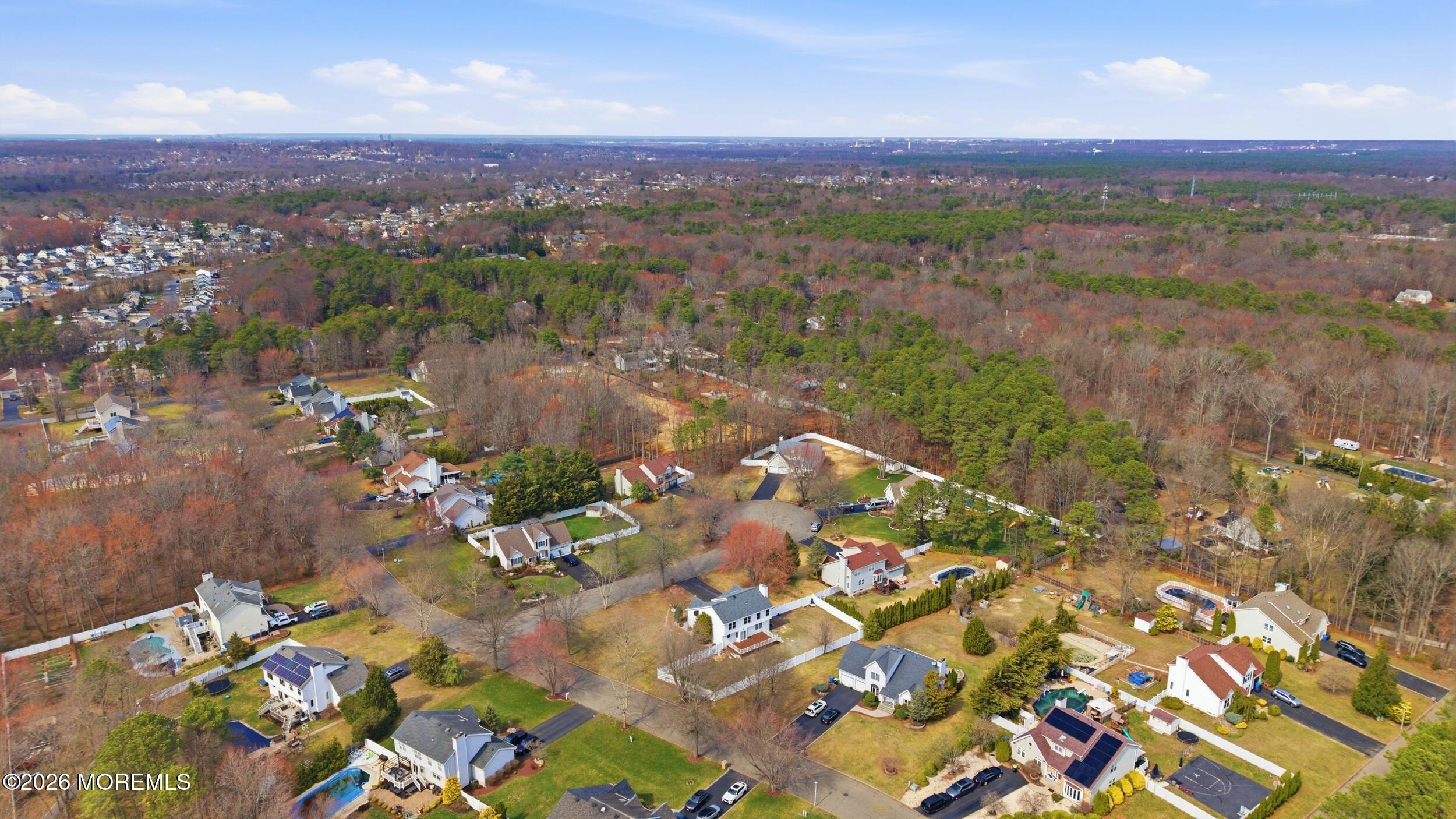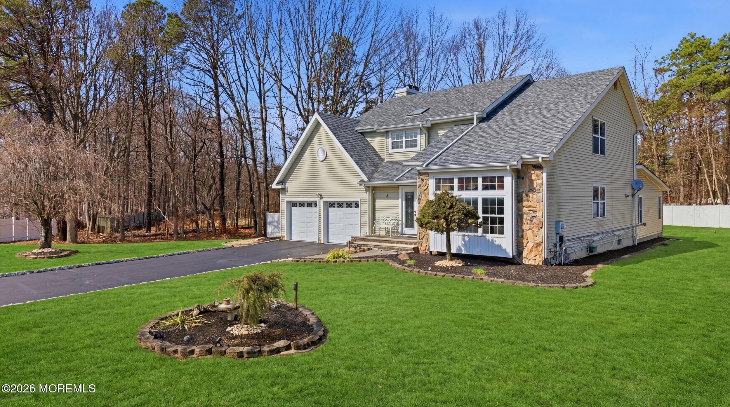 Welcome to this beautifully expanded and exceptionally well-appointed 4-bedroom, 3-full-bath Colonial offering approximately 3,100 square feet, including a stunning 900 square foot addition off the kitchen. Tucked away at the end of a cul-de-sac, this home makes an immediate impression with double entry doors opening to a diamond-cut ceramic tile foyer with coat closet and a full bath with shower stall on the main level. The formal living room features Pergo flooring, cathedral ceilings, dramatic picture and floor-to-ceiling windows, chandelier lighting, and flows seamlessly into the elegant dining room with matching Pergo floors, chair rail, decorative molding & recessed lighting. The spacious eat-in kitchen is beautifully appointed with oak cabinetry, Black Galaxy granite countertops and backsplash, stainless steel appliances, gas cooking vented outside, center island with breakfast bar, and a bright breakfast area with bay sliders (granite table & chairs included). Step down into the inviting family room with Pergo flooring, wood-burning fireplace, ceiling fan, recessed lighting, and views of the show-stopping 900 sq ft tiled addition featuring cathedral ceilings, walls of windows, recessed and track lighting, speaker system, large storage closet, decorative etched French doors, and double doors leading to the porch and fully fenced backyard, property does extends beyond the fence line. Upstairs offers four generously sized bedrooms, all with Pergo flooring, including a spacious primary suite with decorative cherry crown molding, recessed lights, extra large walk-in closet & additional storage, and a beautifully renovated bath with double cherry vanity, granite countertops, skylight, jetted tub, and oversized tiled shower. The renovated hall bath adds even more style and function. The fully finished basement expands the living space even further with recessed lighting, wet bar, bonus room, gym area & multiple storage closets. Additional highlights include 6-zone sprinkler system, security system, attic fan, and HVAC and roof updated approximately 2022. Minutes away from NYC Bus, train, shopping and all major roadways. Quick ride to the beach! Exceptional space, standout updates, and an unbeatable settingthis is the one.