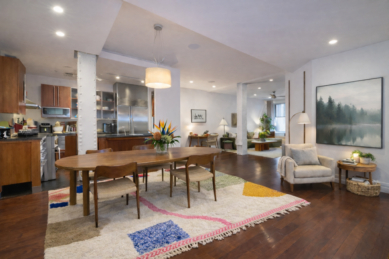 This triple-mint corner residence is a refined interpretation of the iconic Tribeca loft aesthetic, featuring slender whitewashed oak plank floors, soaring ceilings, and nearly floor-to-ceiling windows that flood the home with natural light.