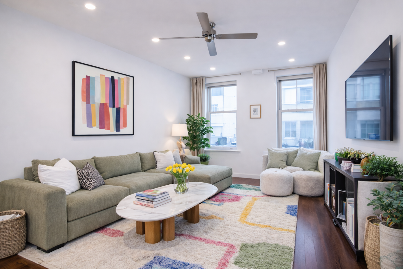 The moment the keyed elevator opens directly into 55 Vestry 5C, the feeling is immediate: air, light, and an uncommon sense of calm. 22-foot ceilings lift the great room into something far rarer than simple size: true volume. Golden western sunlight pours through two stories of oversized arched windows, drifting slowly across white oak floors as the day unfolds.