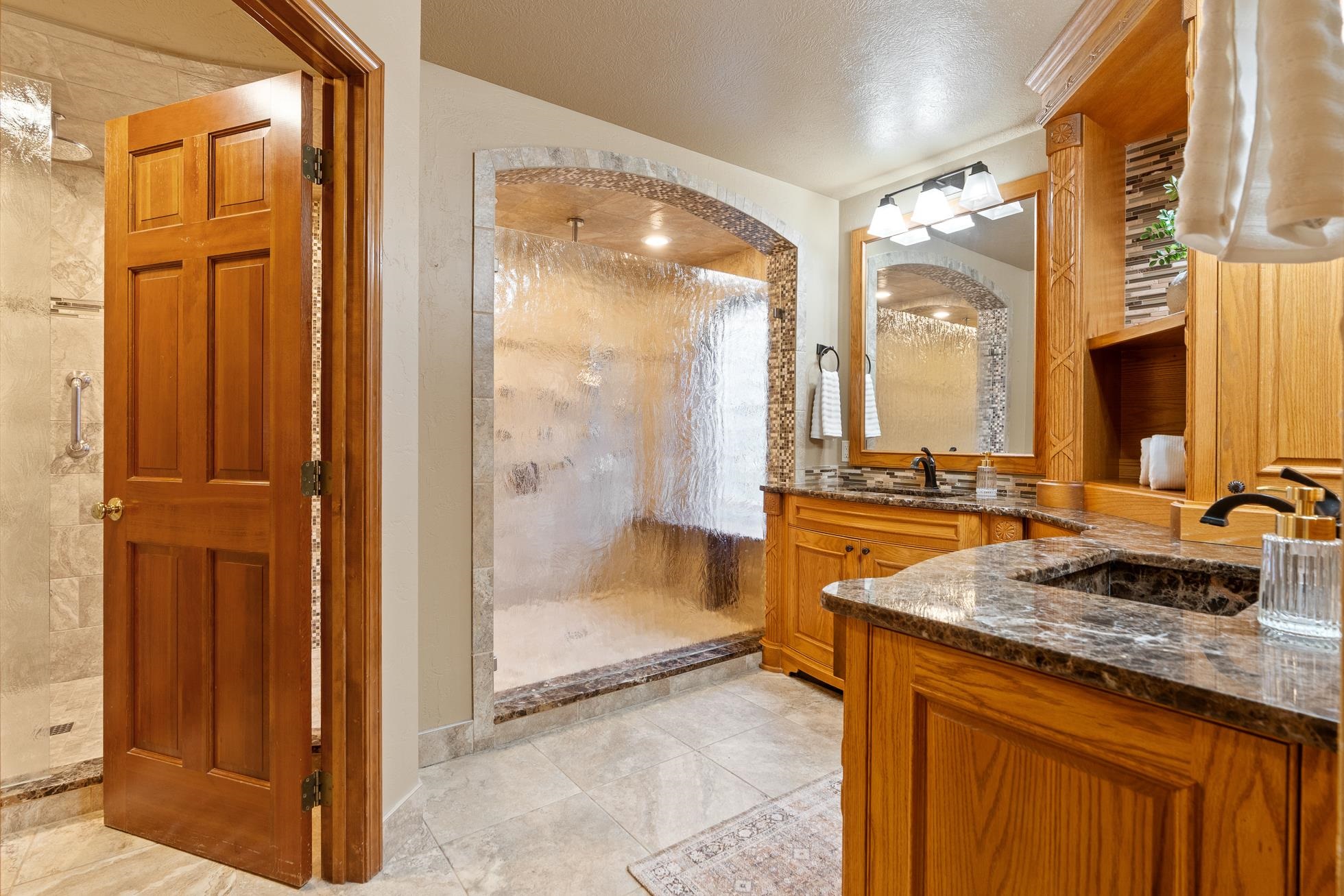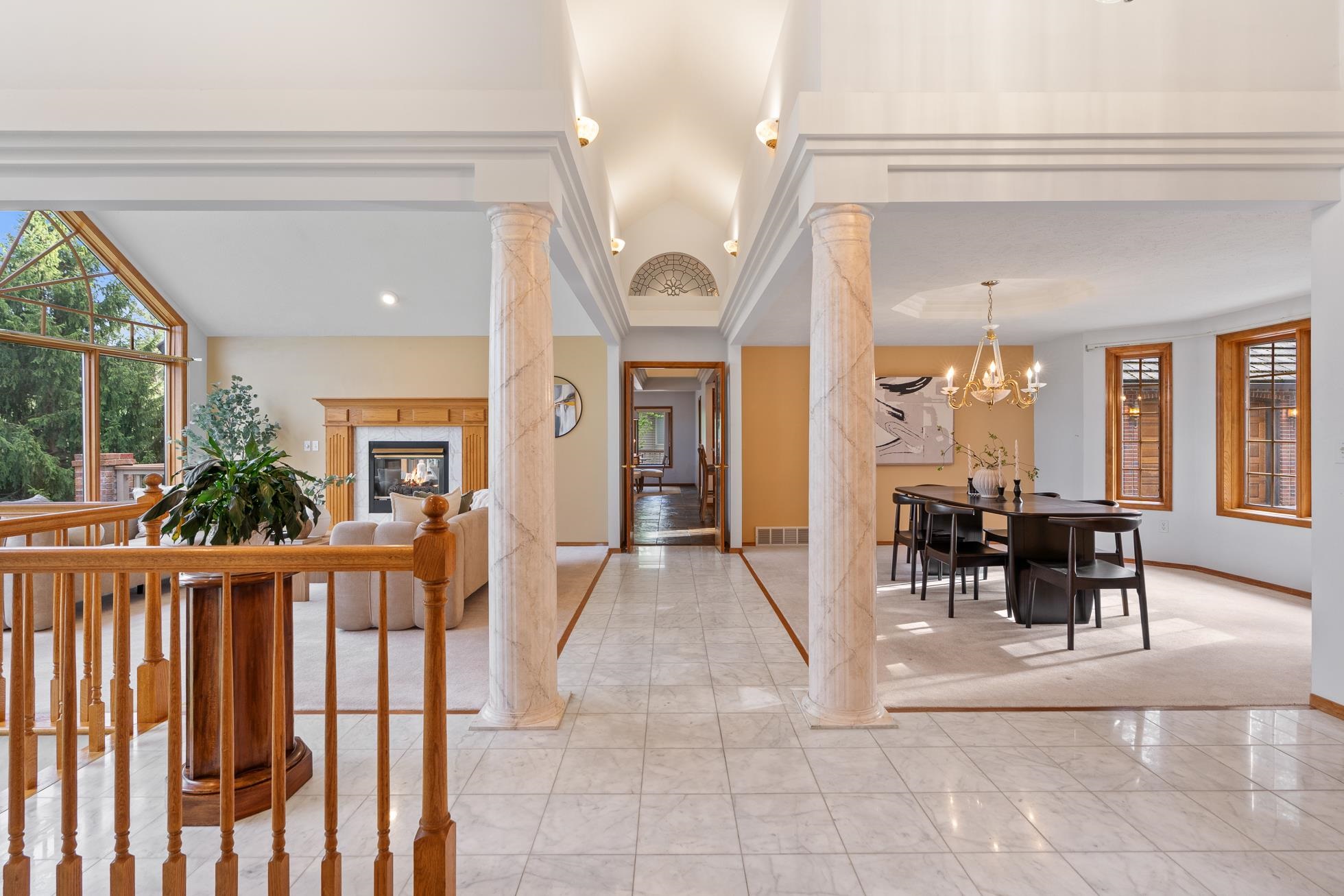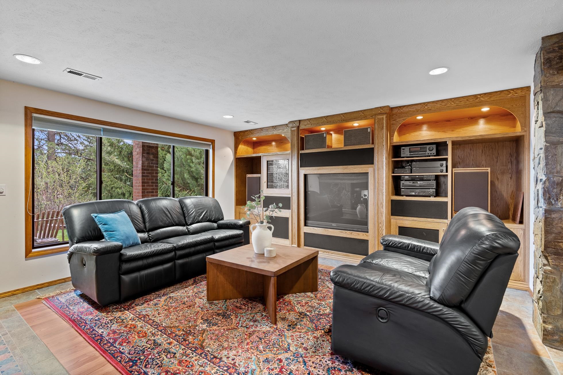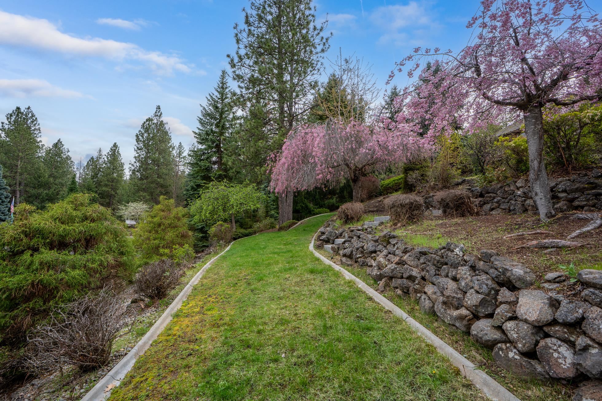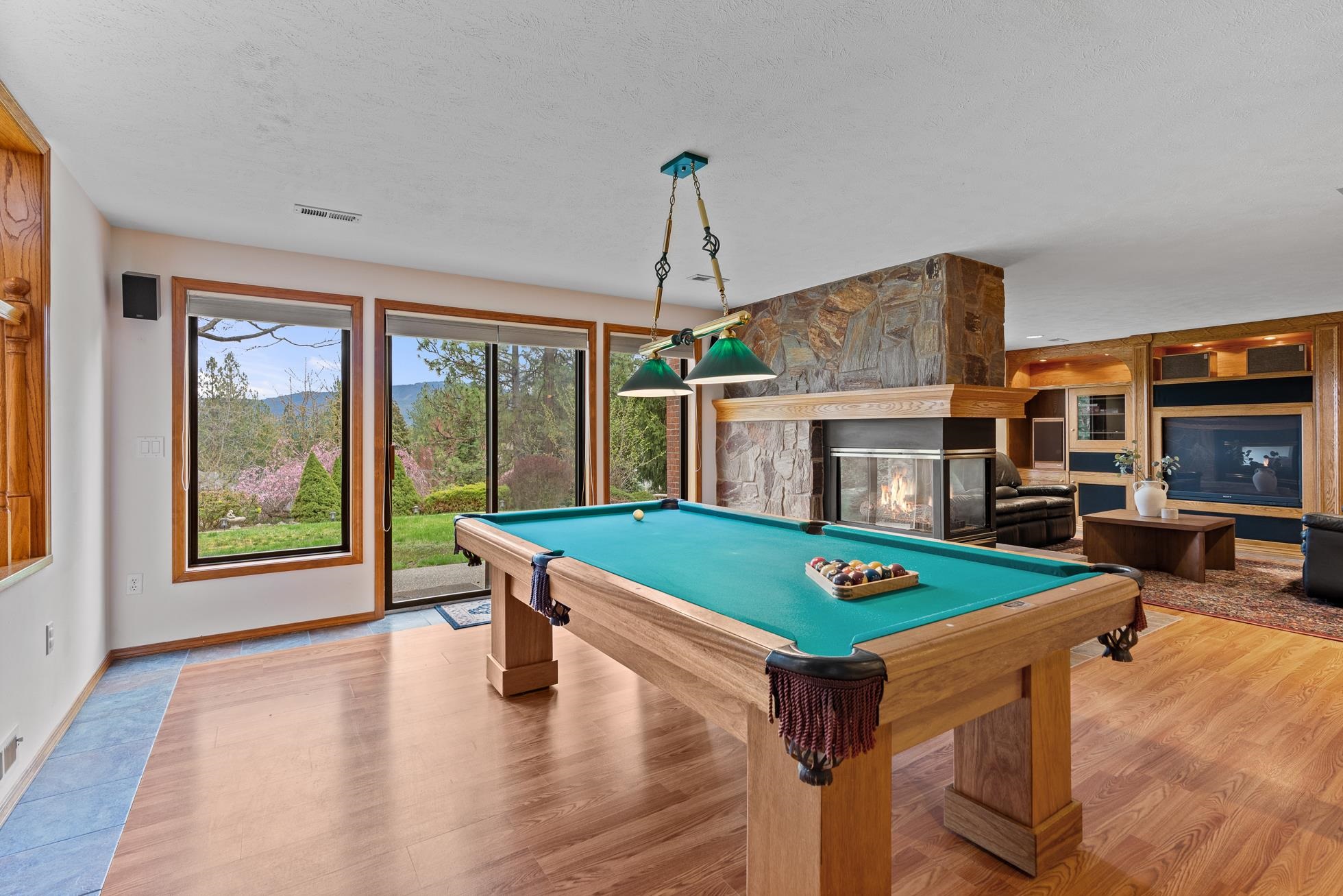 Tucked at the end of a quiet cul-de-sac on a private drive, this 5 bed, 5 bath home offers privacy, panoramic Mica Peak views, and exceptional entertaining space. Featuring two master suites, a chef's kitchen with JennAir range, and a full wet bar seating 10 with wine storage, beverage fridges, icemaker, and tap system. The family room is equipped with surround sound, while the primary suite offers a spa-style bath with heated floors, waterfall heads, side jets, and Grohe fixtures. Cedar sauna, jetted tub, pool table, and double-sided gas fireplaces complement the home's amenities. Custom woodwork, stained glass, and Carrara marble add character throughout. Oversized 4-car garage and updated HVAC, water heaters, and whole-house Zilmet water softener system complete this exceptional home.
