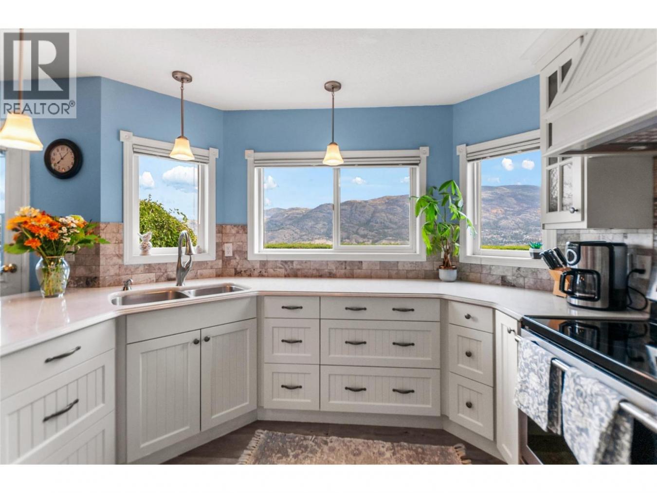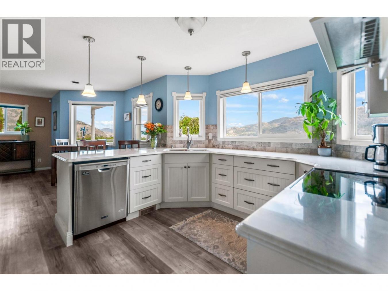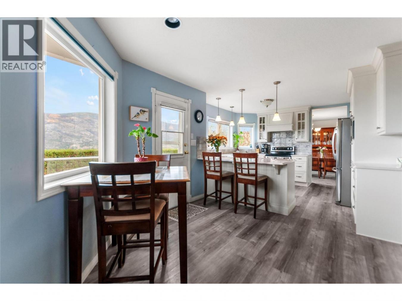 Set above Skaha Lake in Kaleden, next to the KVR Trail, this custom home is one of those properties people slow down to admire. It offers 7,000 sqft of living space with 5 baths, 4 bedrooms, plus an additional 2 bedrooms set up in the flex room on the main floor & the loft. With almost 2.5 acres, it has space to add features like a pool & a pool house. The covered front porch with its barrel-style ceiling flows right into the foyer. In the great room, the timber mantle & stone fireplace anchor the space, while the fir trim throughout adds elegance & shows that no expense was spared in building this home. The kitchen has a massive granite-topped island, Miele appliances, banquette seating, & direct access to the concrete stamped deck w/ glass railing for unobstructed views of nature. The primary suite is a retreat with French doors to a private sitting area, a two-way fireplace, and a renovated ensuite with a soaker tub. The loft is the perfect space for a bedroom or home office/art studio. The lower level adds a full kitchen, media room, games area, 3 bedrooms & storage. Excellent opportunity for a short-term rental setup. The detached 4-bay garage is a dream for hobbies, cars, or toys. ICF construction, geothermal, stamped concrete with radiant floor on all 3 levels. Step-free access on the main floor, wider interior hallways, and direct access to the backyard path, which leads to a magical viewpoint, add comfort and flexibility for new homeowners to age in place. (id:55532)