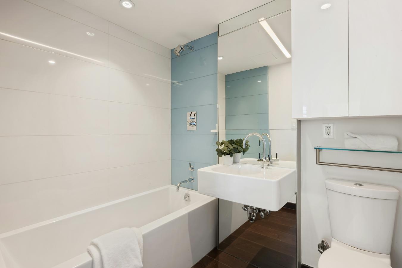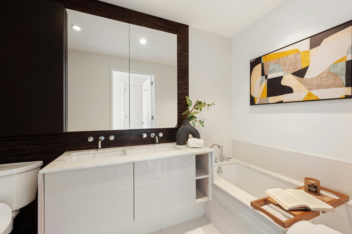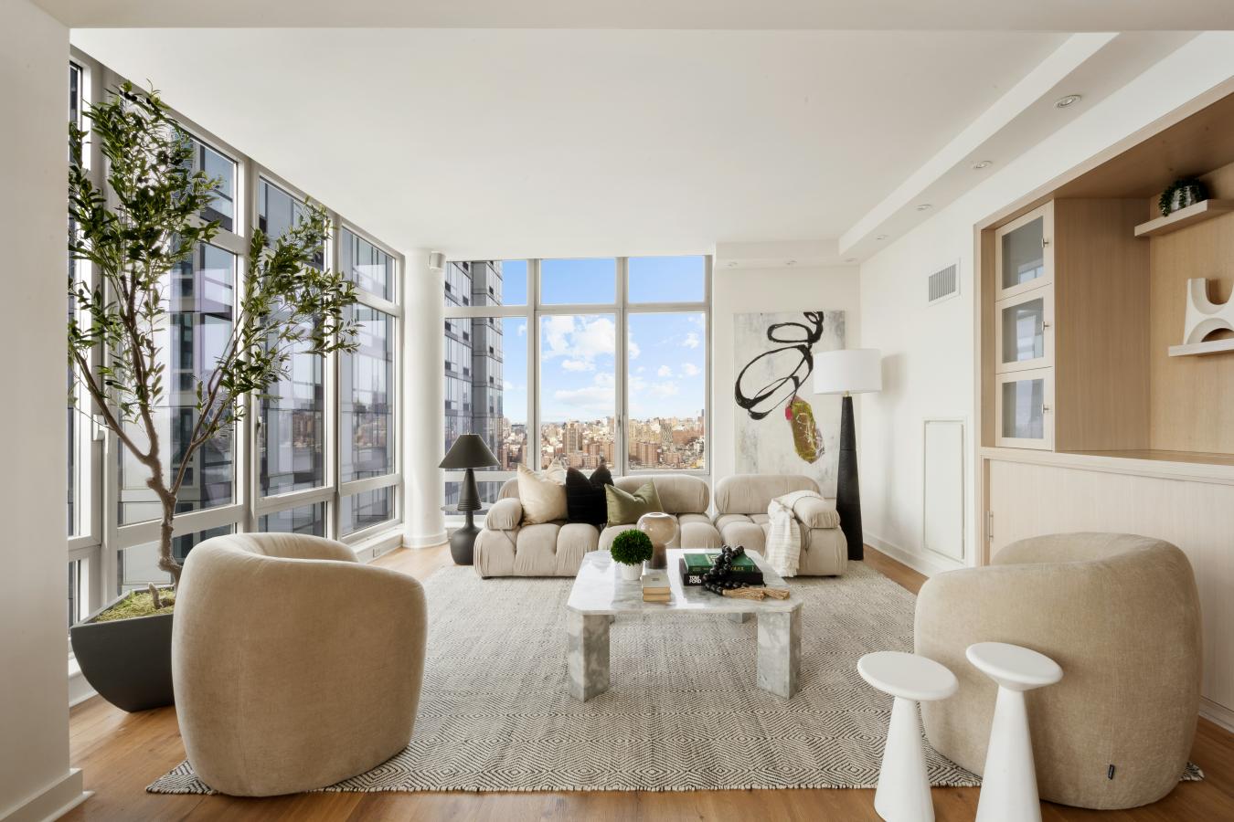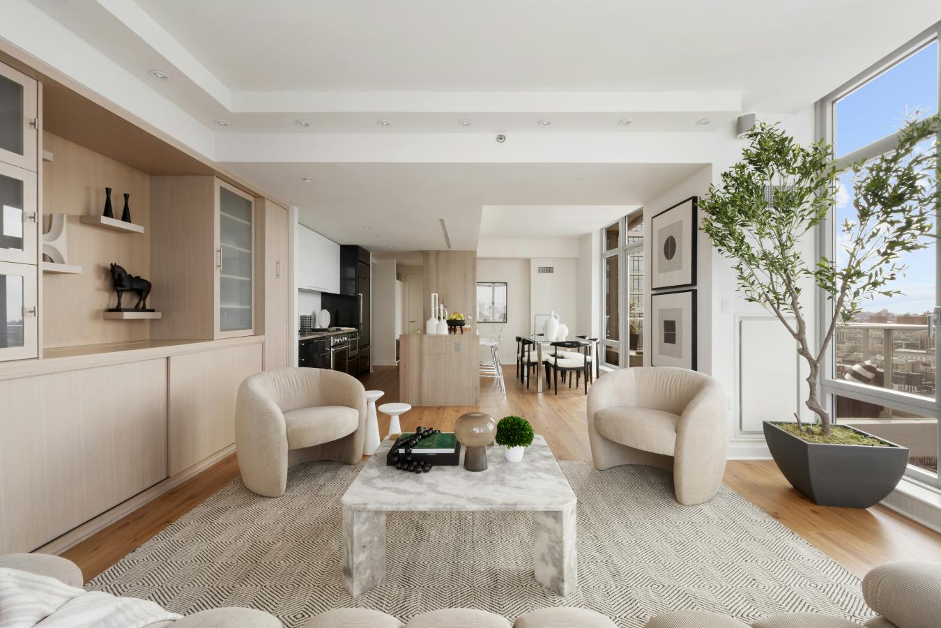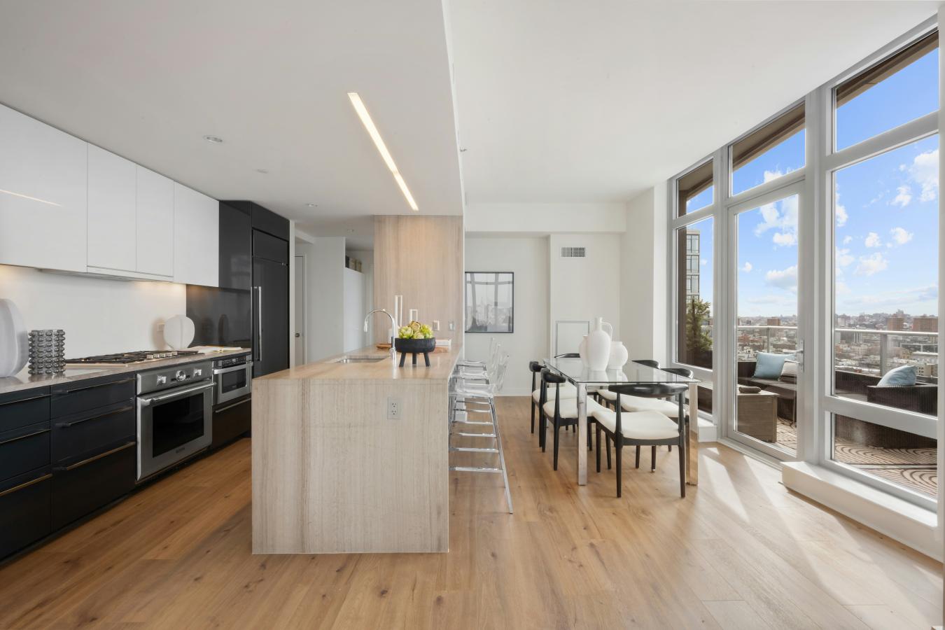 Apartment 27A is a corner 2-bedroom, 2-bath residence with walls of windows framing Western and Southern views spanning from Manhattans midtown skyline to the iconic Brooklyn Bridge. The open kitchen features lacquered cabinetry, SubZero and Bosch appliances with large stone center island overlooking the bright dedicated dining area.