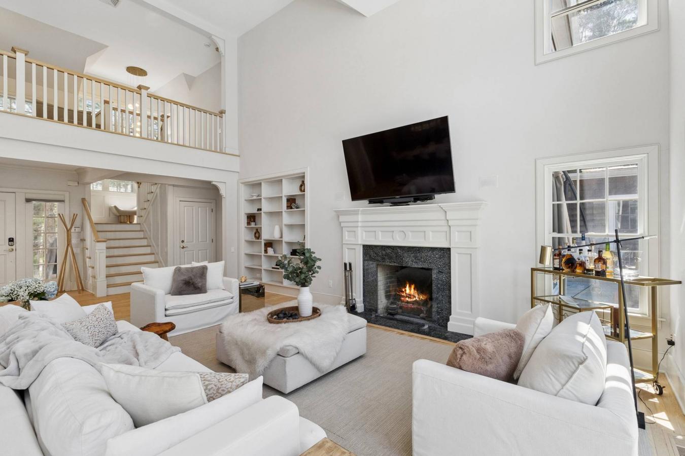 Nestled within the desirable East Hampton Springs, this fully renovated gated residence is set on /- 0.40 beautifully landscaped acres, offering a seamless blend of modern design and luxury living. The home showcases an open-concept layout enhanced by double-height ceilings and wide-plank hardwood floors throughout. At the center of the home, a spacious living and dining area is anchored by a charming wood-burning fireplace, creating a warm yet sophisticated atmosphere. The gourmet kitchen is thoughtfully appointed with light wood cabinetry, an expansive stone waterfall island with seating for four, double wall ovens, a microwave drawer, and a dedicated beverage refrigerator-perfectly designed for both everyday living and entertaining. The second floor features three well-proportioned bedrooms and two full bathrooms, offering comfortable accommodations for family and guests. The primary suite is a serene retreat, filled with natural light and complete with a walk-in closet and private balcony overlooking the lush grounds. The spa-like en suite bath features a soaking tub, separate glass-enclosed shower, and refined finishes. Additional living spaces-including a den or home office, media room, and flexible bonus room-offer exceptional versatility for guests, work, or recreation. Designed for seamless indoor-outdoor living, the propertys exterior is equally impressive. Enjoy a heated pool, outdoor shower, fully equipped outdoor kitchen, and covered dining patio-ideal for summer entertaining. The detached two-car garage is currently outfitted as a gym with a one-car space, but can be used solely as a garage, if need be. A finished lower-level with a media room, bonus room, and a full bathroom complete this exceptional offering. This East Hampton Springs residence delivers a combination of style, comfort, and resort-like amenities in one of the Hamptons most sought-after locations.