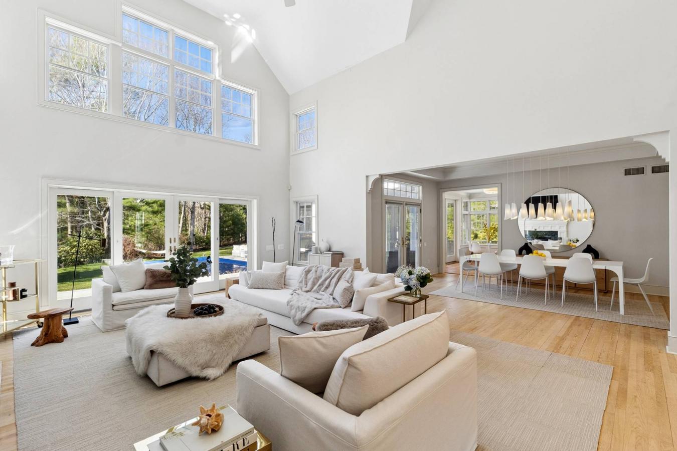 Tucked at the end of a long private driveway in East Hamptons Northwest Woods, this well-kept saltbox home offers three bedrooms, two baths, and nearly one acre of well-kept landscaped grounds. A wall of glass floods the open living, dining, and kitchen area with natural light while framing sweeping views of the expansive deck and the 18 x 36 heated pool, ideal for lounging or entertaining.