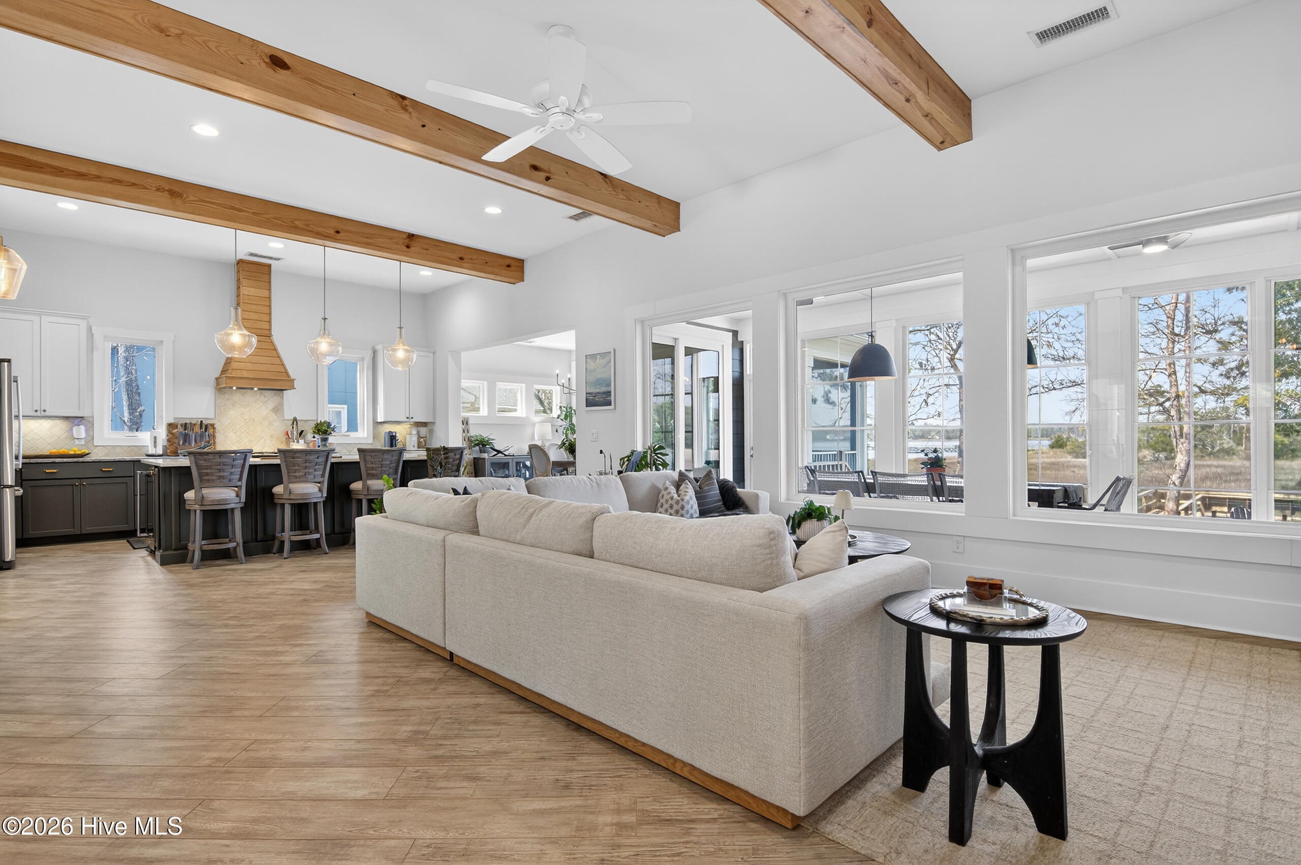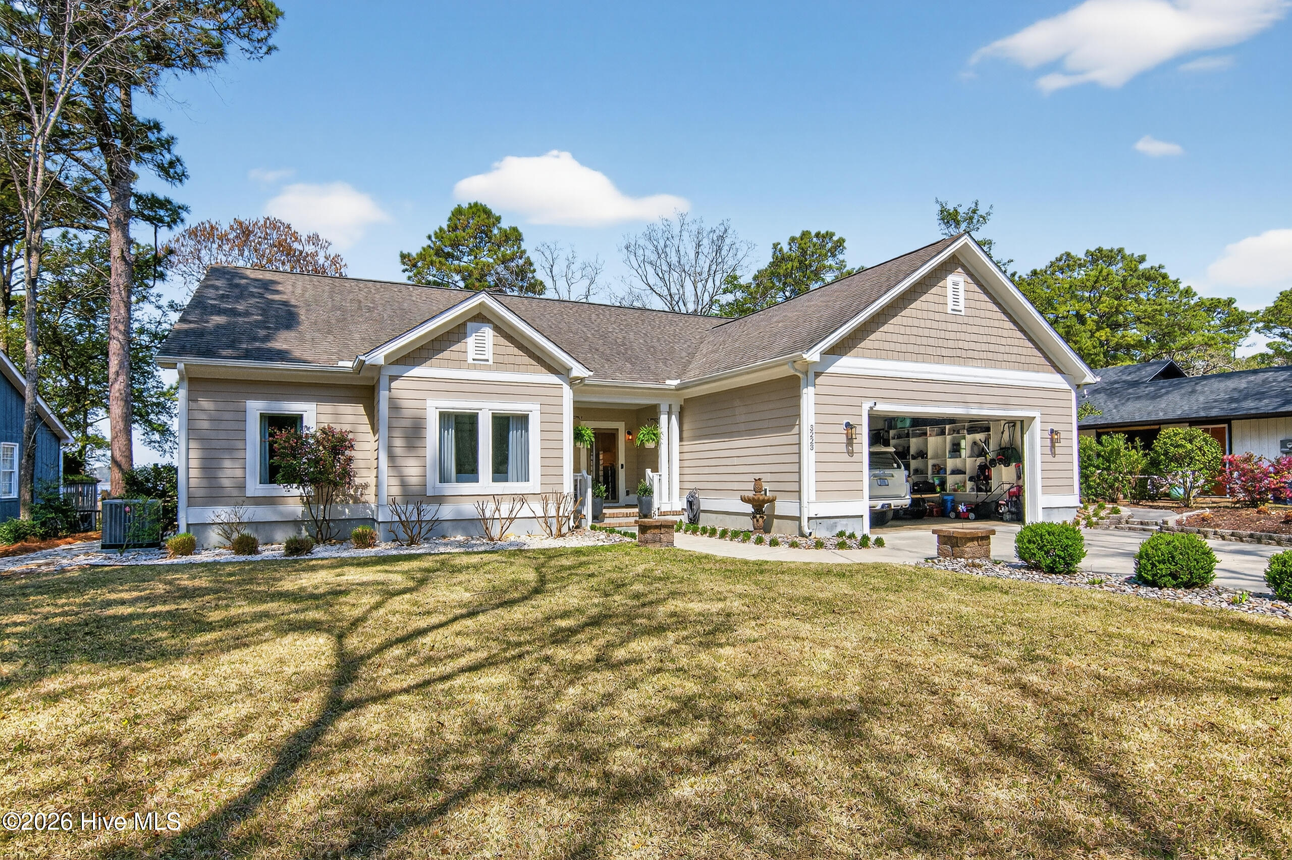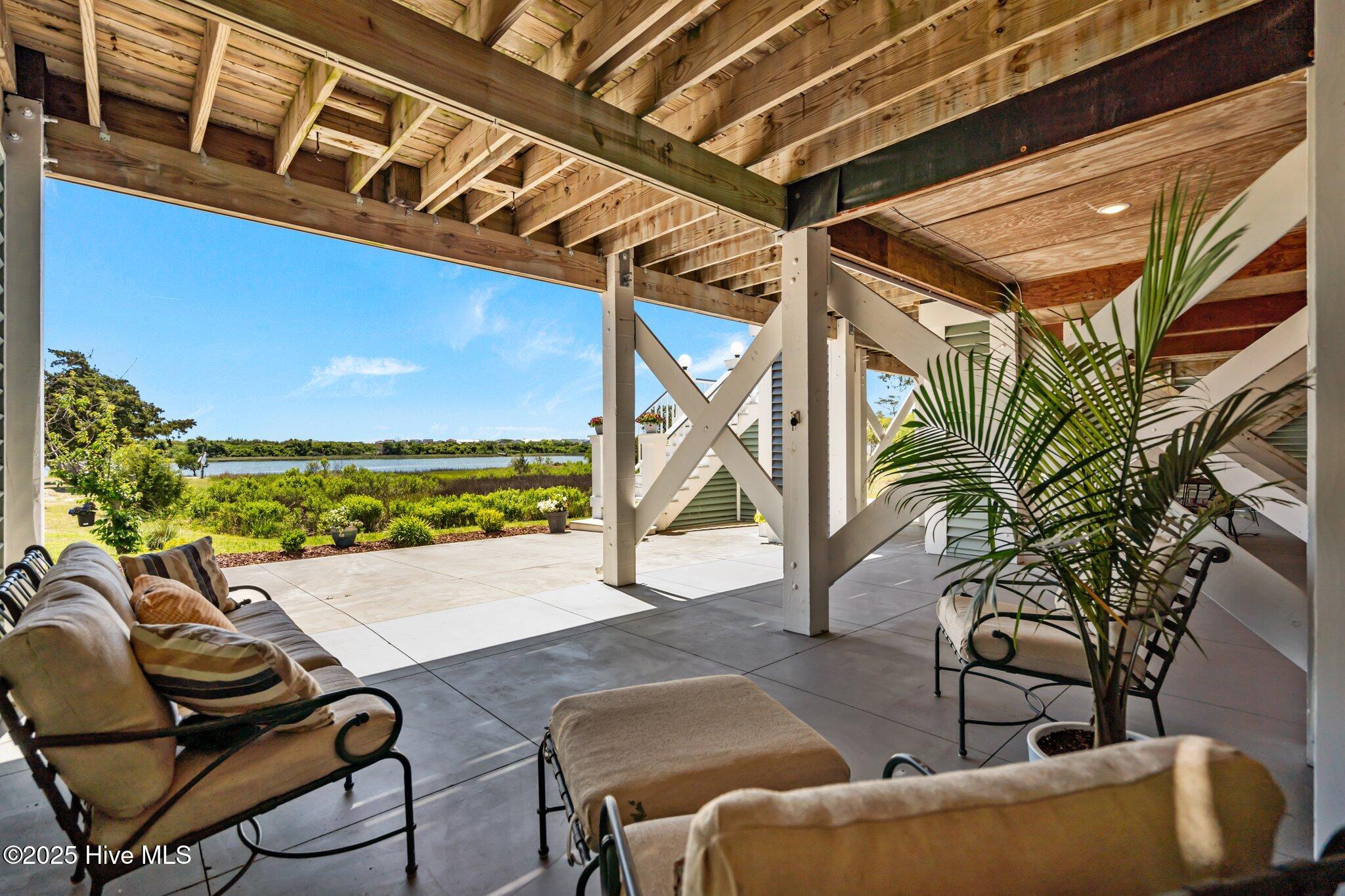 Discover this stunning waterfront luxury retreat with panoramic views of the Intracoastal Waterway, with NO HOA dues. This spacious custom home is a rare find, offering 2,653 sq ft, 3 bedrooms, 2.5 bathrooms, a versatile flex room, & countless luxury finishes centrally located to the area's best beaches & golf courses. Relax on the wraparound porch, soaking in the unobstructed views of coastal life as boats and dolphins pass by. Inside, the main living area impresses w/ coffered ceilings, luxury vinyl plank floors, & a striking gas fireplace. The stunning kitchen includes a large farmhouse sink, gas range w/ hood & pot filler, gorgeous tile backsplash, stainless steel appliances, elegant special order Quartz island, & a generous walk-in pantry. The main-floor primary suite boasts custom tray ceilings, engineered hardwood floors, a cozy sitting area, & private deck access w/ unobstructed views of the Intracoastal. The spa-like en suite features marble throughout, dual vanities, walk-in shower, soaking tub, & separate vanity room. A spacious laundry room & half bath complete the main floor. Upstairs, you'll find gorgeous LVP floors, two large bedrooms-one with a private balcony overlooking panoramic views of the ICWW, and the other offering a walk-in office or craft room. A spacious office/flex room with a wet bar & nearby full bathroom offers the perfect setup for a media room, guest suite, or entertaining space. There's also walk-in attic storage & a covered carport that fits up to 5 vehicles, golf cart, boat, or jet skis. Three enclosed spaces offer the perfect setup for a workshop, man cave, or extra storage for beach gear. Engineered and designed for peace of mind with impact-rated windows & doors throughout. Located less than 1 mile from the Sunset Harbor Boat Ramp and only a short drive to the sandy shores of Oak Island & Holden Beach. Don't miss the opportunity to own this slice of waterfront paradise-schedule your showing today!