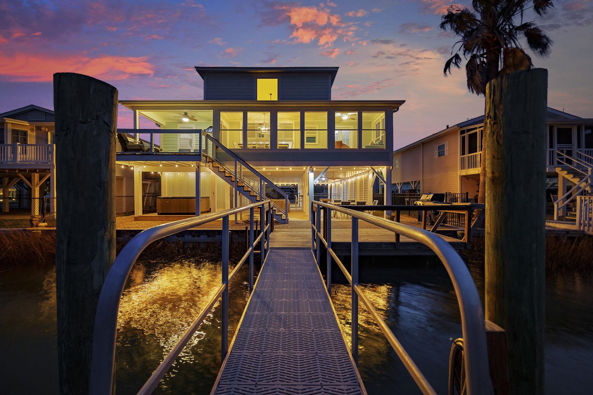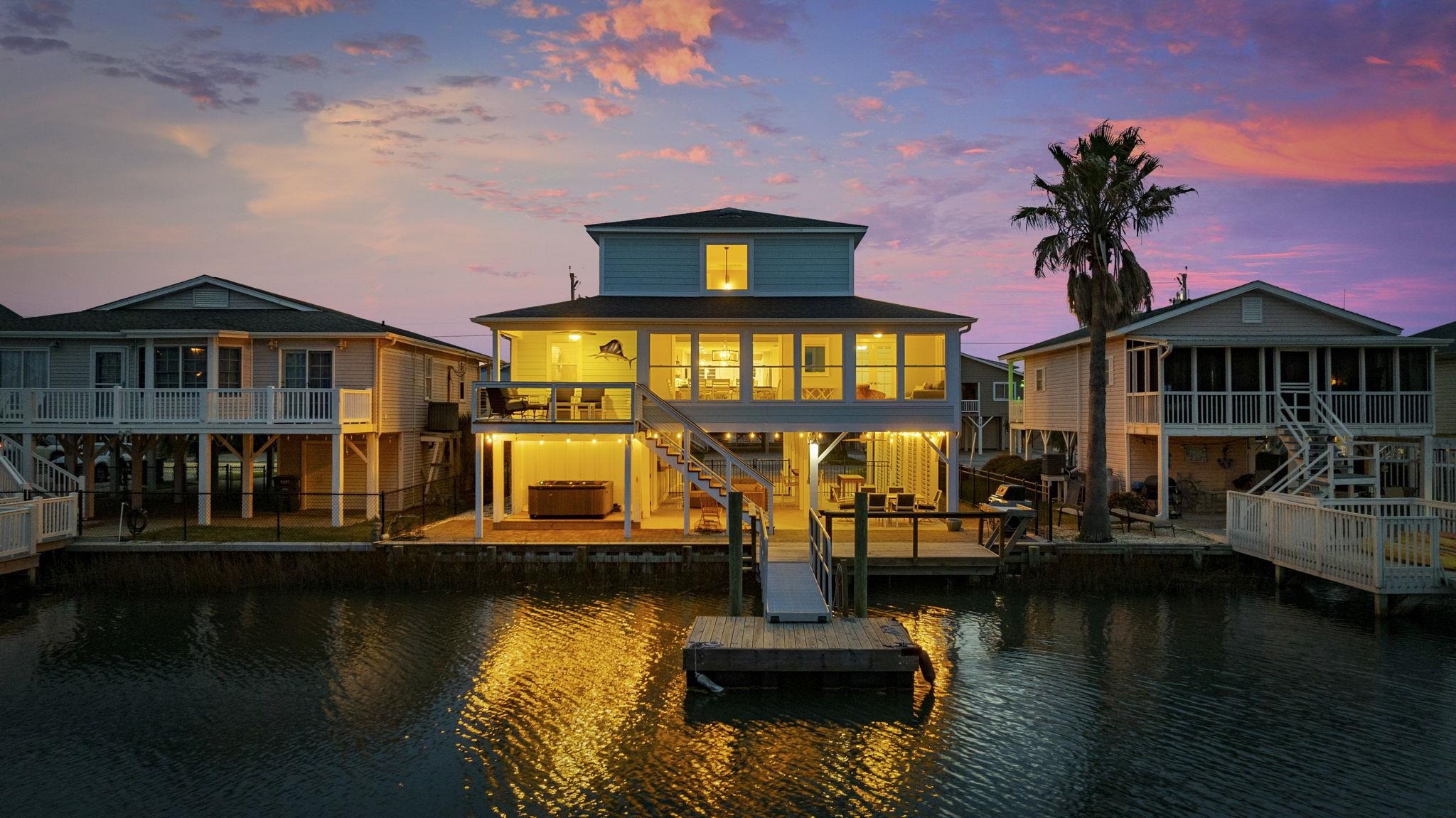 Welcome to this stunning, almost new custom built home that offers direct access to the Intracoastal Waterway and is located in a safe, protected marina setting. Situated in Marina Bay, this home features everything a buyer could want along with beautiful waterfront views of the Intracoastal and marina from the open living, dining, and kitchen area. Unlike many ICW waterfront properties, it is an easy golf cart ride to some of the most desirable beaches in North Myrtle Beach, including Tilghman Beach, and allows short term rentals! Inside, you will find beautiful engineered hardwood floors throughout the home, with tile in the bathrooms. The second floor main kitchen features quartz countertops, a large island with seating, designer lighting and backsplash, Kenmore Elite appliances with double ovens, a warming drawer, custom cabinetry with glass accents, and interior and under cabinet lighting. The spacious dining area is filled with natural light and water views. The living room includes a double tray ceiling, an electric fireplace, and French doors that open to one of two enclosed back porch Florida rooms, both featuring vinyl windows, screens, and built in shade options for comfortable outdoor TV viewing. The porch floors are Trex and finished with indoor outdoor carpeting. The primary suite features double tray ceilings, separate his and hers closets, private French doors leading to the balcony, and an ensuite bath with dual vanities, a soaking tub, and a separate shower. This five bedroom, three and a half bath home also includes a second living area on the first floor with its own full kitchen, granite countertops, a large island with seating, living room, two bedrooms, and a full bath, making it ideal for a mother in law suite or rental opportunity. This level also includes a second enclosed porch that leads to the pool. An elevator provides convenient access between floors. The backyard is a true oasis with a heated and chilled pool, a spa, a summer kitchen with a high end Blaze grill, refrigerator, and sink with hot and cold water, as well as a fire pit. Beyond the fenced pool area, there is an additional patio with a hammock, palm trees, and seating, perfectly positioned for sunset views and enjoying music from nearby waterfront restaurants. The outdoor space also features custom pavers, landscape lighting, and a full irrigation system. The home has a metal roof, and a custom canine grass area with an advanced drainage and cleaning system has been installed beside the pool. One garage is designed to accommodate a golf cart, while the other includes a large separate storage room. The neighborhood offers overflow parking and provides special parking passes for owners boats, cars, and golf carts at the adjacent waterfront restaurants. With its charming resort style colors and decor, this home creates a relaxed coastal atmosphere. This is a rare opportunity you do not want to miss. Schedule your showing now!