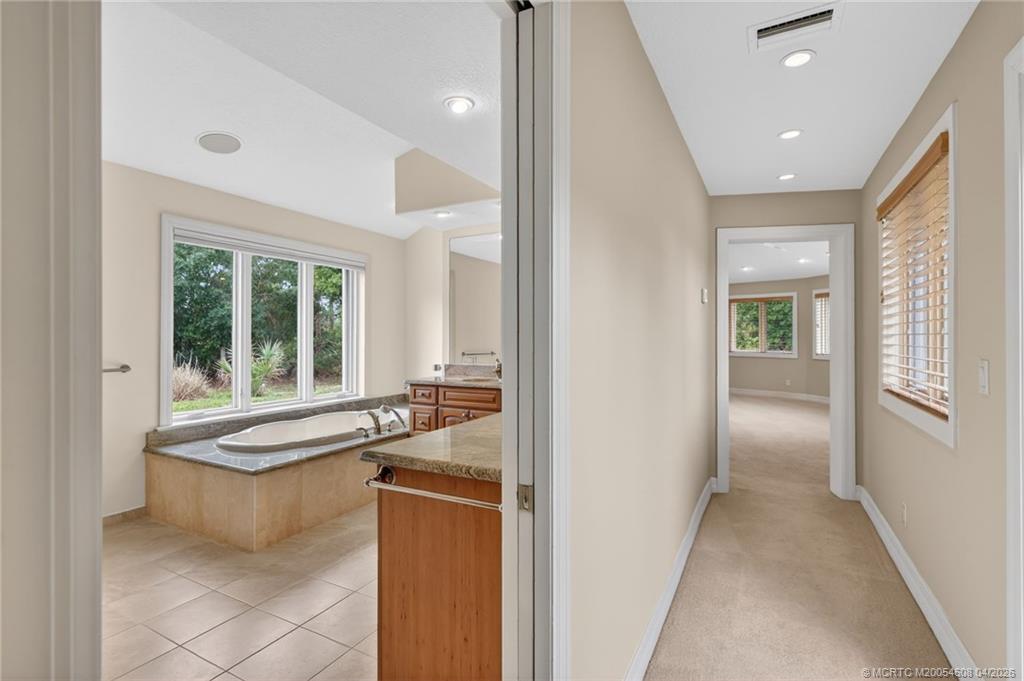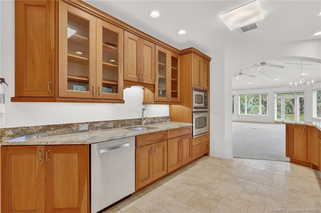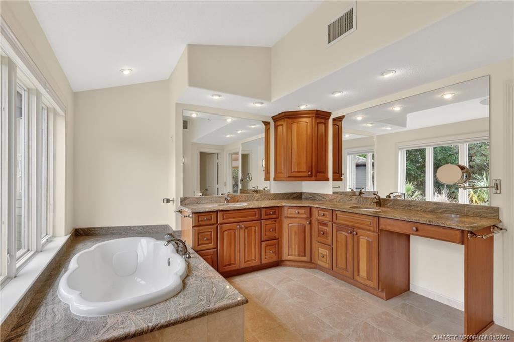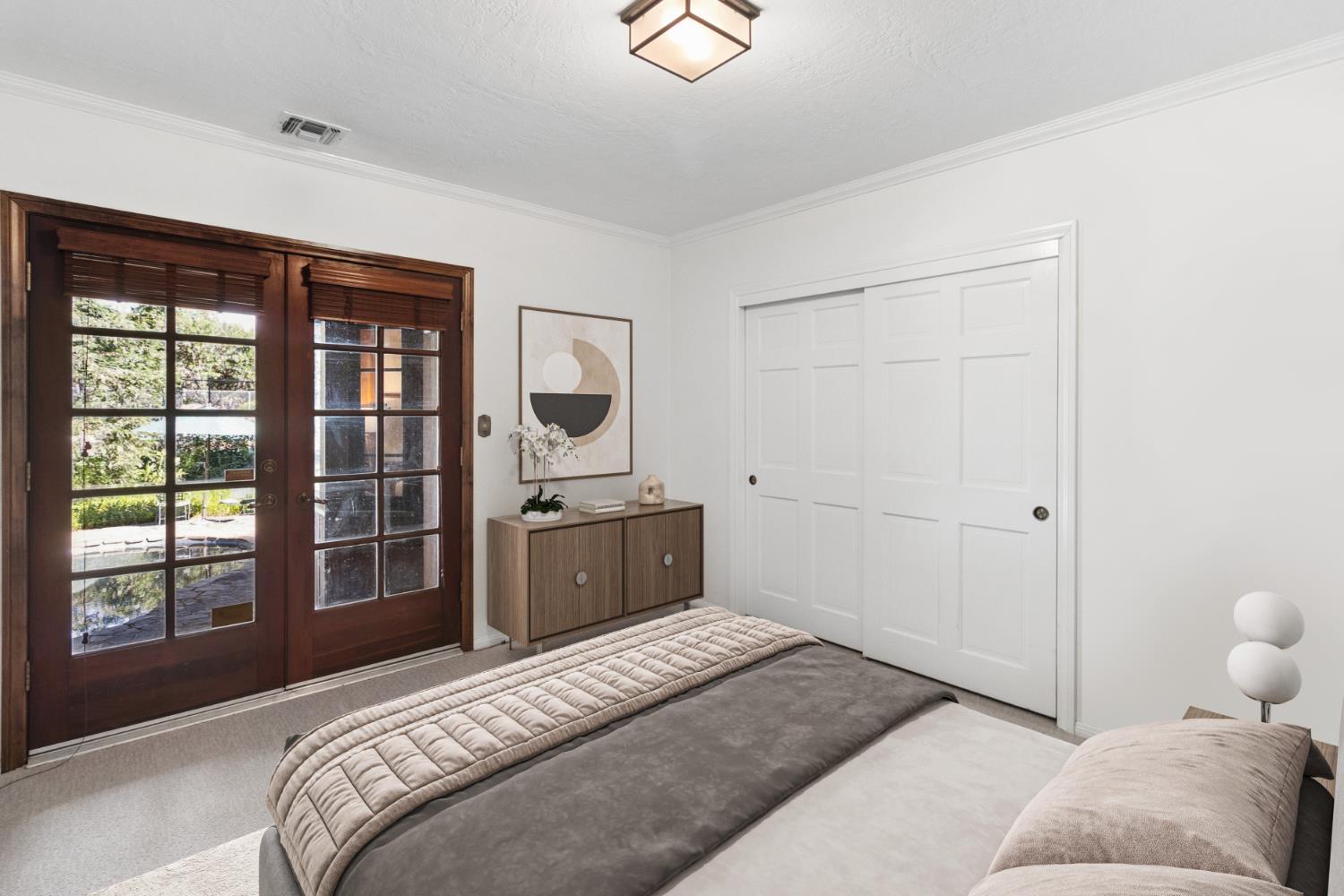La Playa The beach. This home offers a hint of timeless coastal Cape Cod style with gabled rooflines, shingle accents, and subtle arches, blended with a touch of California transitional design. A curved driveway, three-car garage, and mature landscaping frame this custom home set on a 10,000 sq ft lot in premiere Lake Alhambra Estates. Floor-to-ceiling windows create a dramatic two-story entry with 19-foot ceilings and fill the home with natural light. Don Fouts signature millwork is evident throughout, including an elegant staircase banister, wainscoting in the formal space, raised panel doors, and wood-trimmed windows with transom lights. The formal dining room is illuminated by a custom Italian chandelier, while new flooring softens the space and adds a feeling of comfort and ease. From the moment you walk in, this home captivates. The kitchen opens to the main common areas and is highlighted by a backdrop of curved windows, creating an inviting space for gathering and everyday living. The family room is spacious yet cozy with a corner-set bookcase and the fireplace/mantel as a focal point. The kitchen includes Bosch appliances, LG refrigerator, beverage refrigerator, and pantry. Three sets of eight-foot Andersen French doors provide access to the covered patio and private backyard from multiple areas. Enjoy the newly resurfaced pool (2025) year-round thanks to solar heating. The grounds are thoughtfully landscaped with mature trees including weeping birch, sycamore, and redwood, along with a rock sitting wall, grapefruit tree, strawberry patch, and grapevines. The primary suite is located on the main level and offers privacy - - or views of the pool and garden if preferred. The ensuite bath was recently re-designed with Carrara tile, an oversized soaking tub, separate shower, and a large closet with a window. A remote ground floor bedroom and full bath provide flexibility for guests or multigenerational living. The second story includes two bedrooms, a dedicated office (or optional fourth bedroom), full bath, and a large multi-use room. Additional features include a fireplace in the family room, energy-efficient lighting throughout, generous attic storage, and updated dual HVAC systems. This home has been meticulously maintained. Ideally located on a quiet street near bike paths and greenbelts, with close proximity to La Playa Park, Mace Ranch Regional Park, Korematsu Elementary, Harper Jr. High, and shopping.