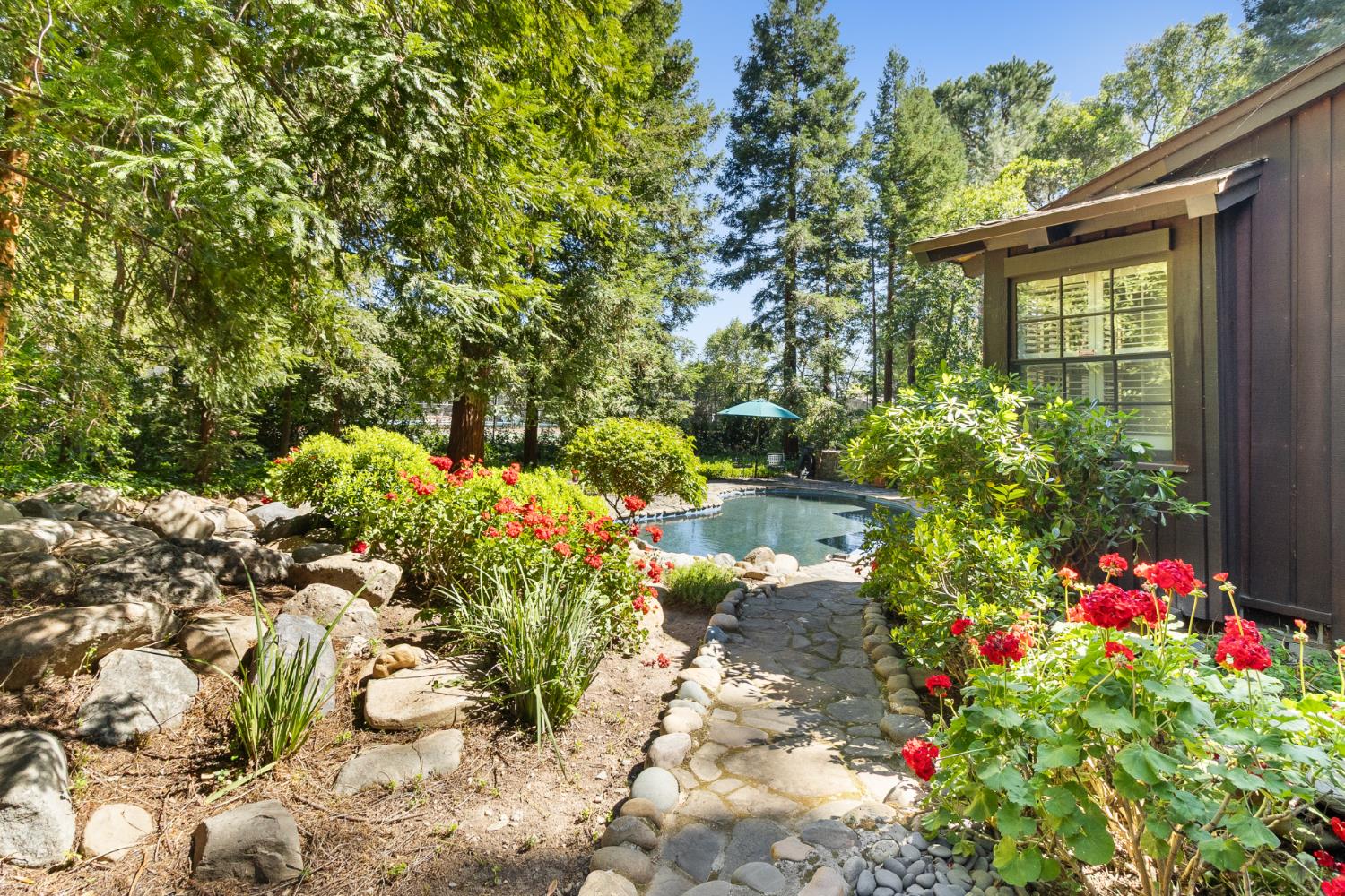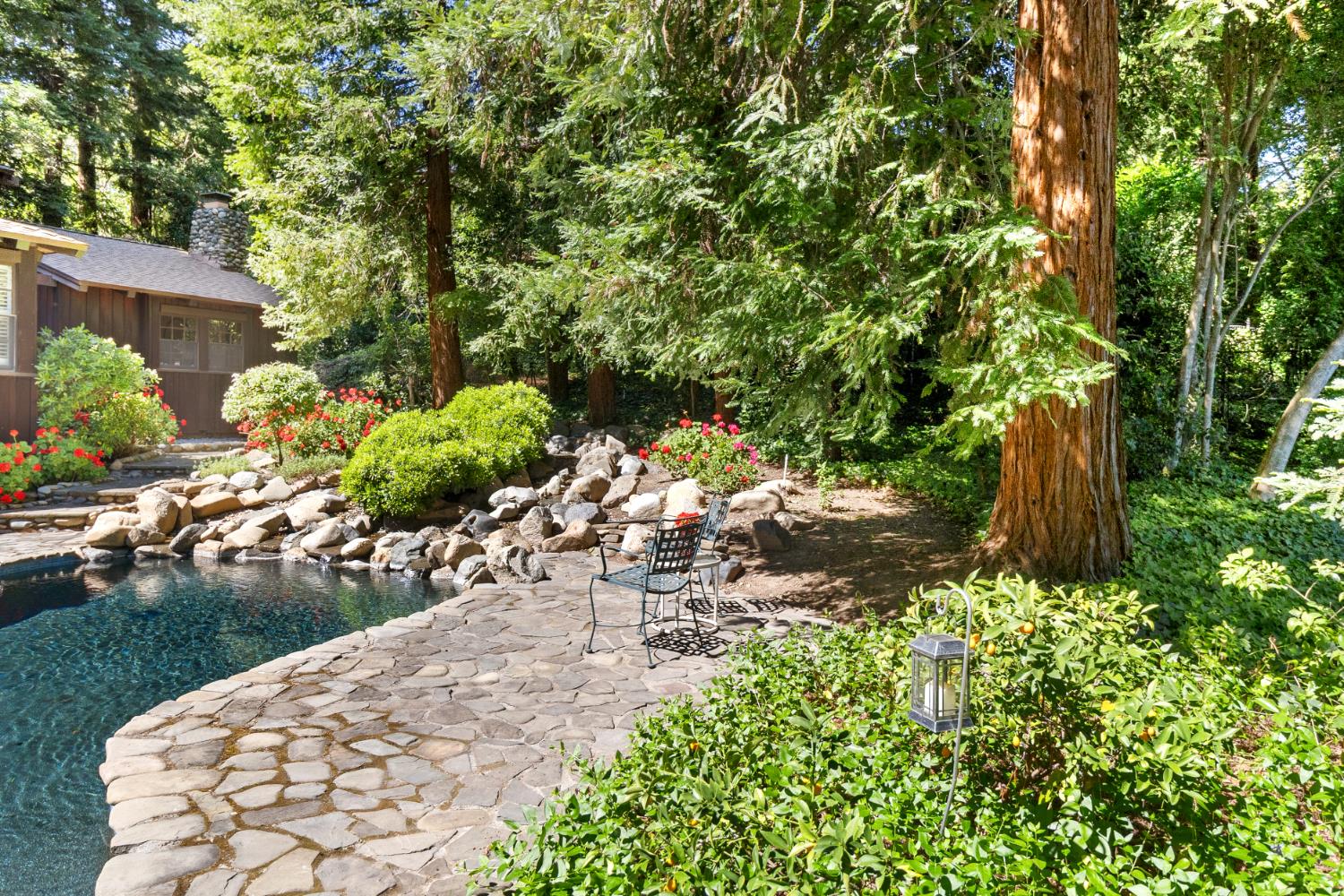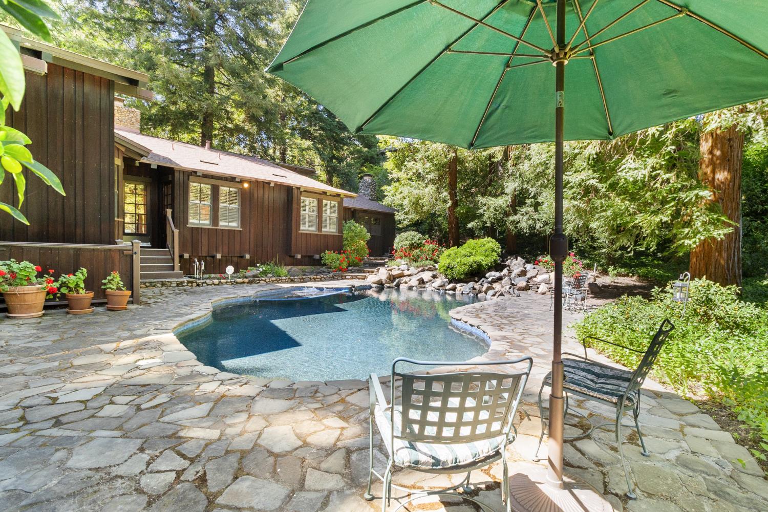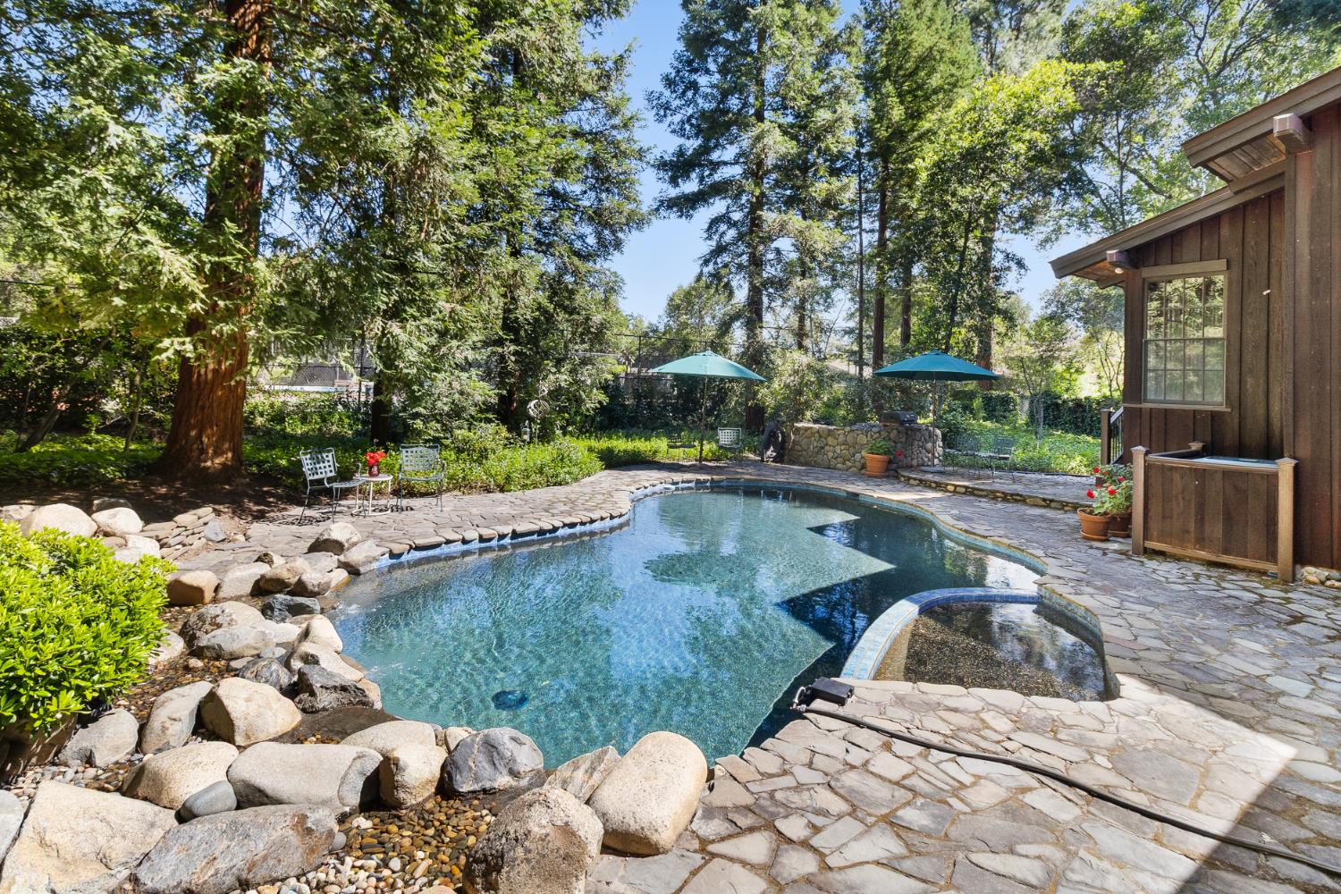 Magnificent custom Sea Ranch style redwood home built in 1978 and brought to market for the first time! Its on a large .44 acre lot surrounded by a forest of 40 majestic full grown redwood trees just 2 doors from the American River at Sarah Park. The original owners have lovingly cared for this treasure for 47 years. To say that its breathtaking is an understatement! You wont find a home as unique and sensational in the region. Its constructed of redwood; clear heart redwood board on board, random width for the entire exterior and the interiors are clear heart Canadian Cedar all random width boards. The open concept light filled great room has soaring vaulted ceilings with exposed solid wood beams, fabulous Mullin windows, a massive 7000 used brick fireplace wall, Saltillo tile floors and hardwood floors. An English library is adjoining the great room and features Oak and Birch panned walls and book shelves plus another fireplace. A large Primary suite has another fireplace, 2 closets, dual vanities and exercise room with river rock walled walk-in shower. The nature filled backyard has a large free form pebble tech pool resurfaced in 2020 with soothing stream waterfalls into the pool. There is plenty of room for your imagination to utilize the beautiful lot to your specific desire. All TREX decking around the home was completed in 2018 and the new Presidential composition roof was installed in 2021. The manual gated entry leads to a circular driveway and 3 car garage. Shall we just say, it should be a Sunset Magazine Home?
