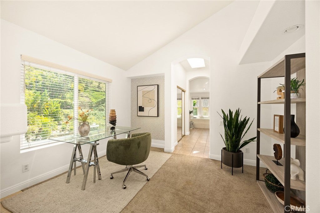 Beautifully UPGRADED 3-bed/2-bath home offers privacy, lush, landscaped grounds & seamless INDOOR-OUTDOOR living. Move-in-ready SINGLE LEVEL on a CORNER LOT has beautiful VAULTED CEILINGS, open flr plan, sparkling POOL, SPLIT AC, new paint, security alarm & custom closets. Enjoy 3 outdoor spaces: LARGE dining patio, COVERED entry lounge & quiet seating area off living.