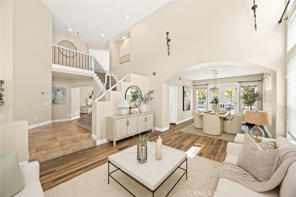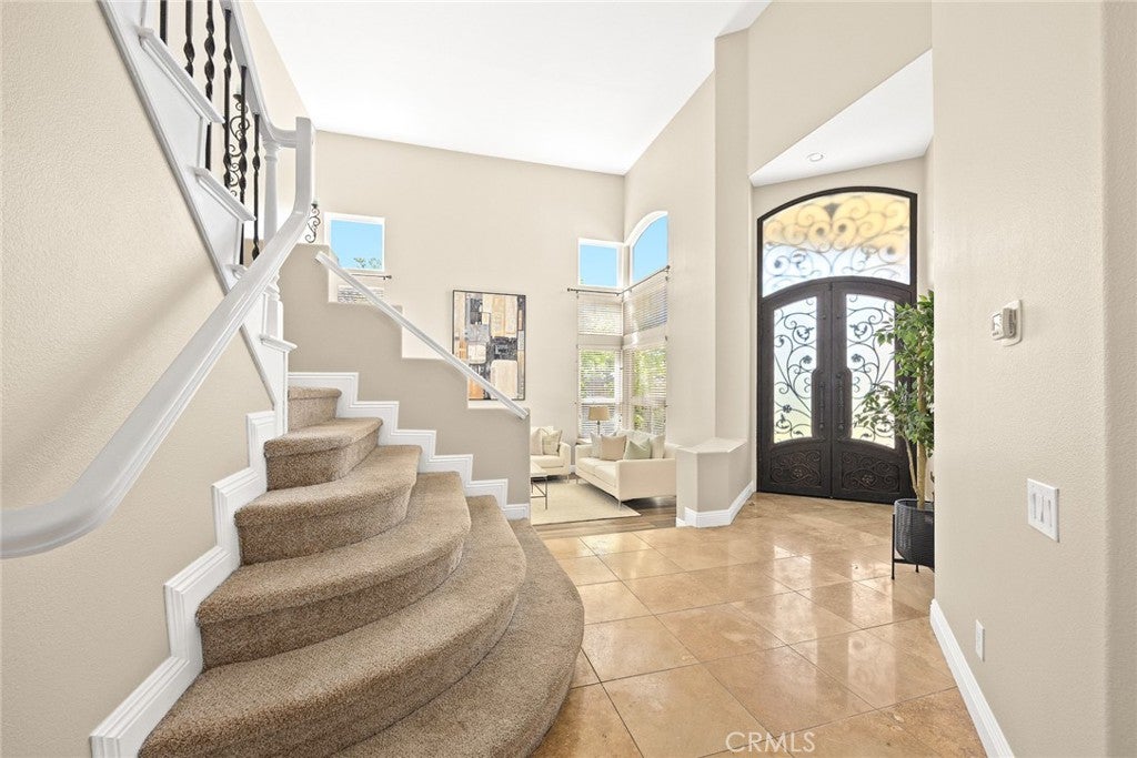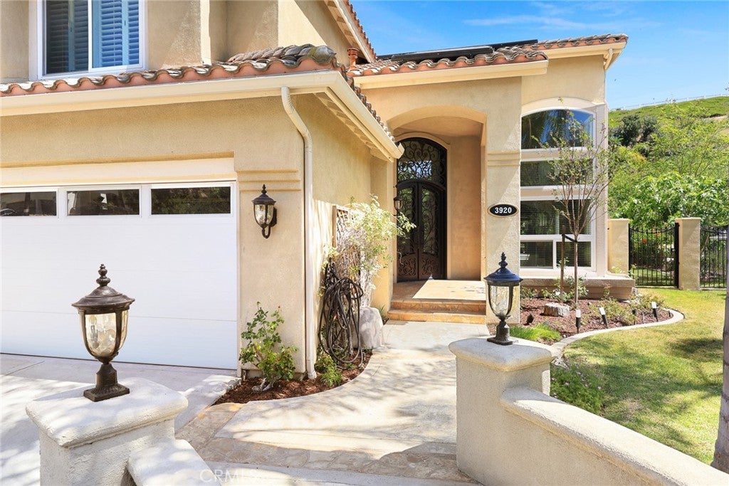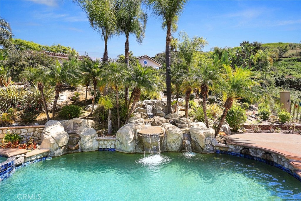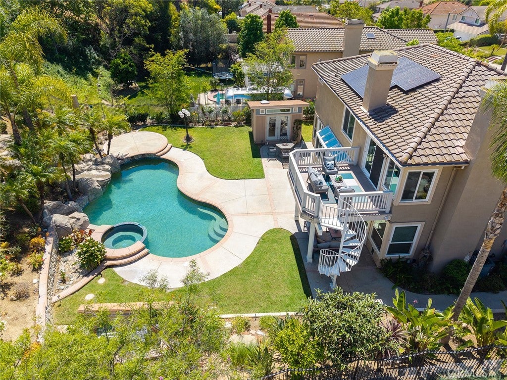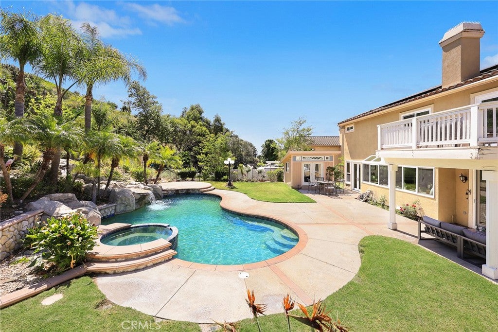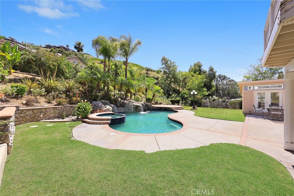 Nestled on one of Yorba Lindas most picturesque streets, this stunning 5-bedroom, 3.5-bath pool and spa residence offers the perfect blend of elegance, comfort, and resort-style living. From its exceptional curb appeal to the breathtaking backyard, every detail is designed to impress.Step through custom iron and natural wood double doors into a dramatic cathedral-ceiling living room, where soaring ceilings, rich wood flooring, and stone accents create a grand first impression. The formal dining room flows seamlessly to the outdoors, capturing serene views of the lush landscaping and sparkling pool.The gourmet kitchen is both stylish and functional, featuring granite countertops, a large center island, walk-in pantry, and expansive windows that flood the space with natural light while framing tranquil views of cascading waterfalls. Open to the kitchen, the inviting family room offers a cozy gas fireplace, custom French doors, and direct access to the backyardperfect for effortless indoor-outdoor living.A highly desirable main-level ensuite bedroom, along with a guest powder room, provides ideal flexibility for guests or multi-generational living.Upstairs, the luxurious primary suite serves as a private retreat, complete with a balcony overlooking the resort-style backyard, a dual-sided fireplace shared with a sitting area, two walk-in closets, and a spa-inspired bath featuring a jetted tub, separate shower, and dual vanities. Additional bedrooms include two connected by a Jack-and-Jill bathroom, plus another bedroom and full bath.The backyard is a true showpiecea tropical oasis featuring a sparkling pool and spa, cascading waterfalls, fire features, and beautifully landscaped grounds with ambient lighting. Multiple French doors, sliders, and expansive windows throughout the home create a seamless connection between indoor and outdoor spaces, making it an entertainers dream.Additional highlights include double-pane windows and doors, solar panels, and a versatile he/she shed ideal for a studio, workspace, or hobbies.Located within the highly sought-after Yorba Linda High School boundary, this exceptional home truly offers the best of luxury living.Look no furtherthis is the home youve been waiting for.