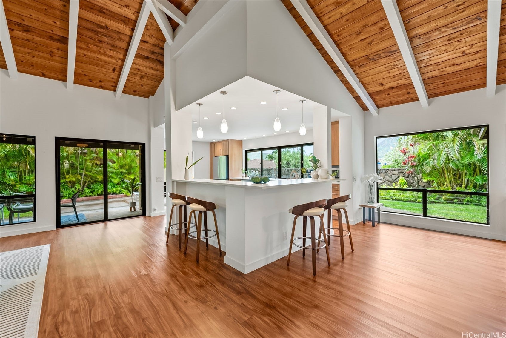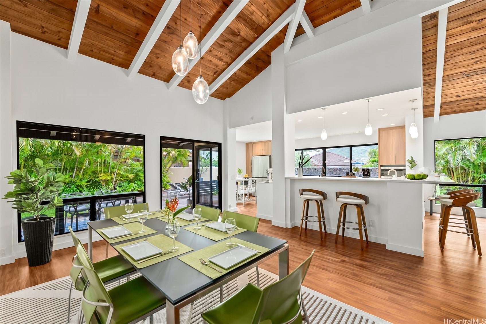 Beautifully UPGRADED 3-bed/2-bath home offers privacy, lush, landscaped grounds & seamless INDOOR-OUTDOOR living. Move-in-ready SINGLE LEVEL on a CORNER LOT has beautiful VAULTED CEILINGS, open flr plan, sparkling POOL, SPLIT AC, new paint, security alarm & custom closets. Enjoy 3 outdoor spaces: LARGE dining patio, COVERED entry lounge & quiet seating area off living. Take in Koko Head views & STUNNING sunrise light! Owned 18 SOLAR PV, w/2 BATTERY WALLS adds efficiency & savings. Sought after Anchorage neighborhood w/private park, this home blends warmth, charm & island living at its finest.