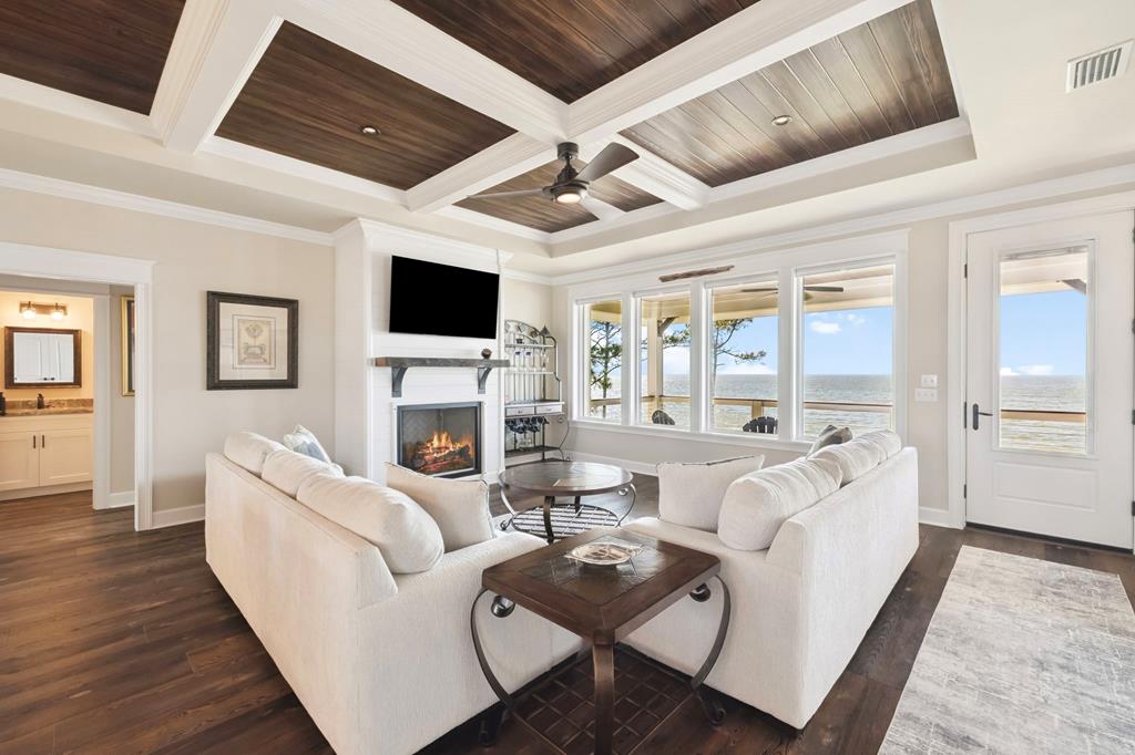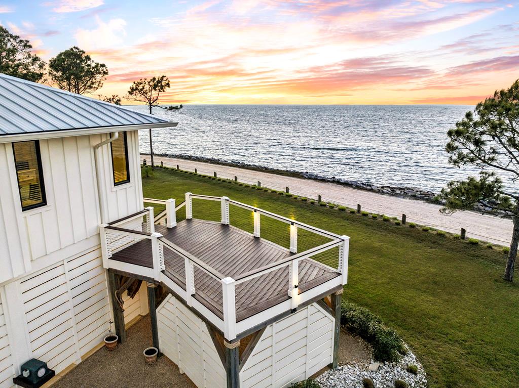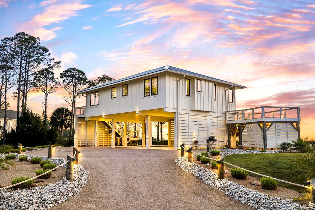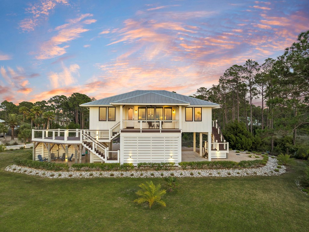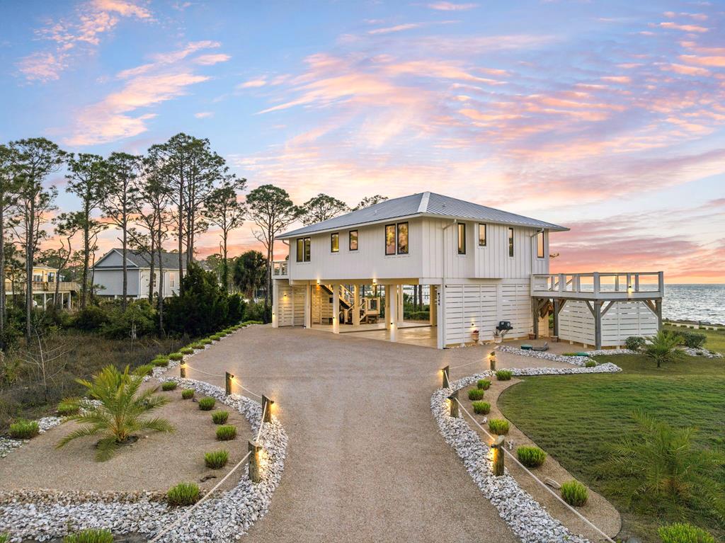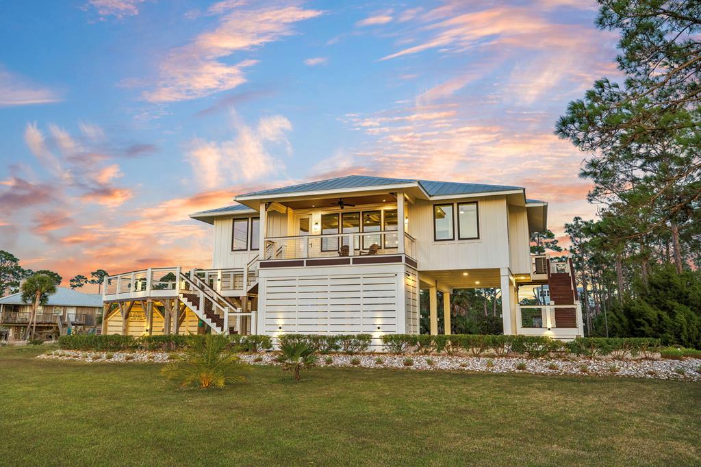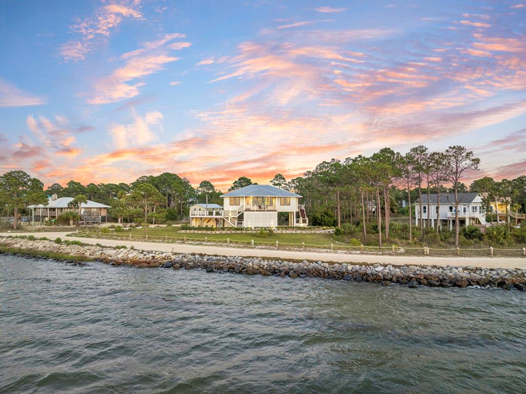 A home where the water always takes center stage. This 2022 custom-built island residence offers the best Apalachicola Bay sunsets, year-round. Positioned for unobstructed western views, it captures glowing sunrises and moonsets. Oversized 3x6 hurricane rated casement windows frame the bay from nearly every room, blending protection, energy efficiency, and beauty. Inside, the open great room showcases coffered ceilings w/ stained pine inlay and crown molding adding rich dimension, while a ship lapped gas fireplace anchors the space with a live edge cypress mantle milled from Apalachicola River wood. The custom kitchen is a chefs delight, featuring maple cabinetry to the ceiling, seamless Brazilian granite counters, a large eat in island, 5 burner gas cooktop, ZLINE hood, and dual smart ovens - one an Advantium for speed and versatility. Two bay facing primary suites showcase private baths and sweeping views; a third bedroom and flex space add comfort for guests or an office. Every finish feels considered - wide plank LVP flooring, recessed dimmable lighting, and whisper quiet soundproof insulation. Built for longevity and health, the home includes steel ductwork, a full HALO air purification and dehumidification system, Purple Board drywall, attic spray foam insulation, and a 500 gal propane powered whole home generator. Outdoor living flows effortlessly with TimberTech decking, stainless cable railings, and a covered ground level retreat perfect for sunset cocktails. Additional highlights include Blueskin water barrier exterior, a 12 zone Rainbird irrigation system, and ample storage. Adjacent parcels are available, offering control of sightlines and the option to expand. Kayak from your shoreline into world class fishing waters or take a short golf cart ride - just a half mile south - to the soft white sands of the Gulf. This is island living refined: panoramic views, enduring quality, and easy elegance - crafted for those who want their waterfront dream to last.