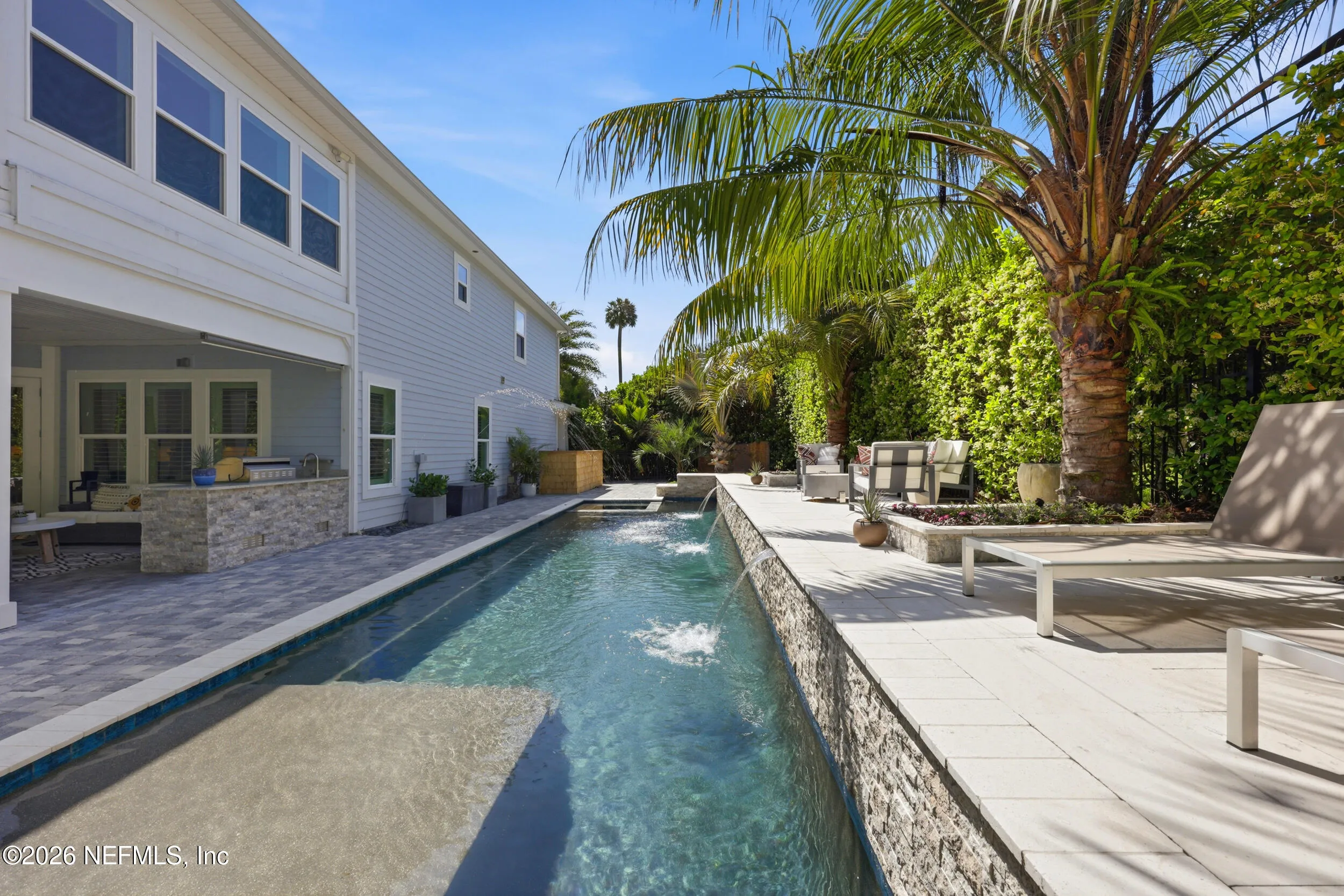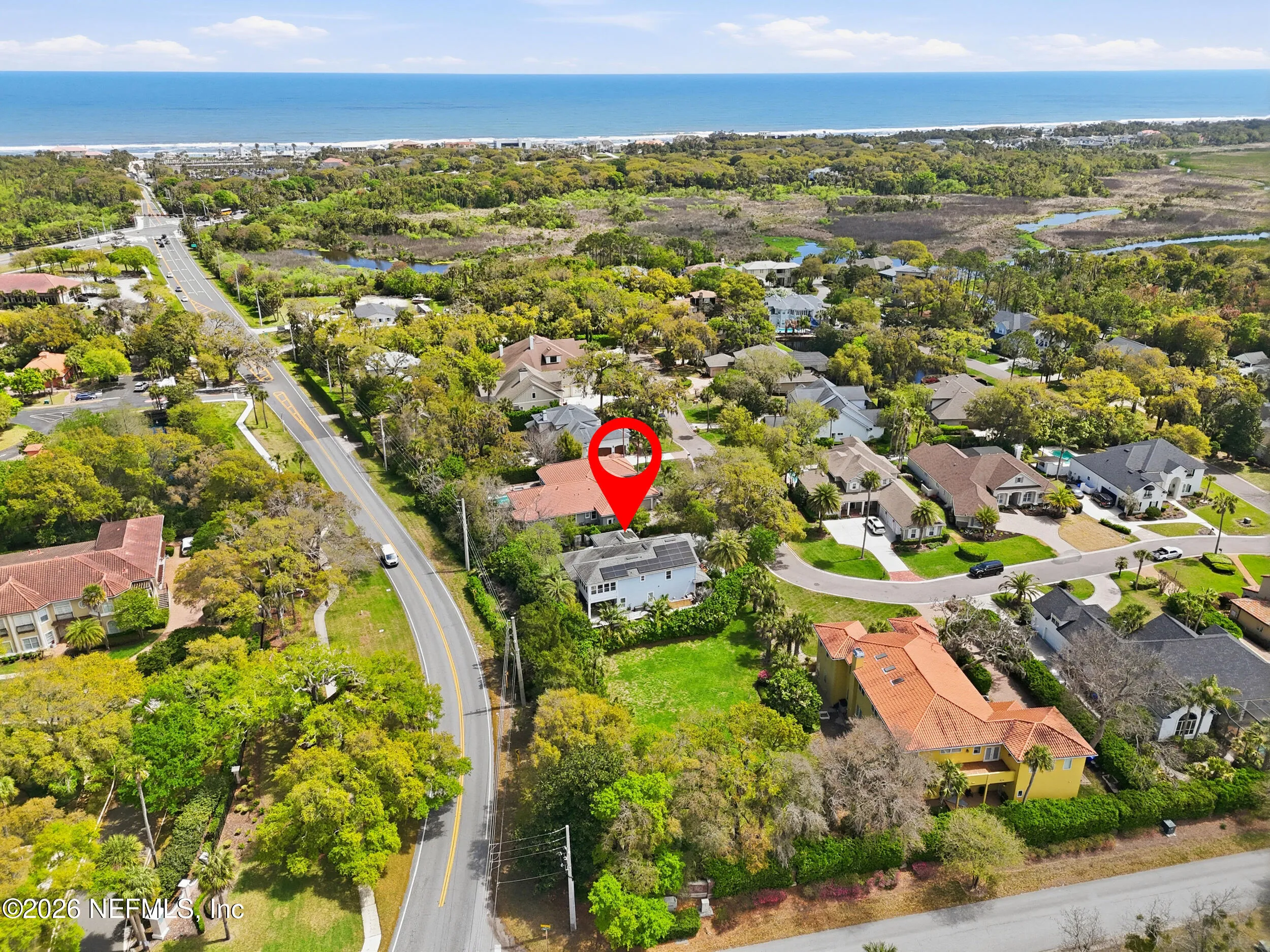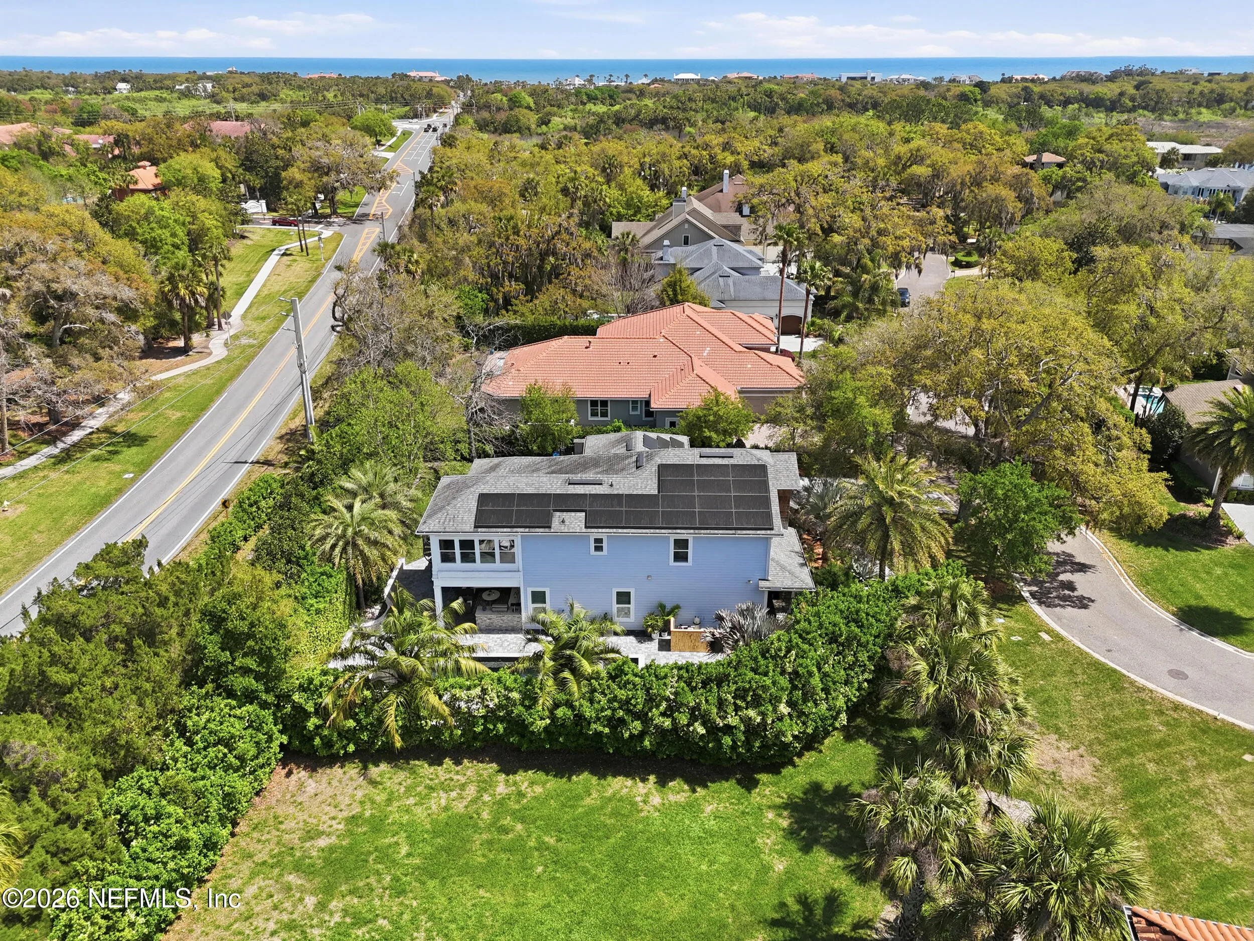 Luxury coastal living meets unmatched lifestyle amenities in this 2018-built home in a neighborhood known to locals as a hidden gem. Featuring hurricane impact glass windows and spray foam insulation, this energy-efficient property is fully powered by Tesla solar panels, delivering zero electricity or gas bills, while natural gas service powers all gas appliances, including pool equipment. Enjoy a rare 55-foot lap pool and a private backyard oasis perfect for relaxing or entertaining. Take advantage of exclusive access to a private kayak launch to the scenic Guana Preserve, ideal for outdoor enthusiasts. Step out your back gate and walk less than half a mile to Micklers Beach for daily ocean breezes and sunsets. Inside, an open floor plan, abundant natural light, and spacious living areas create a seamless flow for modern living. Located near top-rated St. Johns County schools, this home defines the ultimate Ponte Vedra Beach lifestyle.