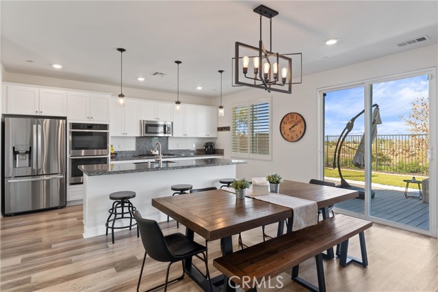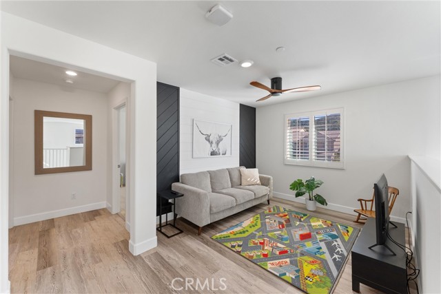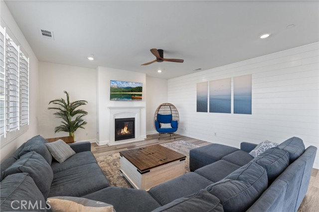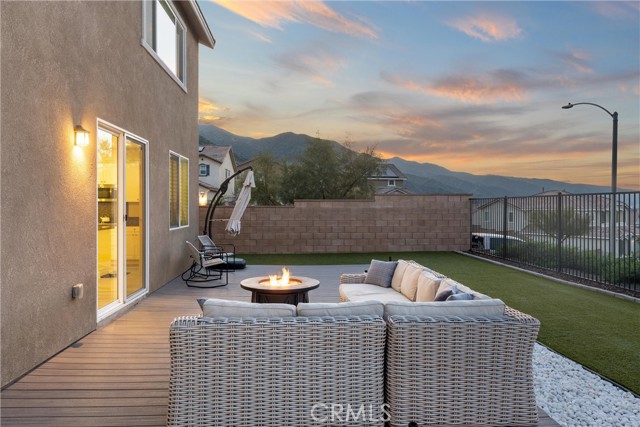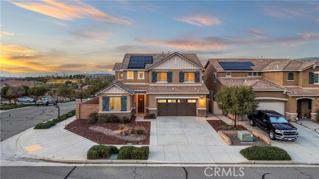 Introducing a residence where modern design, thoughtful upgrades, and unforgettable VIEWS create an exceptional living experience in the Sycamore Creek community. Set on a prime elevated corner lot with only one neighbor next to you this 4-bedroom, 3-bath home immediately impresses with its curated finishes—luxury vinyl plank flooring, detailed millwork, designer lighting, shutters, and upgraded baseboards. The heart of the home is a bright, inviting kitchen featuring island seating, a gas range, dual ovens, walk-in pantry, and effortless flow to the backyard through sliding glass doors. Step outside to enjoy Trex decking, custom turf, and sweeping mountain and canyon scenery—a perfect setting for quiet mornings or weekend gatherings. Inside, soaring ceilings rise nearly 20 feet, leading to an upstairs loft ideal for media, lounging, or play. A spacious laundry room with upgraded tile and generous storage sits near two secondary bedrooms and a full bath. The primary suite captures the homes best views and includes a custom accent wall, dual sinks, makeup vanity, soaking tub, walk-in shower, and a large closet. An oversized garage provides room for large vehicles, tools, storage, and more. Energy-efficient features include solar panels, a tankless water heater, and a whole-house fan. Residents enjoy premier community amenities: pools, splash pad, fitness center, sports courts, dog park, and just around the corner you have access to the Deleo Regional Park which features a skate park, BMX track, trails, multiple parks, tennis & pickleball courts—all just minutes from shopping, dining, schools, and freeway access. A truly standout offering in the hidden gem of Sycamore Creek.