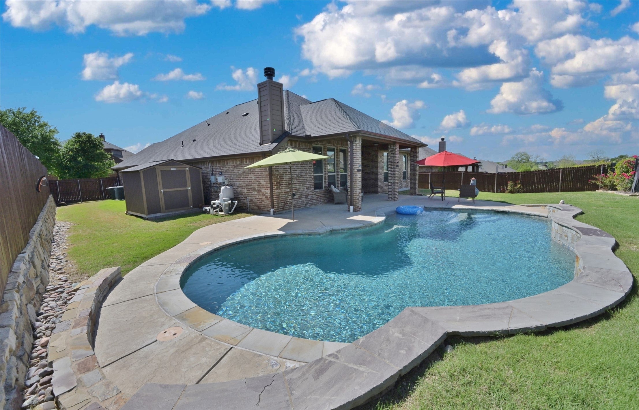 IMPECCABLE Midlothian, Texas 4 BEDROOM, 3 FULL BATH HOME with beautiful IN-GROUND POOL, water feature and extended pool lounging area in the highly sought after Community of Lawson Farms!! NEW 10K PRICE REDUCTION!! Less than one mile from the amazing 105 acre Midlothian Community Park with walking trails, sports fields and endless outdoor recreation! LOADED with UPGRADES and custom detail. HAIL IMPACT RESISTANT ROOF installed Oct 2025! This home offers a gorgeous modern open concept floorplan with front 4th guest Bedroom and joining full bath, optional in-home office. Large Chefs Kitchen with granite countertops, Island, wide four seat breakfast bar, an abundance of elegant cabinets with pulls, stainless steel appliances, deep under mount sink, sky light, walk-in Pantry and magnetic wall writing note board. Upgraded faucet, stove top hood, counter and dining lighting. Spacious living with cast stone surround fireplace, extensive wood look tile and fresh interior paint. New plush carpet and pad in all bedrooms and media room with board & batten in entry way and guest bathroom. Overhead cabinets in all bathrooms, new lighting in guest bathroom and ceiling fans throughout. Nice split bedroom floorplan with large Owners bedroom, en-suite bath with two sink vanity, oversized seated shower, garden tub and double racked walk-in closet with built-in storage bins. Brick and stone front elevation, gutters, desert sand landscaping, stone lined tree and landscaping borders, sprinkler system with updated sensor and security lights. Large fenced backyard with two side yards, seasonal flowers, wood and stone privacy fence and rear iron fence with gate opening to greenbelt walk thru and park access. 8x8 Tuff Shed storage building (painted to match House), swimming pool with new 3.0 pool remote, beach entry and more! Community pool, pond, walking trails and park access with retail, restaurants and activities near by. Schedule your showing to view this lovely home today!