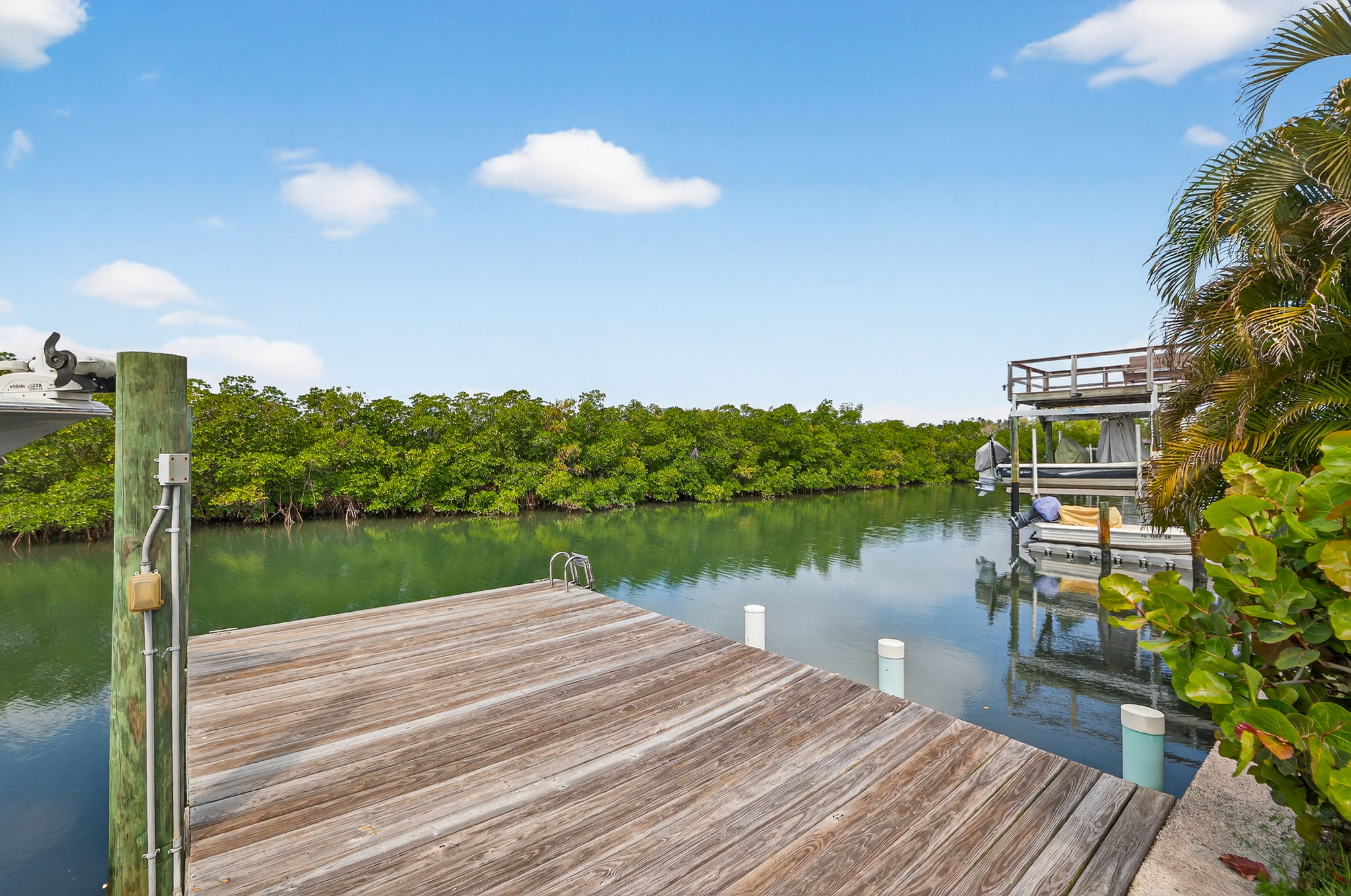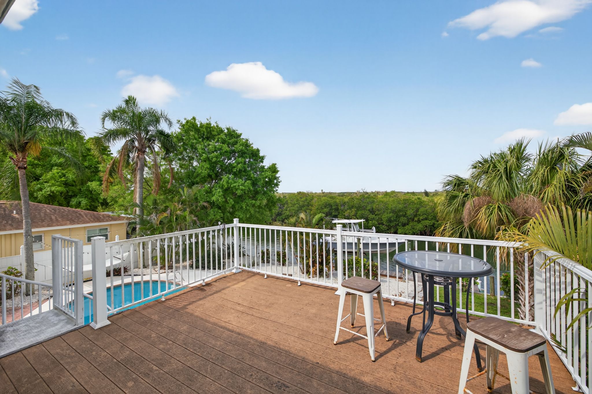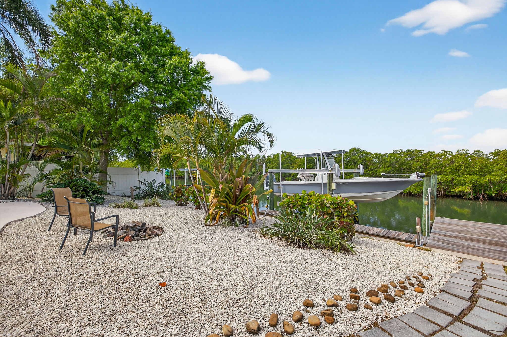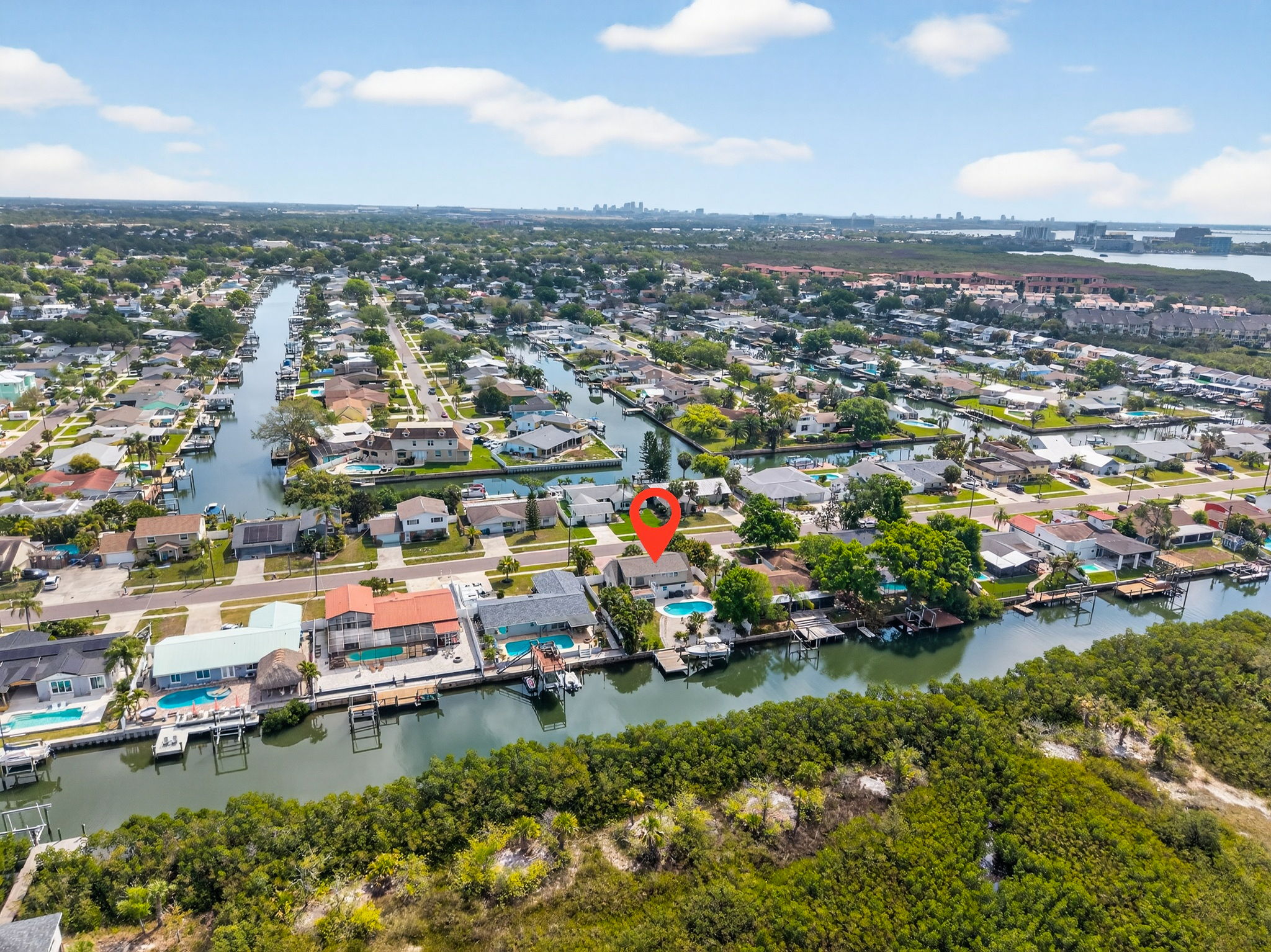 Welcome to this stunning waterfront property overlooking the main canal of Tampa’s Bay Crest Park, offering breathtaking sunsets from the owner’s retreat, private balcony, and back porch. This home features three generously sized bedrooms, along with a dedicated office space off the primary bedroom (which could be converted into a fourth bedroom), two full baths, one half bath, a sparkling pool, boat lift, two-car garage, and a fenced yard. Upon entry, you’re immediately drawn to the beach cottage vibe with coastal luxury vinyl flooring, an open layout, and a stunning kitchen overlooking the waterfront oasis. The kitchen is a true focal point, thoughtfully designed with a six-burner KitchenAid gas range with dual ovens, stainless steel microwave and dishwasher, and extensive custom cabinetry with soft -close drawers. The oversized island provides seating as well as additional storage, with cabinetry on both sides. A beautiful wood hood, decorative shelving, and a subway tile backsplash extending to the ceiling add character, while quartz countertops and a shiplap ceiling complete the space. Updated lighting and fixtures further elevate the design. The kitchen is open to the family room, with a separate dining room located toward the rear of the home featuring additional cabinetry and a dry bar area. Upstairs, you’ll find all bedrooms along with the office, which is connected to the primary suite. Wood flooring runs throughout the upper level, and the bathrooms have been tastefully updated. The primary suite is a rare oversized room for this neighborhood, and the spa-like bathroom includes dual sinks, decorative tile flooring, and access to a private balcony with serene views of the water and mangroves. Storage is exceptional, with three separate walk-in closets in the primary bedroom. The owner’s retreat leads to a private balcony, perfect for sunset cocktails, and a spiral staircase that leads down to the backyard. The backyard is a dream, featuring a covered, screened-in lanai—ideal for enjoying the waterfront setting. There is an oversized pool and a dock with a boat lift. Positioned on the main canal with direct access to the Gulf and minimal no-wake zones, this property offers both convenience and lifestyle. Enjoy privacy and natural surroundings with mangroves and no rear neighbors. The fully fenced yard adds additional functionality. Additional highlights include a spacious two-car garage, suitable for parking or potential conversion into additional living space or a game room. Major system updates add peace of mind, including a new roof in 2026, HVAC, pool pump, kitchen appliances, and washer and dryer replaced in 2024, along with a water heater installed in 2025. Residents of Bay Crest Park enjoy no HOA fees or deed restrictions, along with access to a private neighborhood boat ramp. Conveniently located near Tampa International Airport, International Plaza and Bay Street, the Westshore Business District, and waterfront favorites like Salt Shack on the Bay and Hula Bay Club. Boating access across the bay to Safety Harbor and the St. Pete Pier—this one truly has it all!