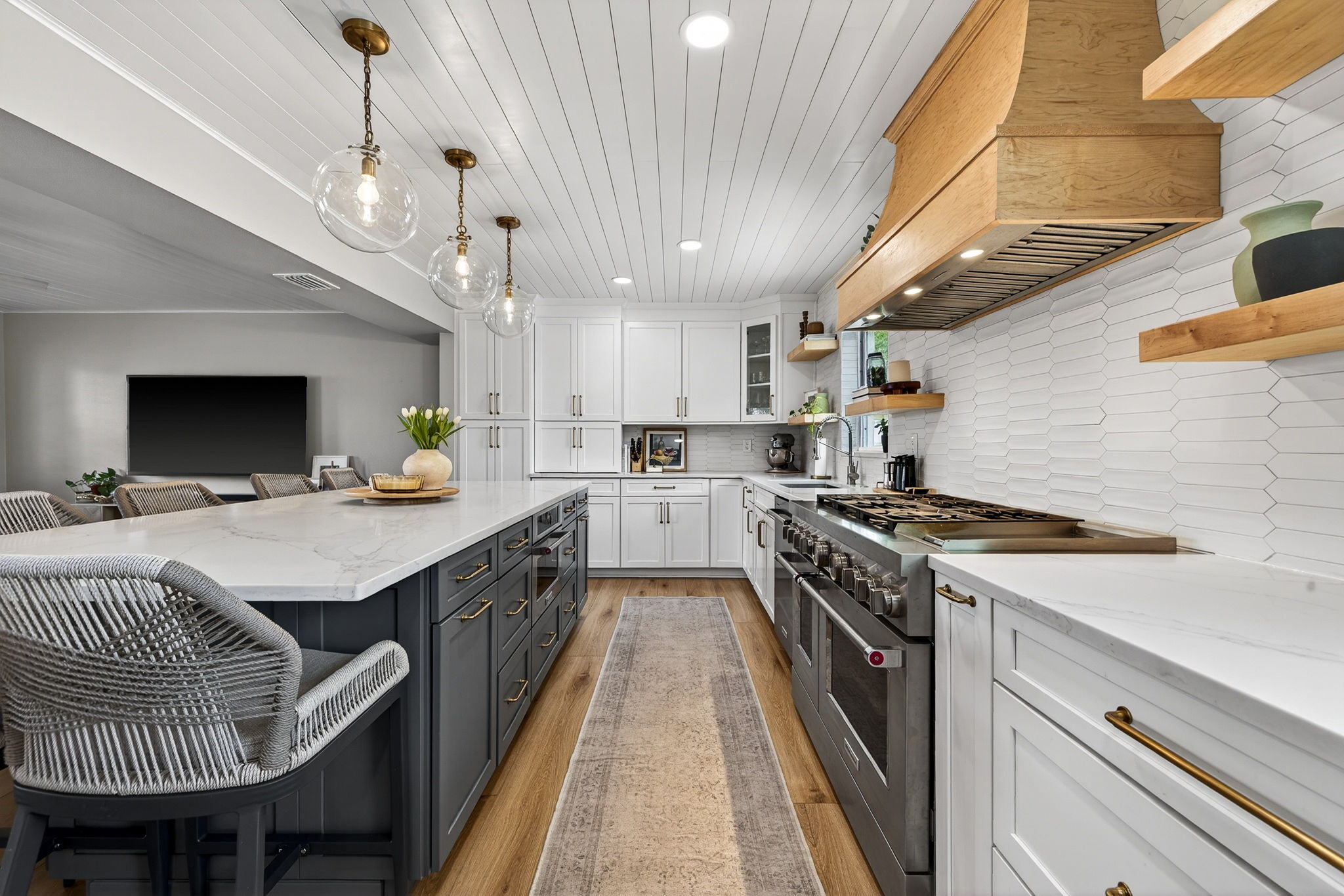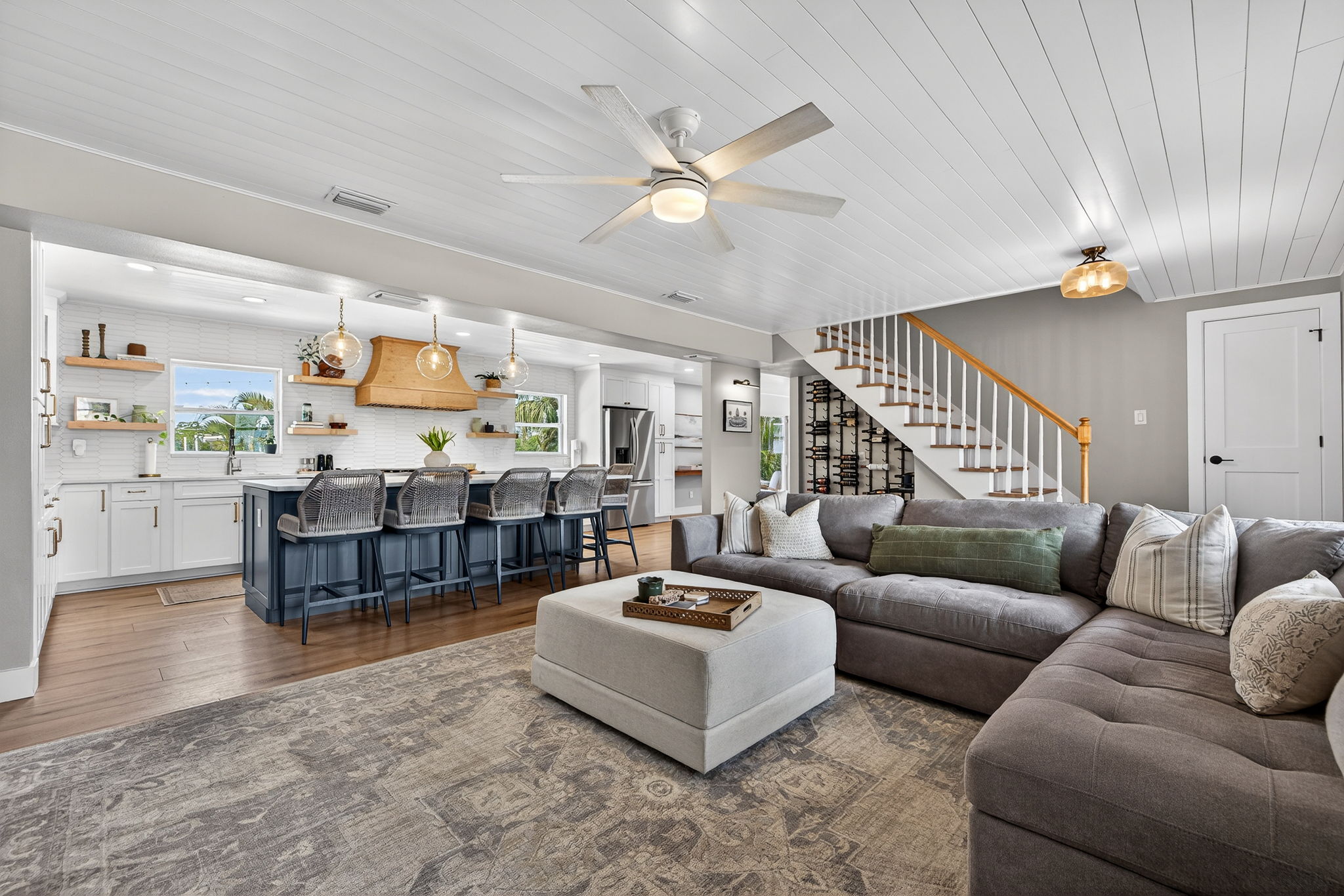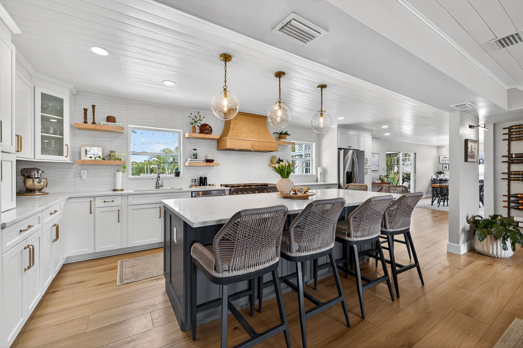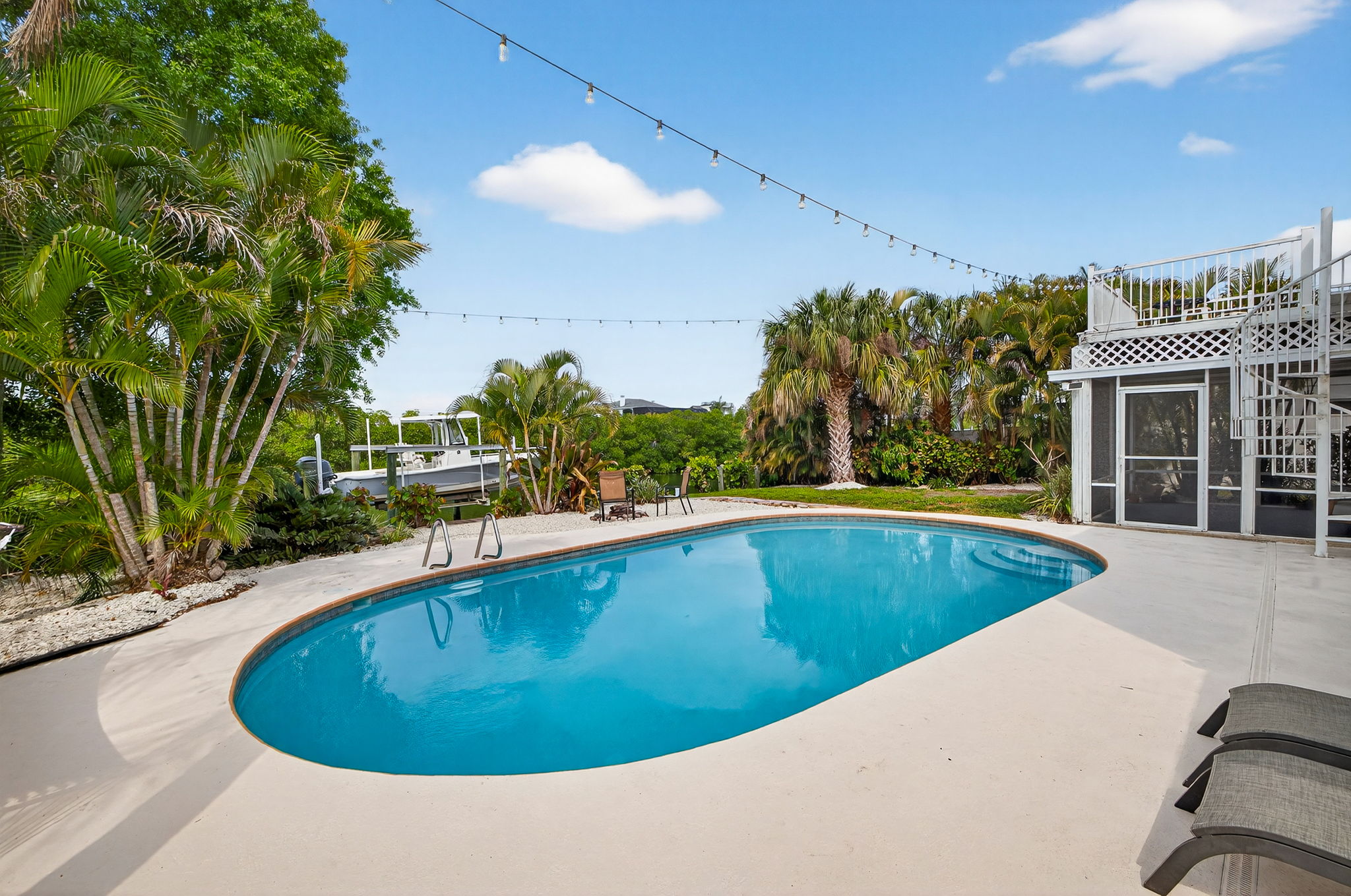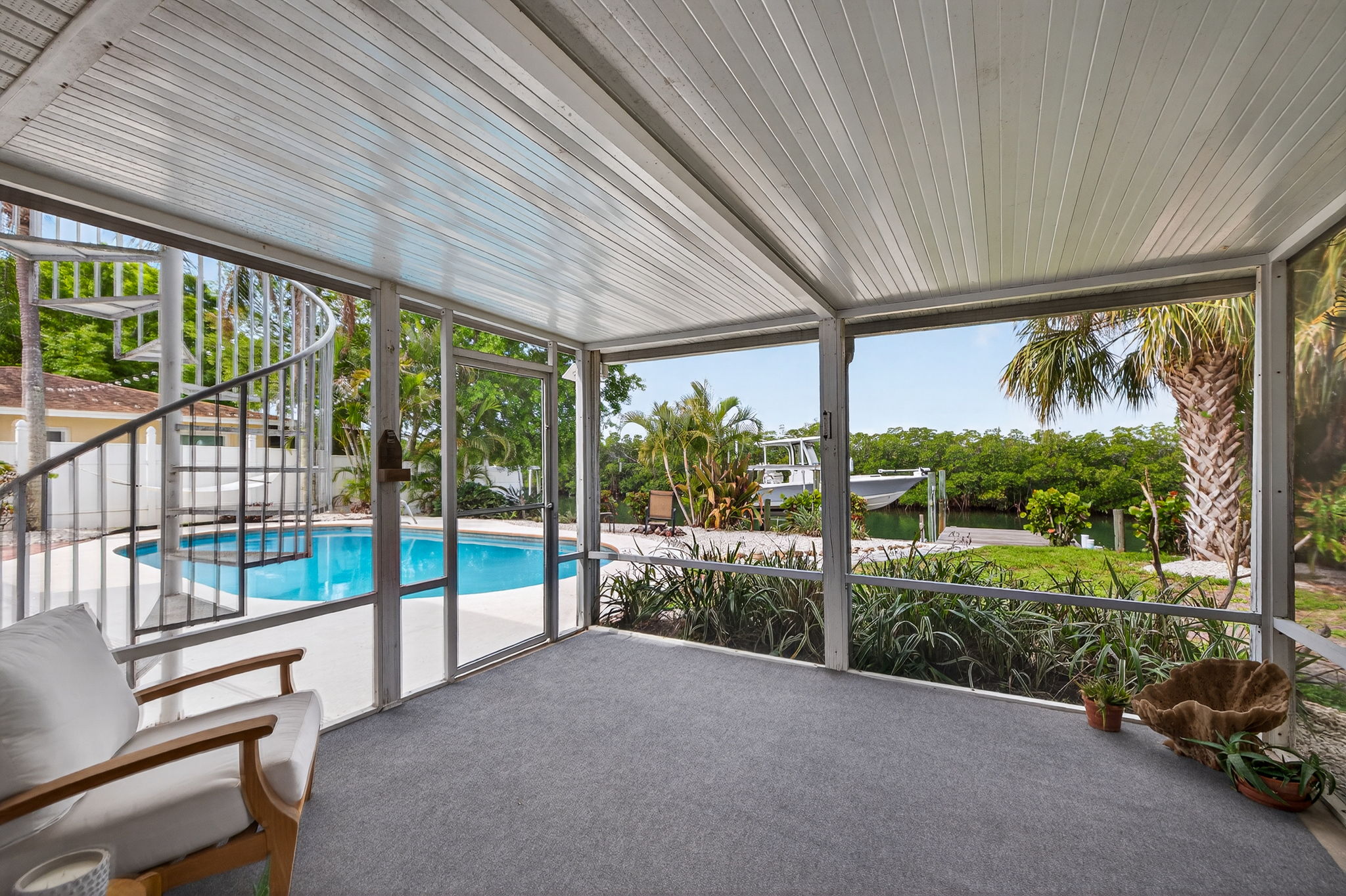 Welcome to this stunning waterfront property overlooking the main canal of Tampa’s Bay Crest Park, offering breathtaking sunsets from the owner’s retreat, private balcony, and back porch. This home features three generously sized bedrooms, along with a dedicated office space off the primary bedroom (which could be converted into a fourth bedroom), two full baths, one half bath, a sparkling pool, boat lift, two-car garage, and a fenced yard. Upon entry, you’re immediately drawn to the beach cottage vibe with coastal luxury vinyl flooring, an open layout, and a stunning kitchen overlooking the waterfront oasis. The kitchen is a true focal point, thoughtfully designed with a six-burner KitchenAid gas range with dual ovens, stainless steel microwave and dishwasher, and extensive custom cabinetry with soft -close drawers. The oversized island provides seating as well as additional storage, with cabinetry on both sides. A beautiful wood hood, decorative shelving, and a subway tile backsplash extending to the ceiling add character, while quartz countertops and a shiplap ceiling complete the space. Updated lighting and fixtures further elevate the design. The kitchen is open to the family room, with a separate dining room located toward the rear of the home featuring additional cabinetry and a dry bar area. Upstairs, you’ll find all bedrooms along with the office, which is connected to the primary suite. Wood flooring runs throughout the upper level, and the bathrooms have been tastefully updated. The primary suite is a rare oversized room for this neighborhood, and the spa-like bathroom includes dual sinks, decorative tile flooring, and access to a private balcony with serene views of the water and mangroves. Storage is exceptional, with three separate walk-in closets in the primary bedroom. The owner’s retreat leads to a private balcony, perfect for sunset cocktails, and a spiral staircase that leads down to the backyard. The backyard is a dream, featuring a covered, screened-in lanai—ideal for enjoying the waterfront setting. There is an oversized pool and a dock with a boat lift. Positioned on the main canal with direct access to the Gulf and minimal no-wake zones, this property offers both convenience and lifestyle. Enjoy privacy and natural surroundings with mangroves and no rear neighbors. The fully fenced yard adds additional functionality. Additional highlights include a spacious two-car garage, suitable for parking or potential conversion into additional living space or a game room. Major system updates add peace of mind, including a new roof in 2026, HVAC, pool pump, kitchen appliances, and washer and dryer replaced in 2024, along with a water heater installed in 2025. Residents of Bay Crest Park enjoy no HOA fees or deed restrictions, along with access to a private neighborhood boat ramp. Conveniently located near Tampa International Airport, International Plaza and Bay Street, the Westshore Business District, and waterfront favorites like Salt Shack on the Bay and Hula Bay Club. Boating access across the bay to Safety Harbor and the St. Pete Pier—this one truly has it all!