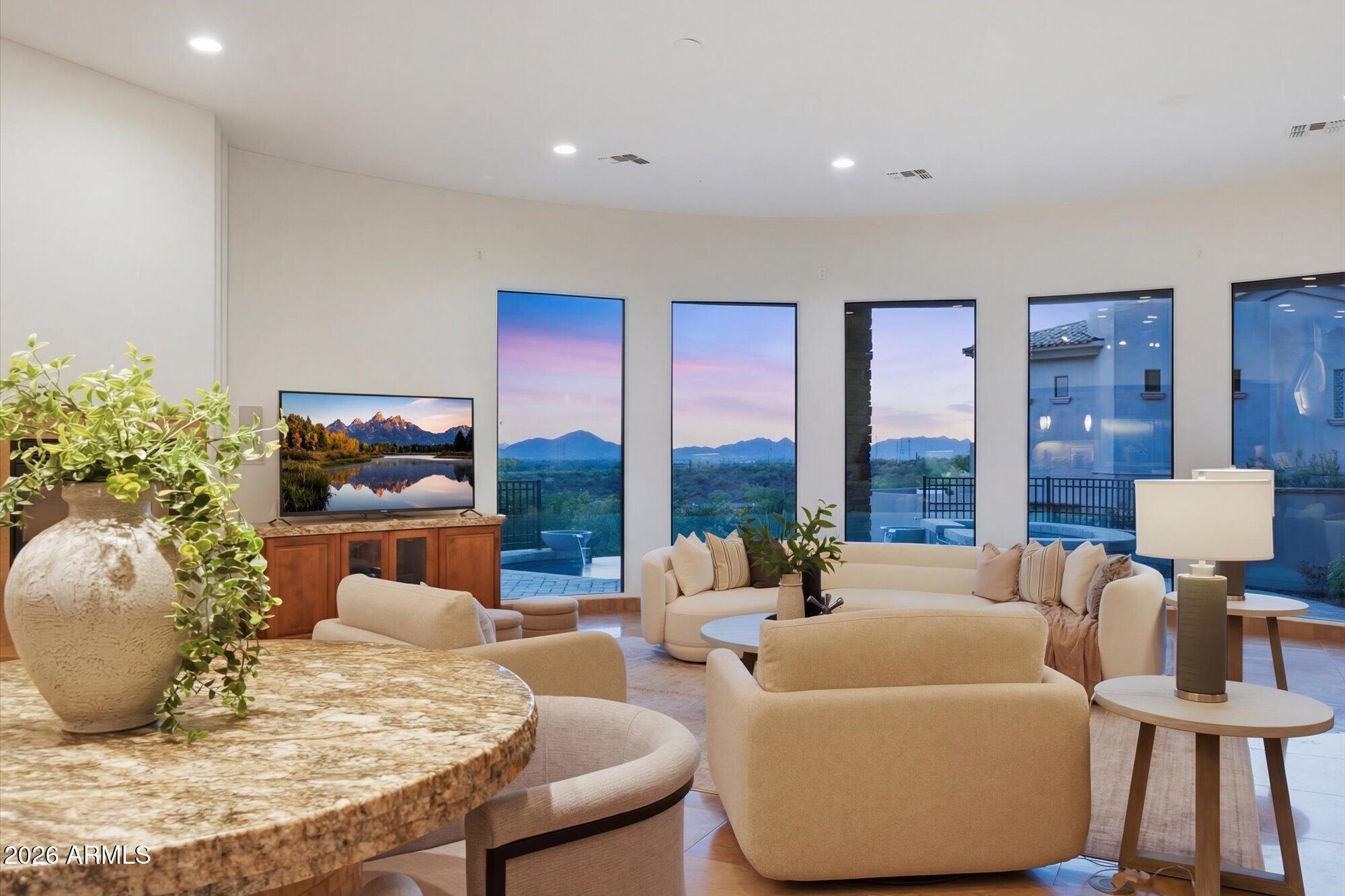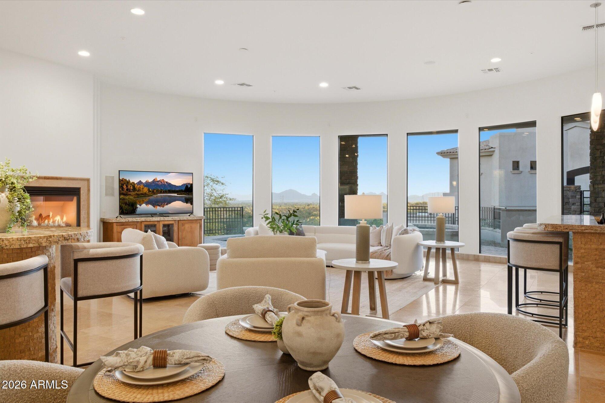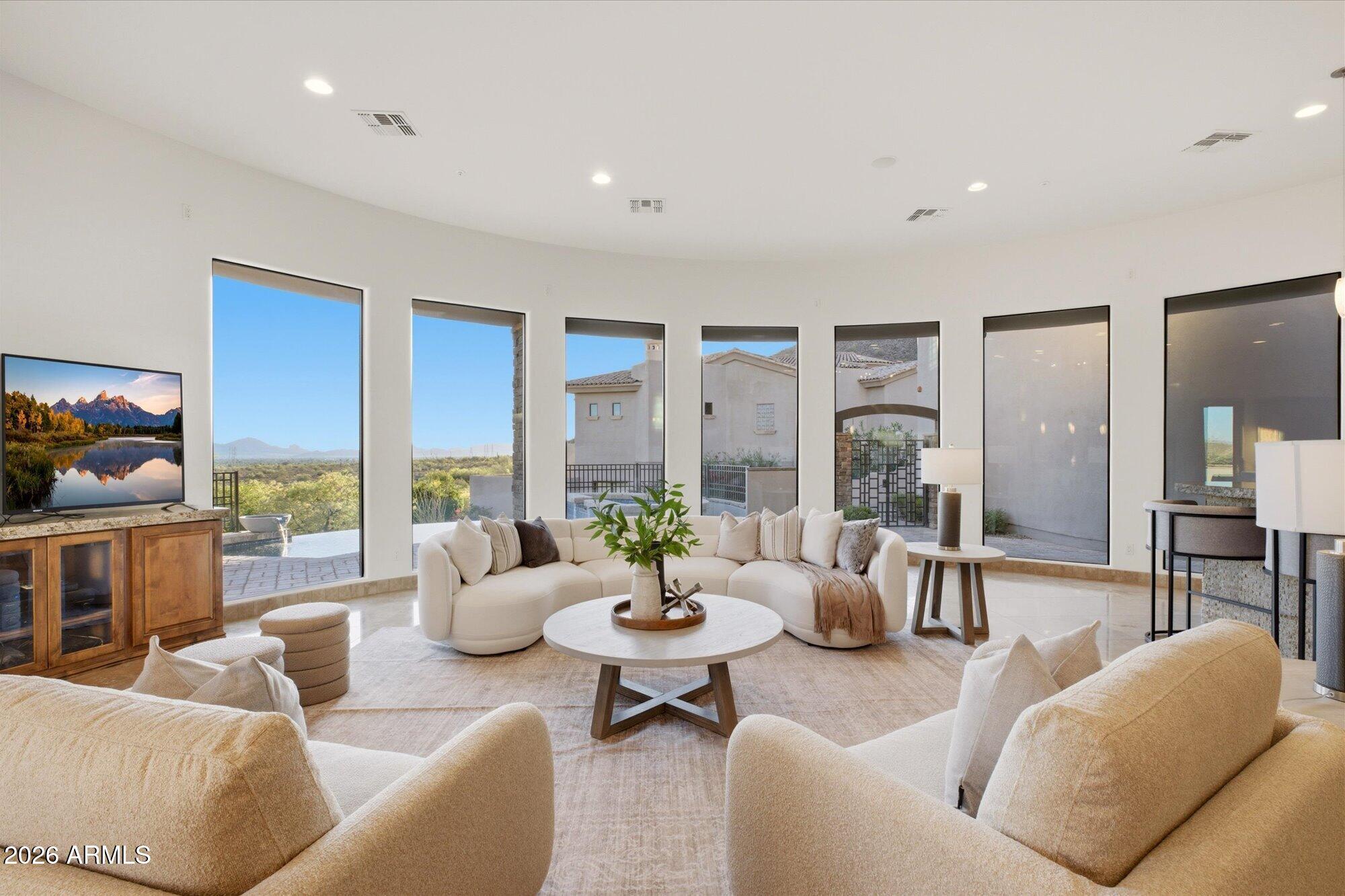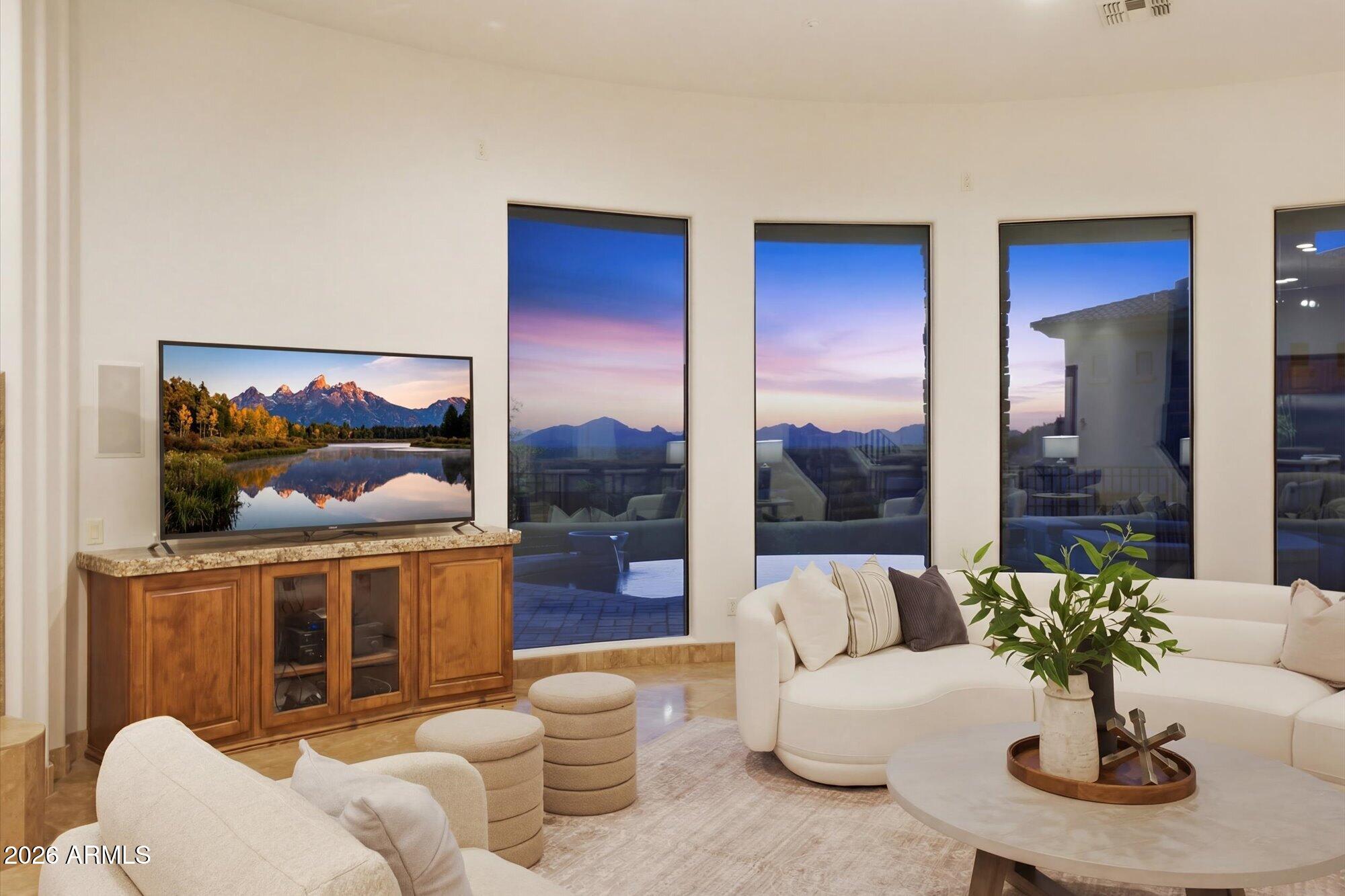 Stunning custom luxury home in exclusive Ancala Country Club, Scottsdales guard gated golf community in the McDowell Mountains. Hillside retreat with 4BD/6BA and ,1-acre lot backs to the mountain with ownership to the peak. Panoramic city lights, Camelback and desert views through expansive glass. Gourmet kitchen: Wolf/SubZero appliances, granite counters, custom cabinetry, large island. Great room: travertine fireplace and huge wet bar with two fridges. Home theater with step up and fridges. Elevator, travertine floors, high ceilings, heated pool & spa with city lights views. Unique curved architecture with soft round edges, multiple patios, two staircases: one to private guest suite with bedroom, bath, patio. Access to Pete Dye golf, clubhouse, tennis. A desert oasis!