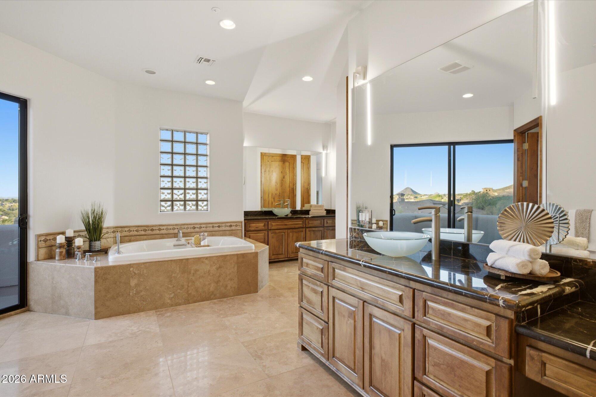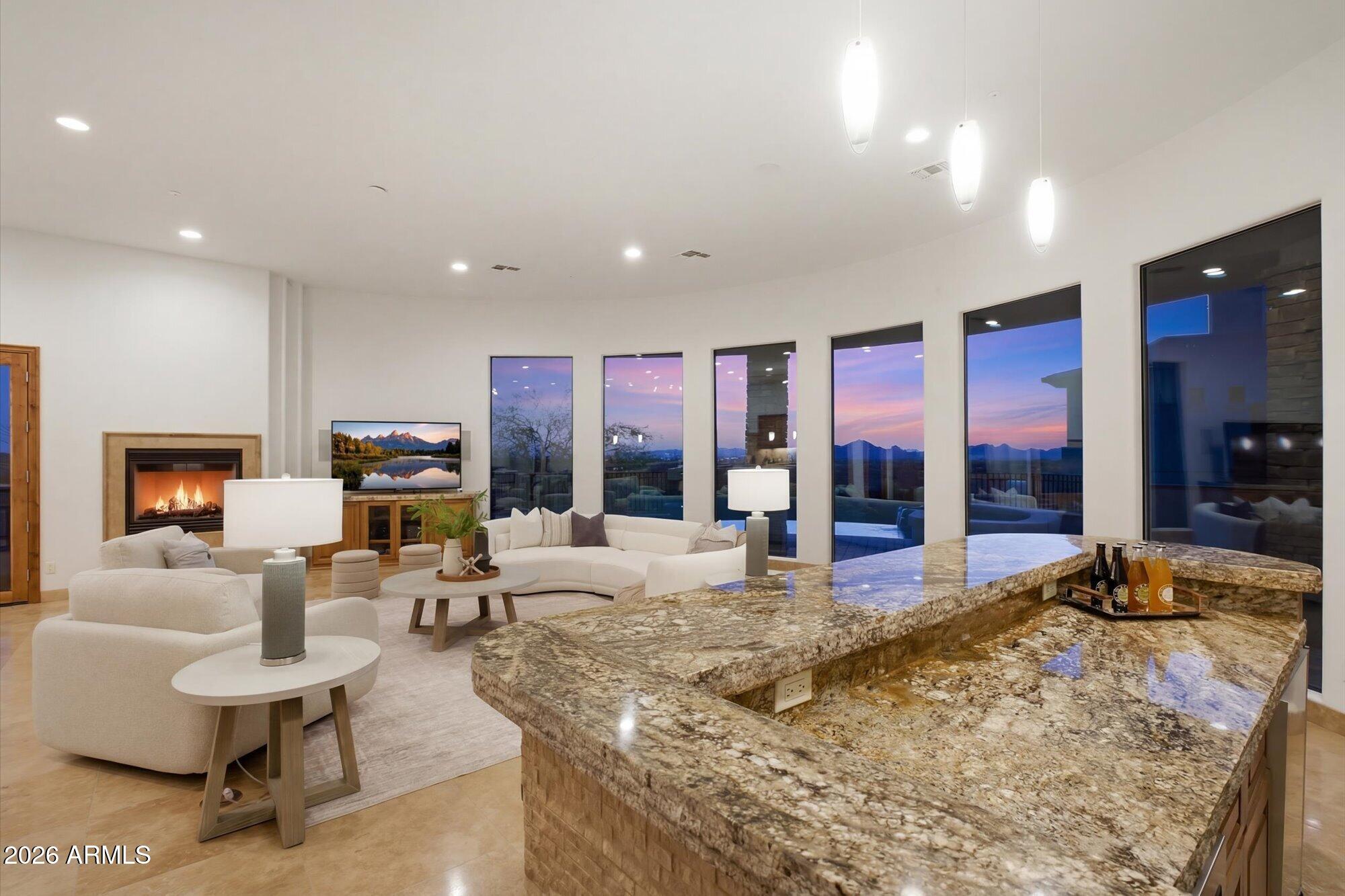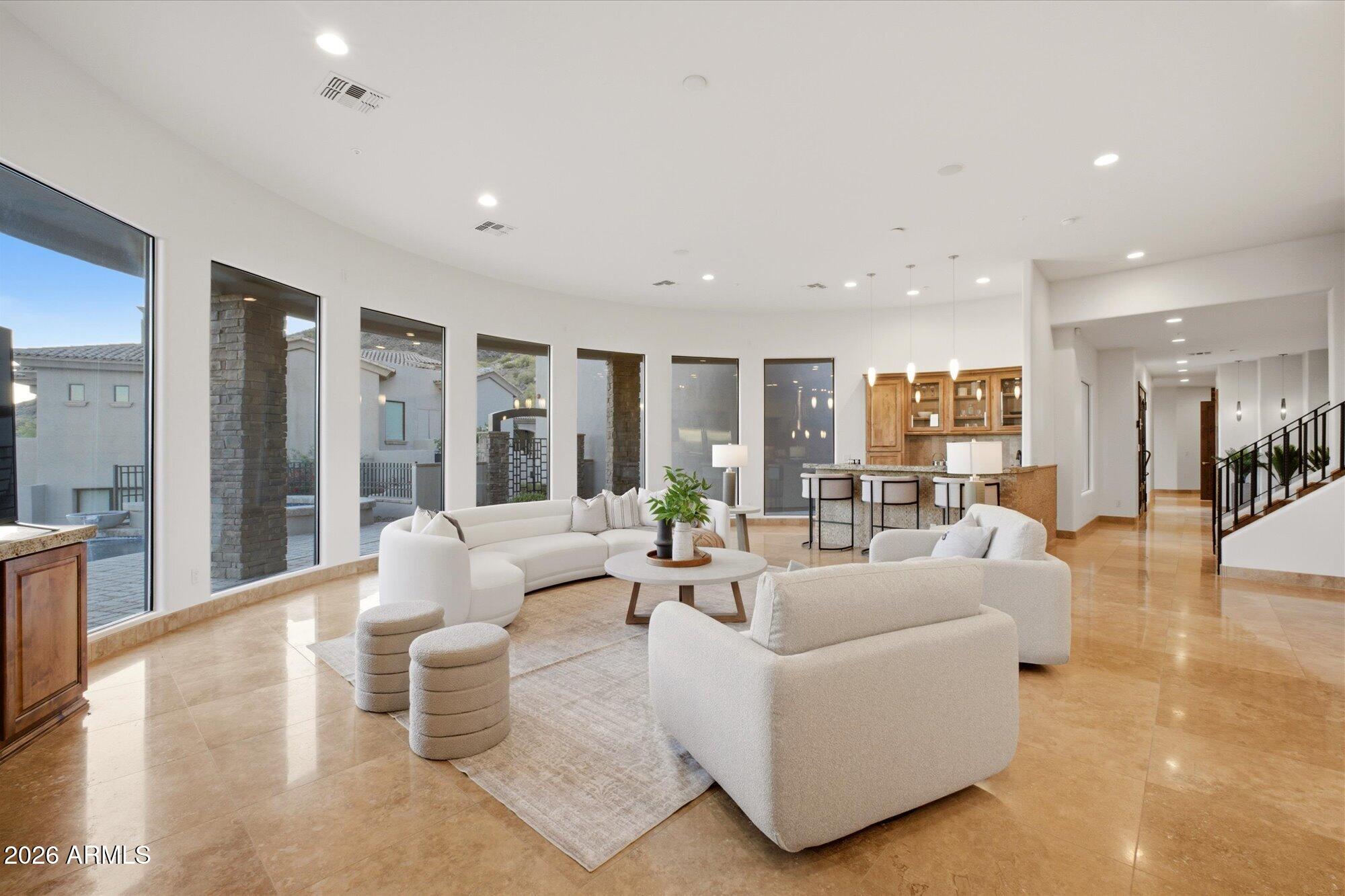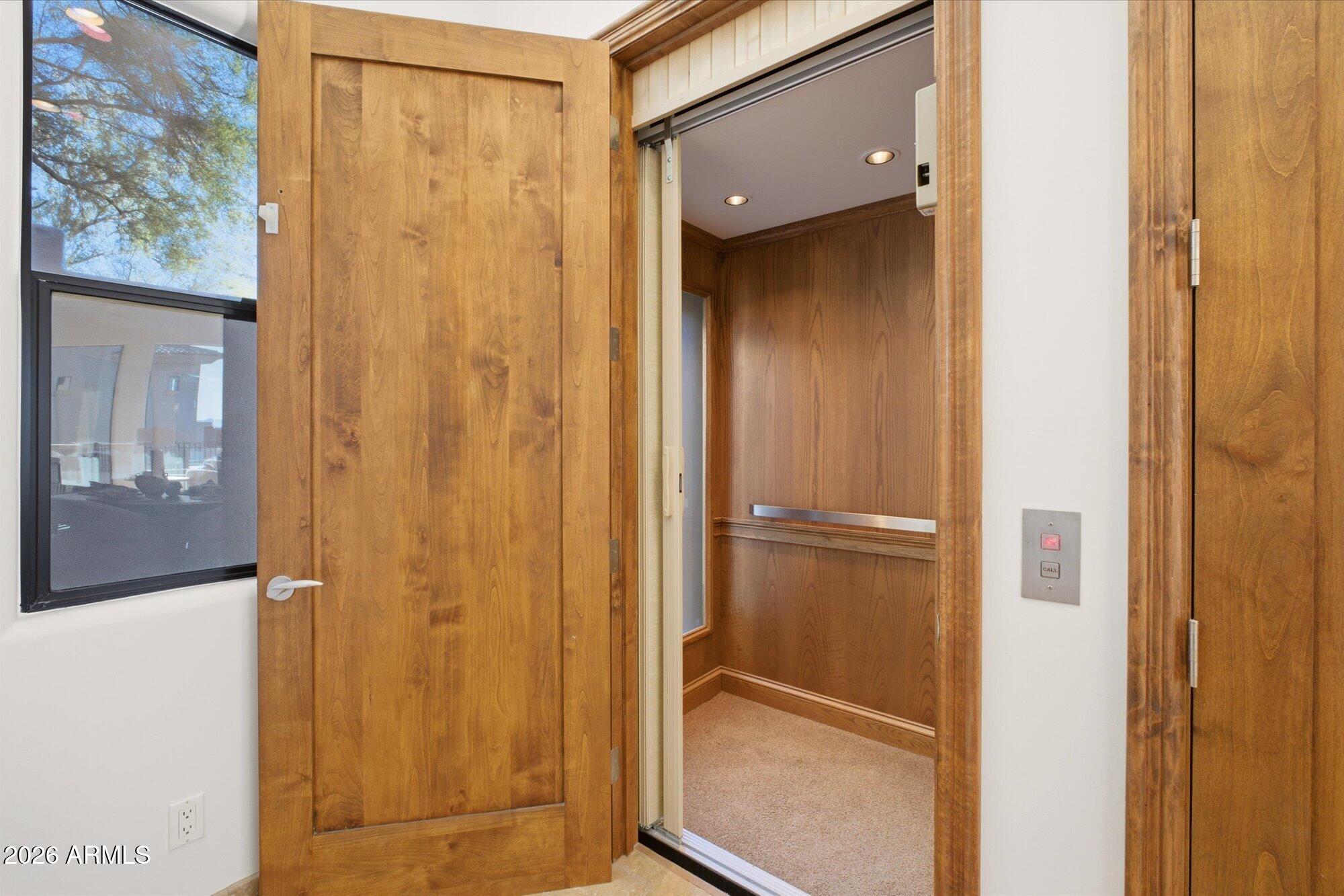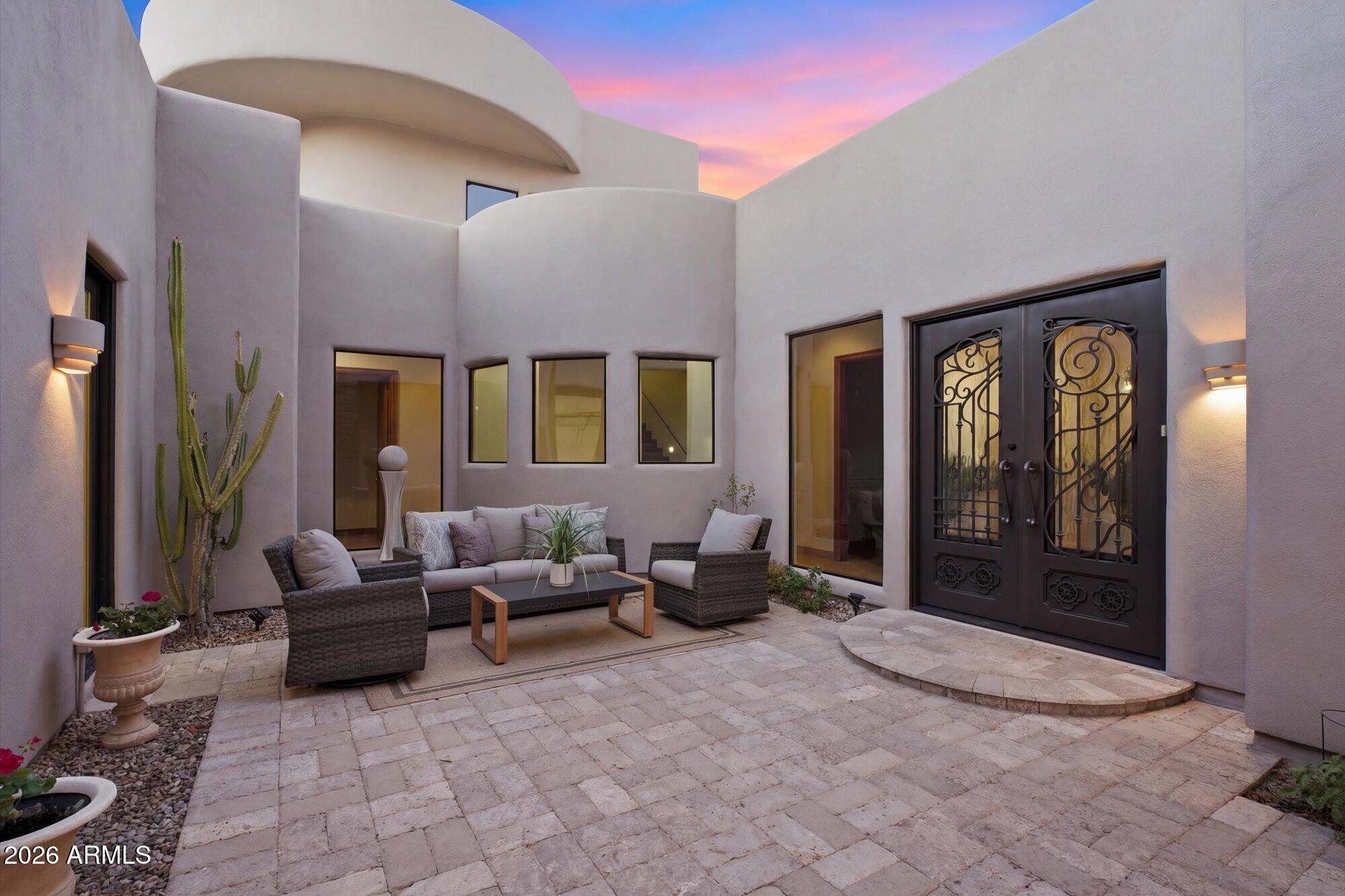 Stunning custom luxury home in exclusive Ancala Country Club, Scottsdales guard gated golf community in the McDowell Mountains. Hillside retreat with 4BD/6BA and ,1-acre lot backs to the mountain with ownership to the peak. Panoramic city lights, Camelback and desert views through expansive glass. Gourmet kitchen: Wolf/SubZero appliances, granite counters, custom cabinetry, large island. Great room: travertine fireplace and huge wet bar with two fridges. Home theater with step up and fridges. Elevator, travertine floors, high ceilings, heated pool & spa with city lights views. Unique curved architecture with soft round edges, multiple patios, two staircases: one to private guest suite with bedroom, bath, patio. Access to Pete Dye golf, clubhouse, tennis. A desert oasis!