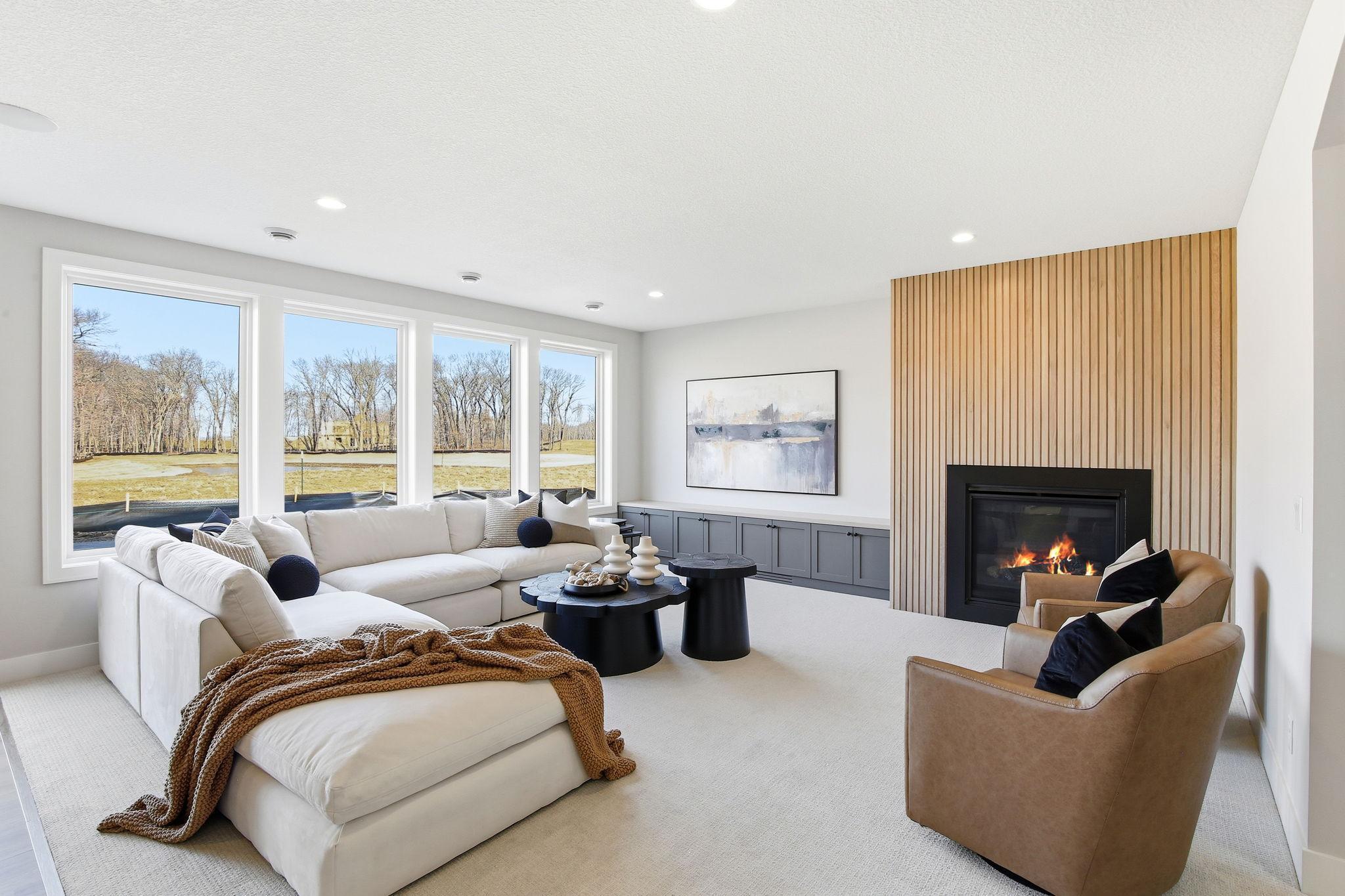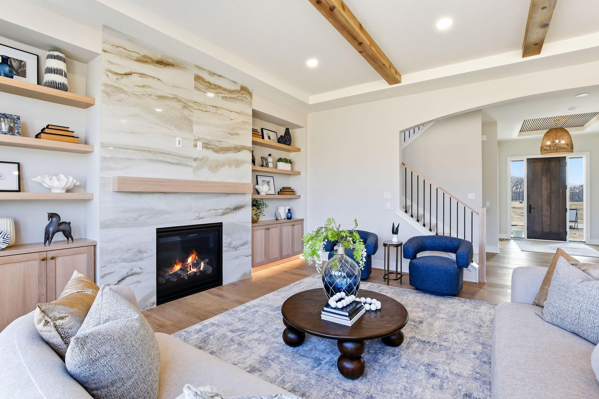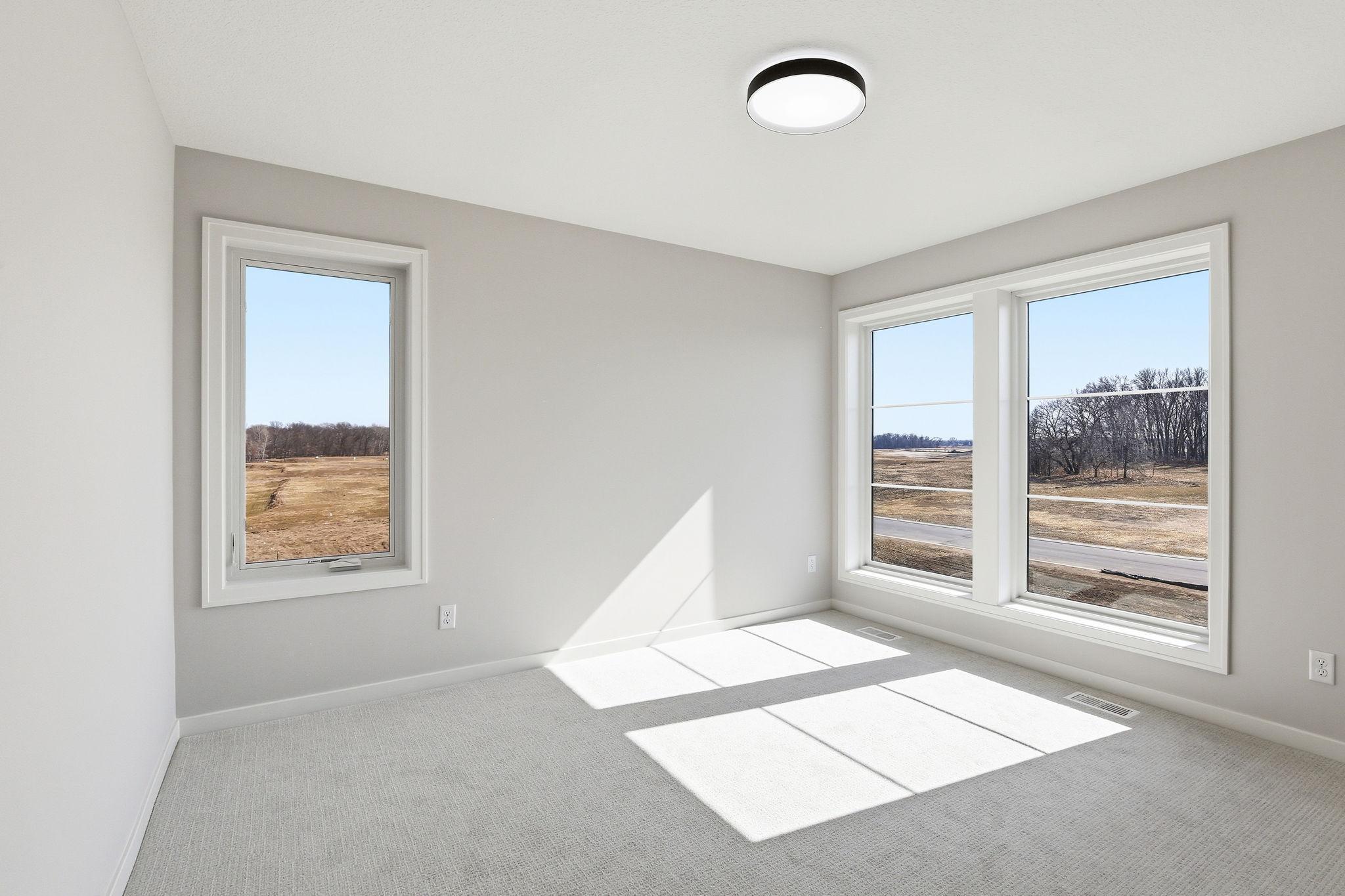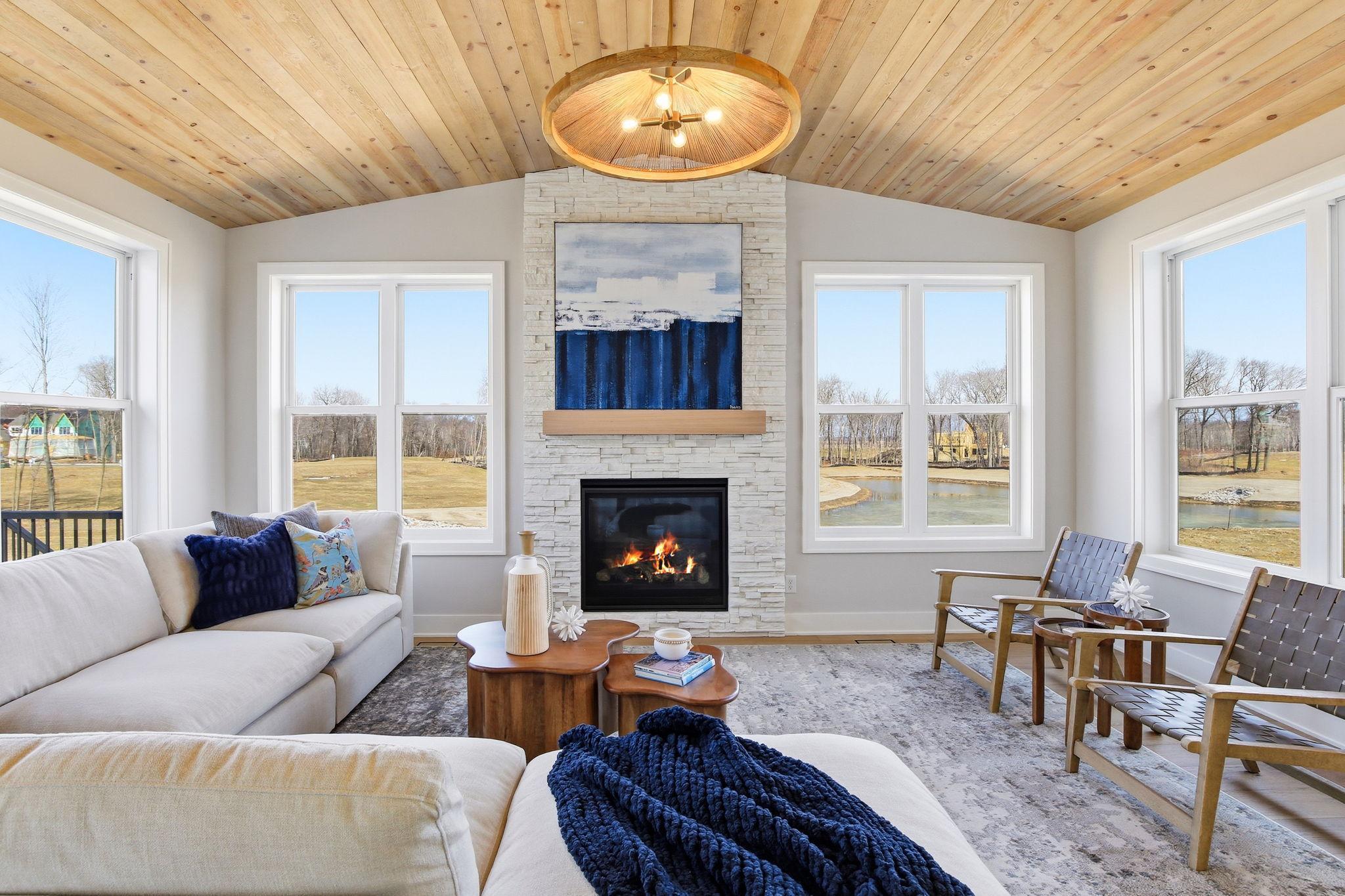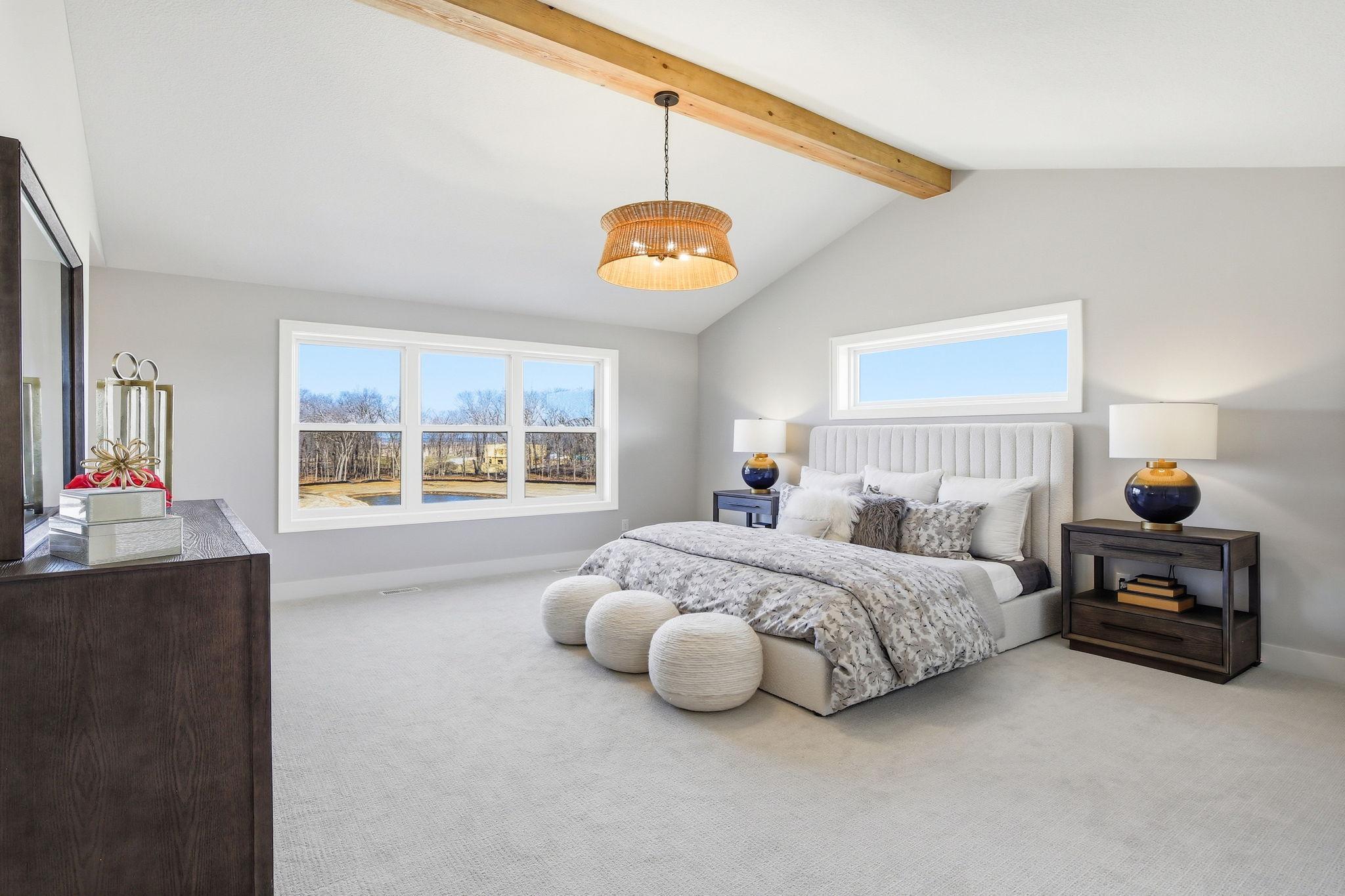 Welcome to Ham Lakes newest neighborhood, Elwell Farms, featuring 106 beautiful acreage sites that offer wooded/pond and scenic views overlooking the Carlos Avery Wildlife Management Area. Amenities in the neighborhood include a pool, clubhouse, park, fishing pier, and so much more! NIH Homes is excited to bring this new floor plan to the neighborhood, which offers tall ceilings on the main floor, including wood beams and beautiful ceiling details. Other main floor features include a large walk-through pantry/prep area, a sunroom with a stone-surround fireplace, and an office. Upstairs, you will find a luxurious primary suite, a Jack-and-Jill bedroom, a junior suite, and a large bonus room. The basement is thoughtfully designed, including entertaining areas in the family room, rec room, and bar, all overlooking the golf sim room. It also features a guest bedroom/bath, an exercise room, and a large indoor athletic court. The garage is fully finished, including a unit heater and floor drain. All of this is complemented by a beautiful pond view out the back.