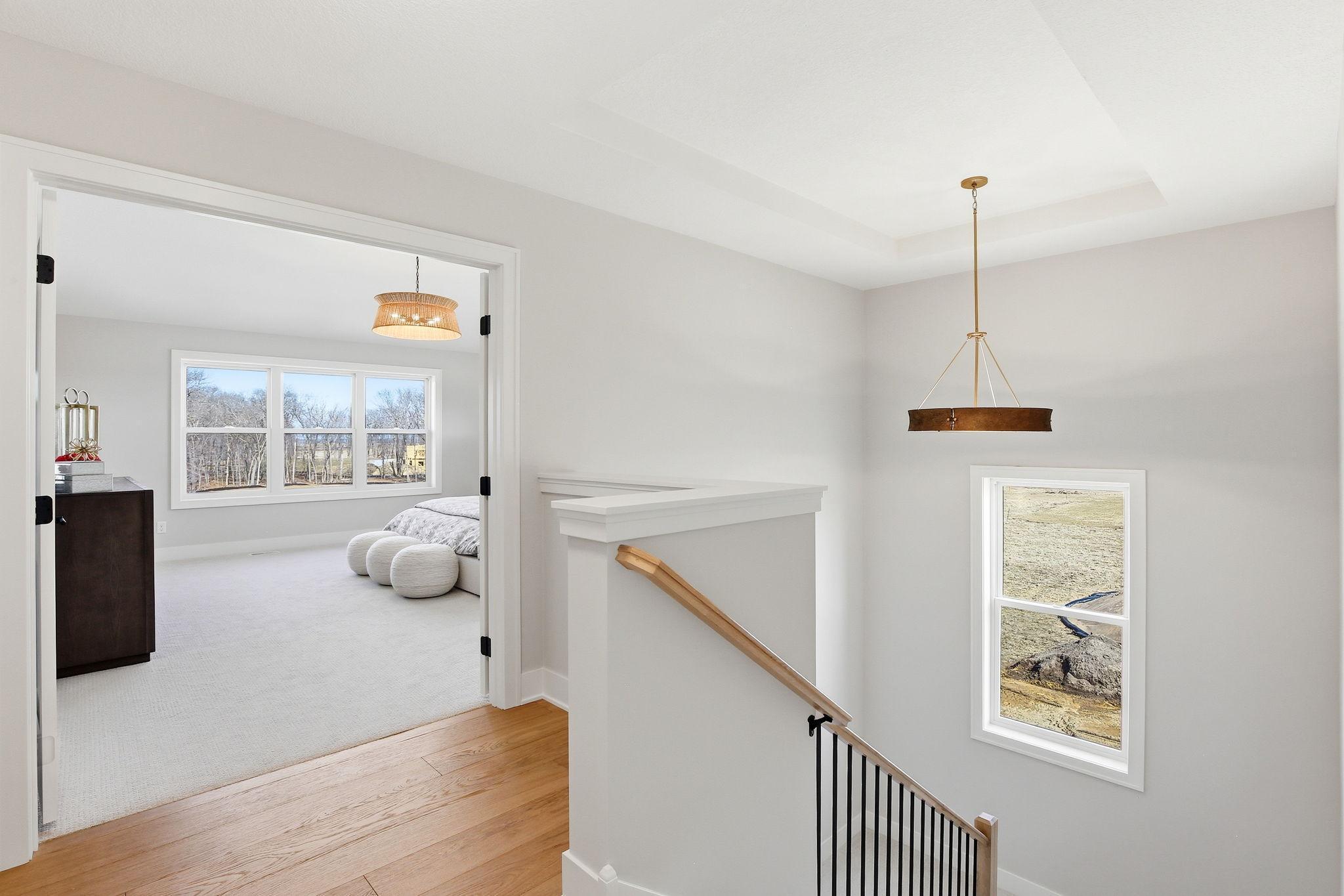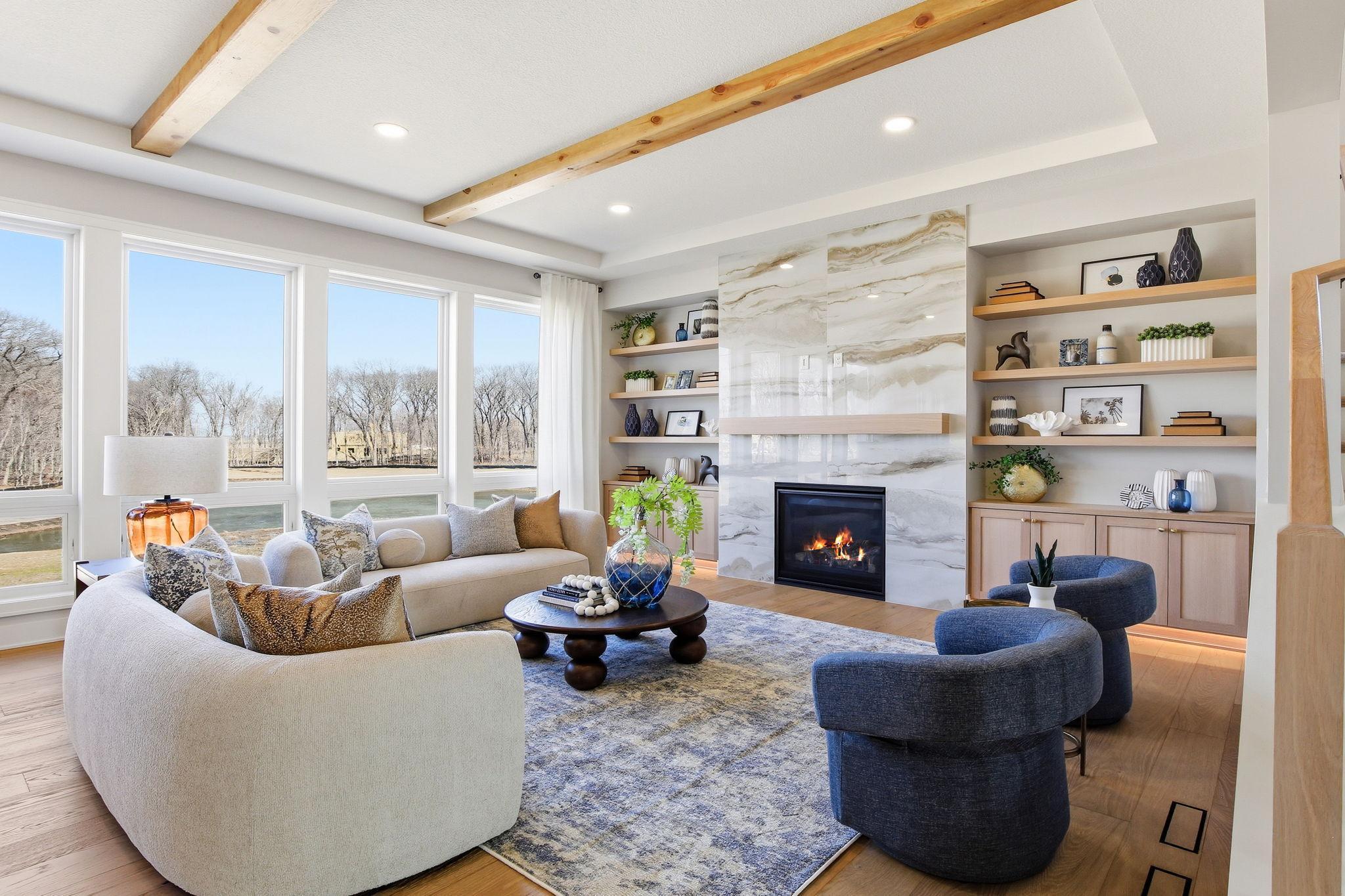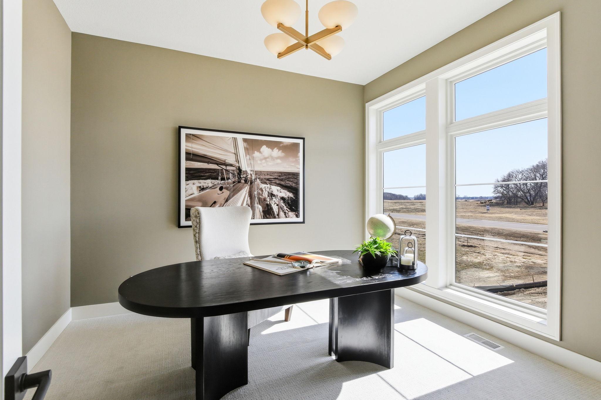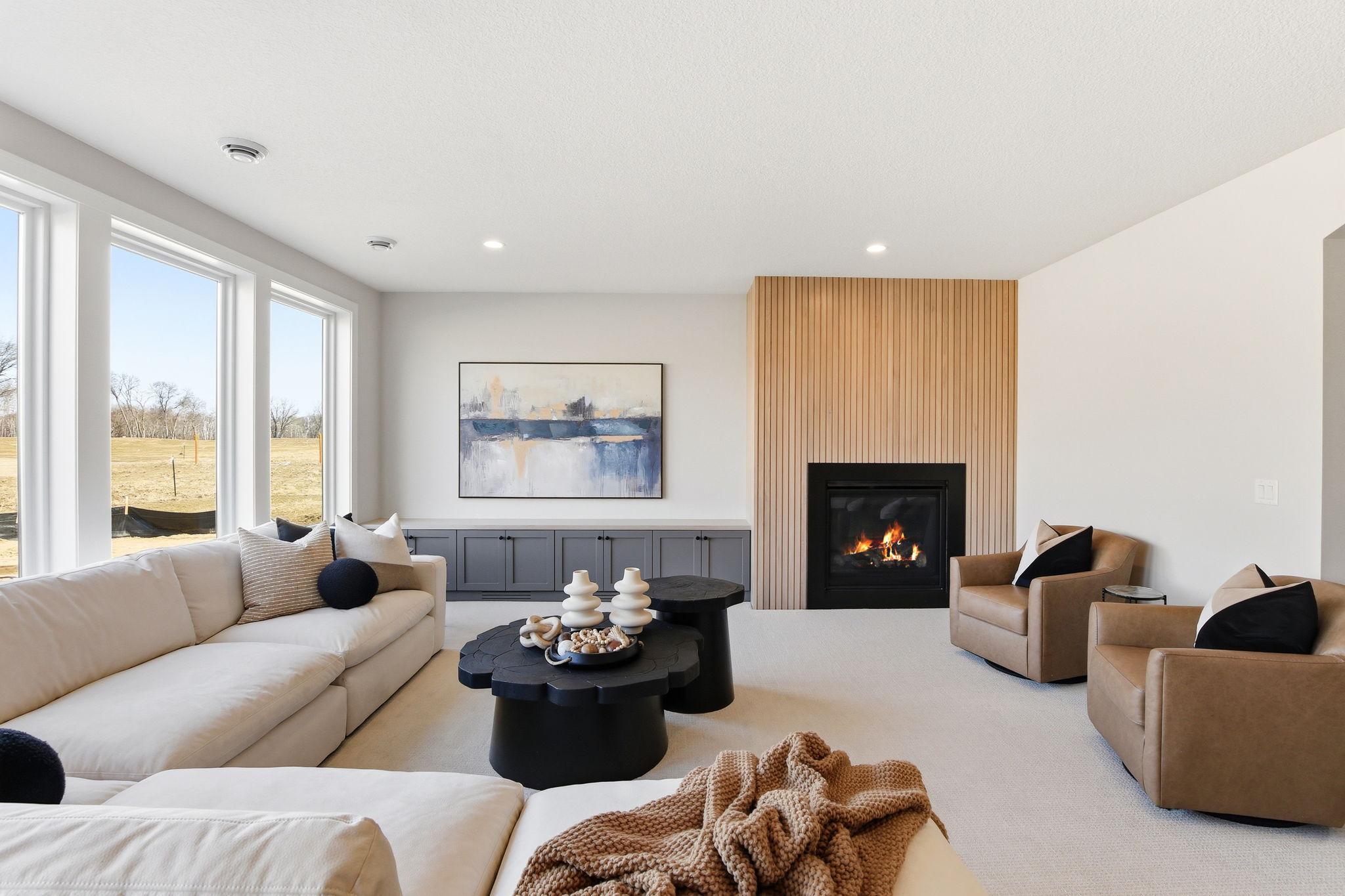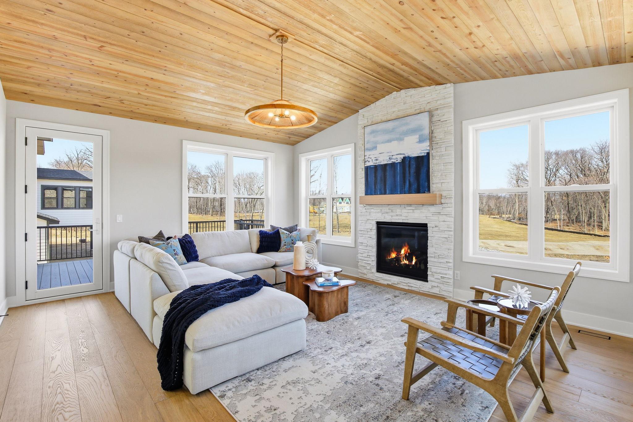 Welcome to Ham Lakes newest neighborhood, Elwell Farms, featuring 106 beautiful acreage sites that offer wooded/pond and scenic views overlooking the Carlos Avery Wildlife Management Area. Amenities in the neighborhood include a pool, clubhouse, park, fishing pier, and so much more! NIH Homes is excited to bring this new floor plan to the neighborhood, which offers tall ceilings on the main floor, including wood beams and beautiful ceiling details. Other main floor features include a large walk-through pantry/prep area, a sunroom with a stone-surround fireplace, and an office. Upstairs, you will find a luxurious primary suite, a Jack-and-Jill bedroom, a junior suite, and a large bonus room. The basement is thoughtfully designed, including entertaining areas in the family room, rec room, and bar, all overlooking the golf sim room. It also features a guest bedroom/bath, an exercise room, and a large indoor athletic court. The garage is fully finished, including a unit heater and floor drain. All of this is complemented by a beautiful pond view out the back.