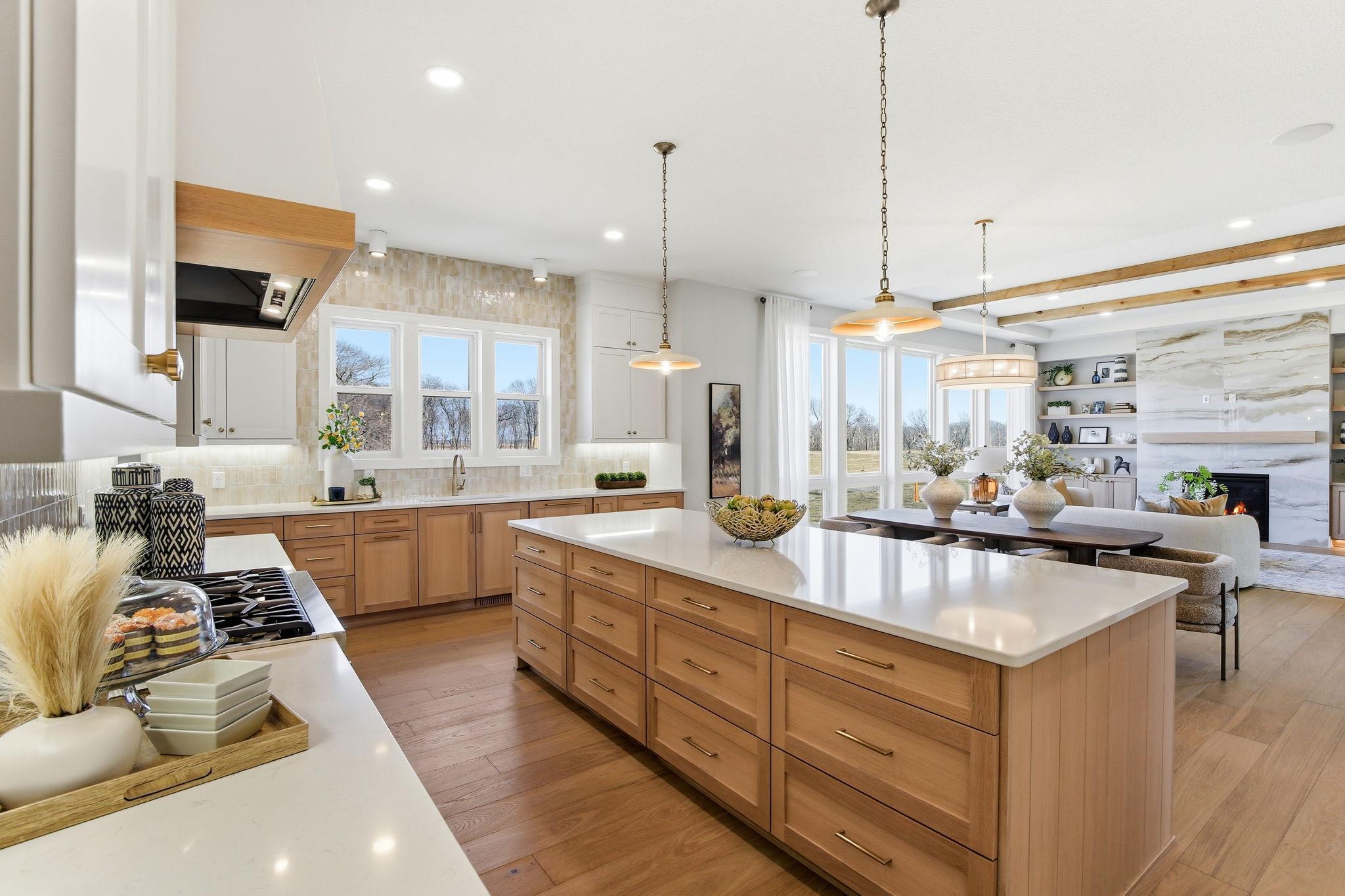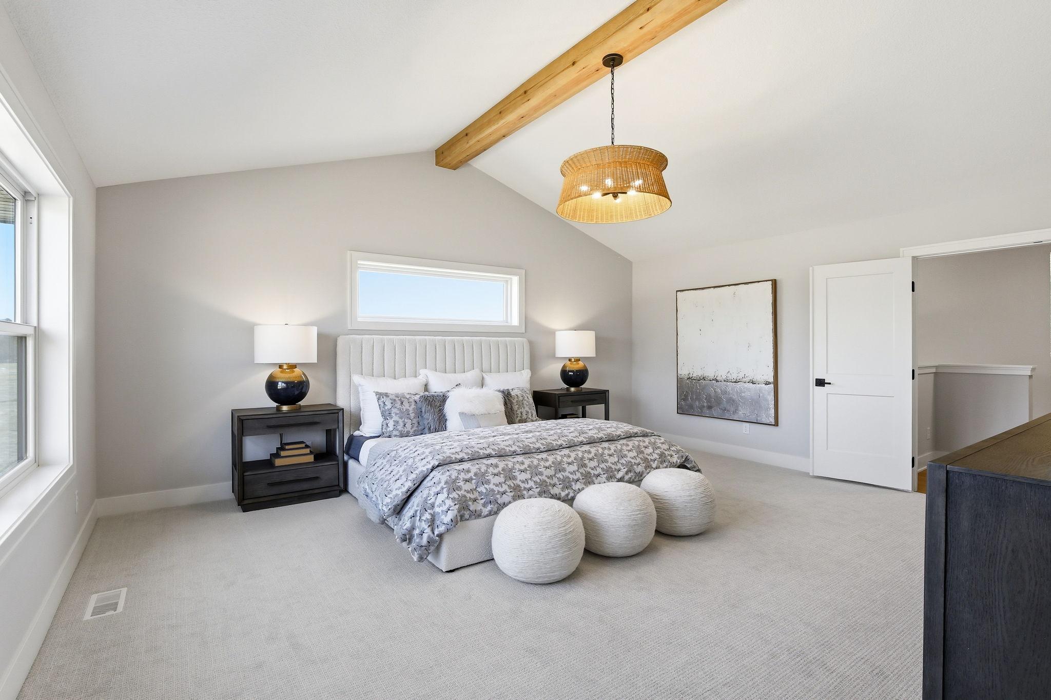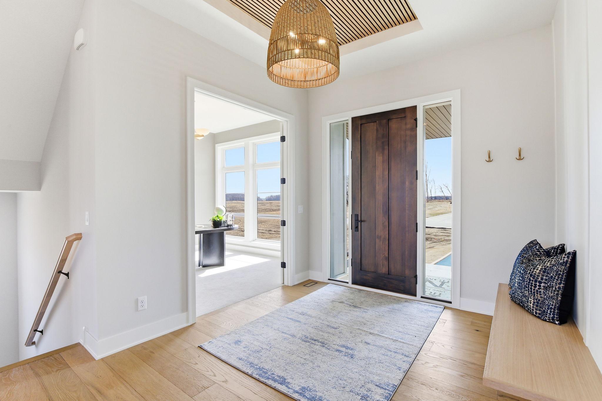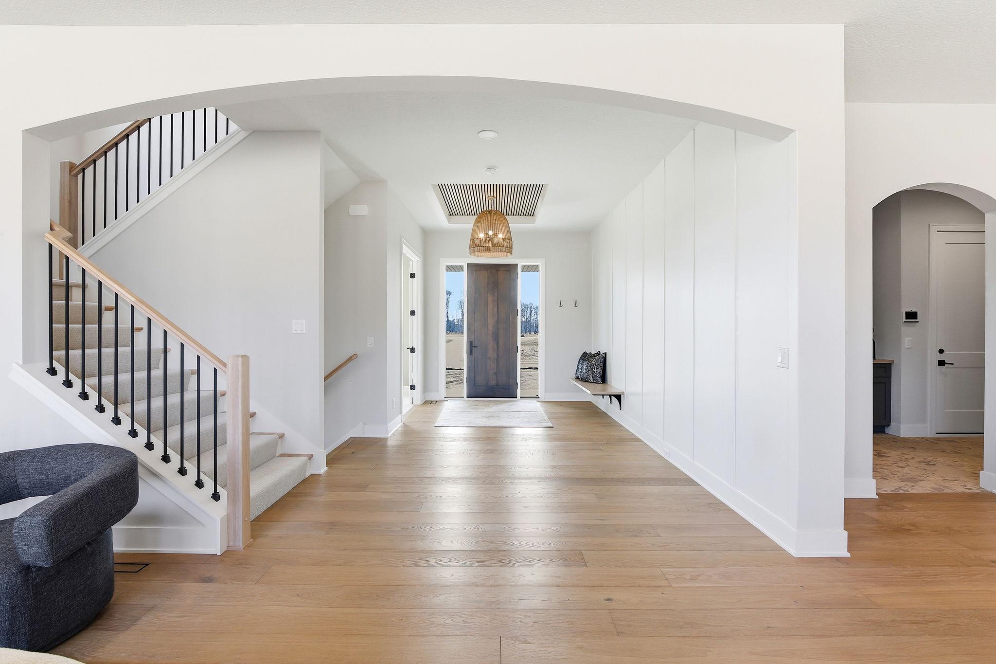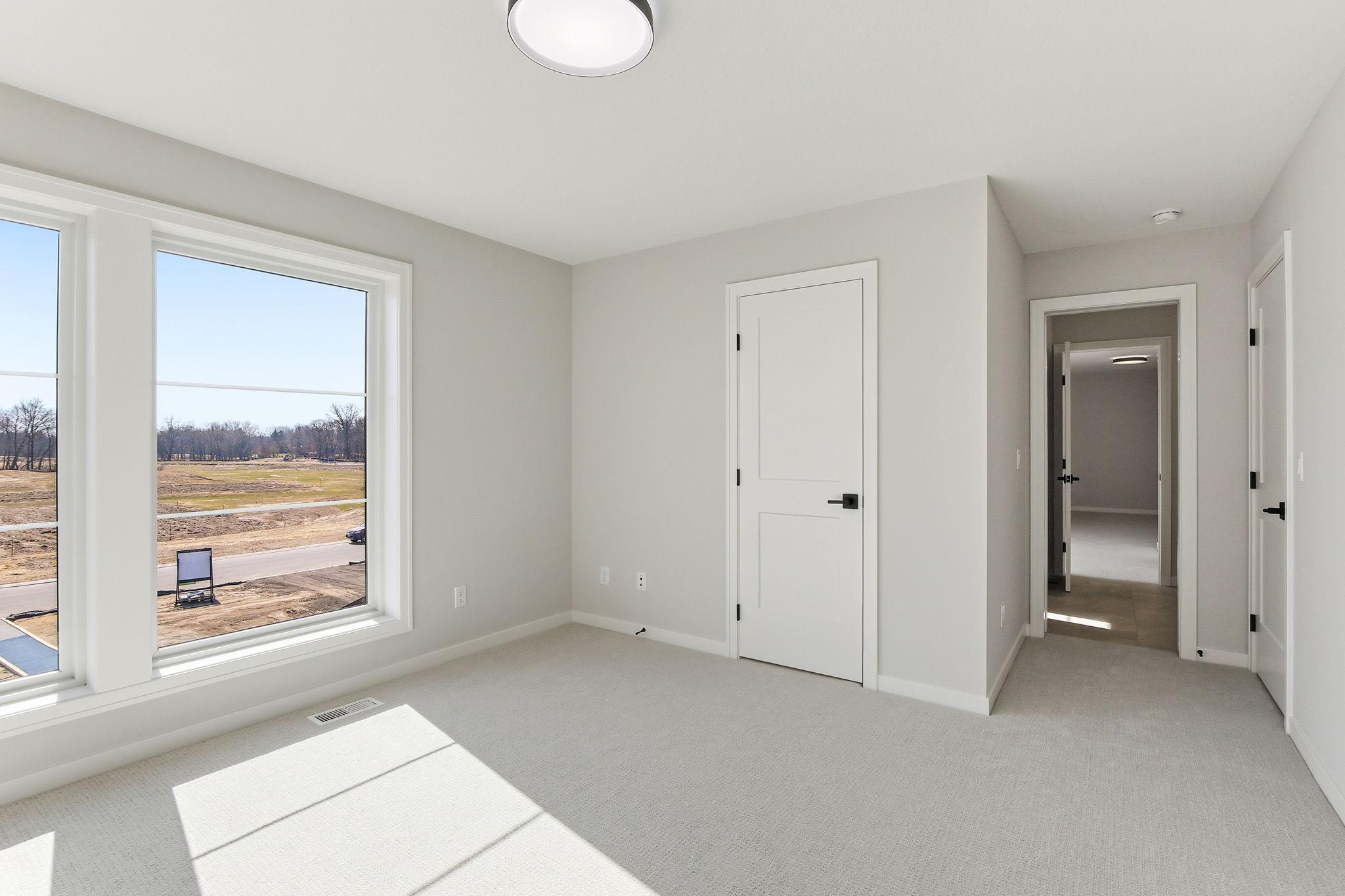 Welcome to Ham Lakes newest neighborhood, Elwell Farms, featuring 106 beautiful acreage sites that offer wooded/pond and scenic views overlooking the Carlos Avery Wildlife Management Area. Amenities in the neighborhood include a pool, clubhouse, park, fishing pier, and so much more! NIH Homes is excited to bring this new floor plan to the neighborhood, which offers tall ceilings on the main floor, including wood beams and beautiful ceiling details. Other main floor features include a large walk-through pantry/prep area, a sunroom with a stone-surround fireplace, and an office. Upstairs, you will find a luxurious primary suite, a Jack-and-Jill bedroom, a junior suite, and a large bonus room. The basement is thoughtfully designed, including entertaining areas in the family room, rec room, and bar, all overlooking the golf sim room. It also features a guest bedroom/bath, an exercise room, and a large indoor athletic court. The garage is fully finished, including a unit heater and floor drain. All of this is complemented by a beautiful pond view out the back.