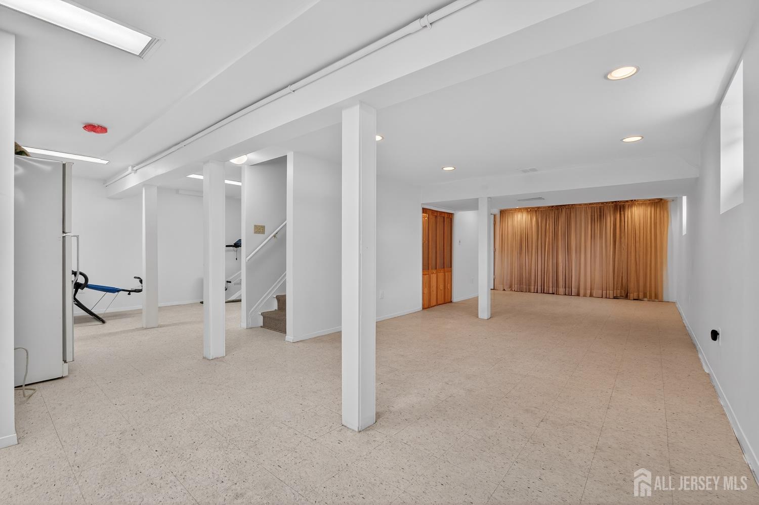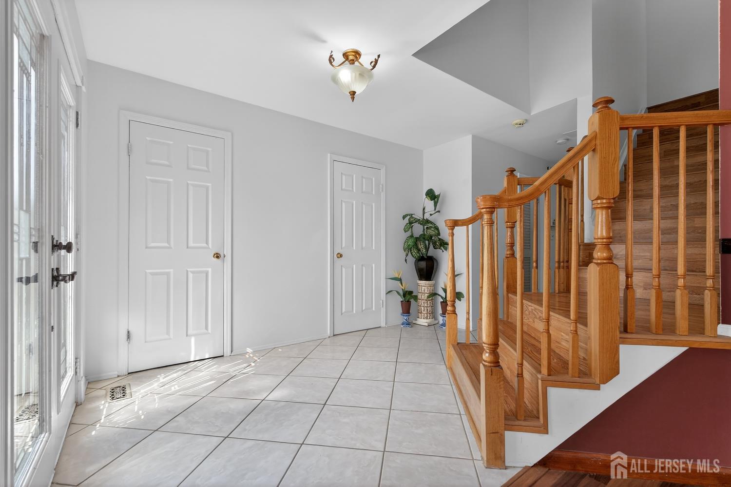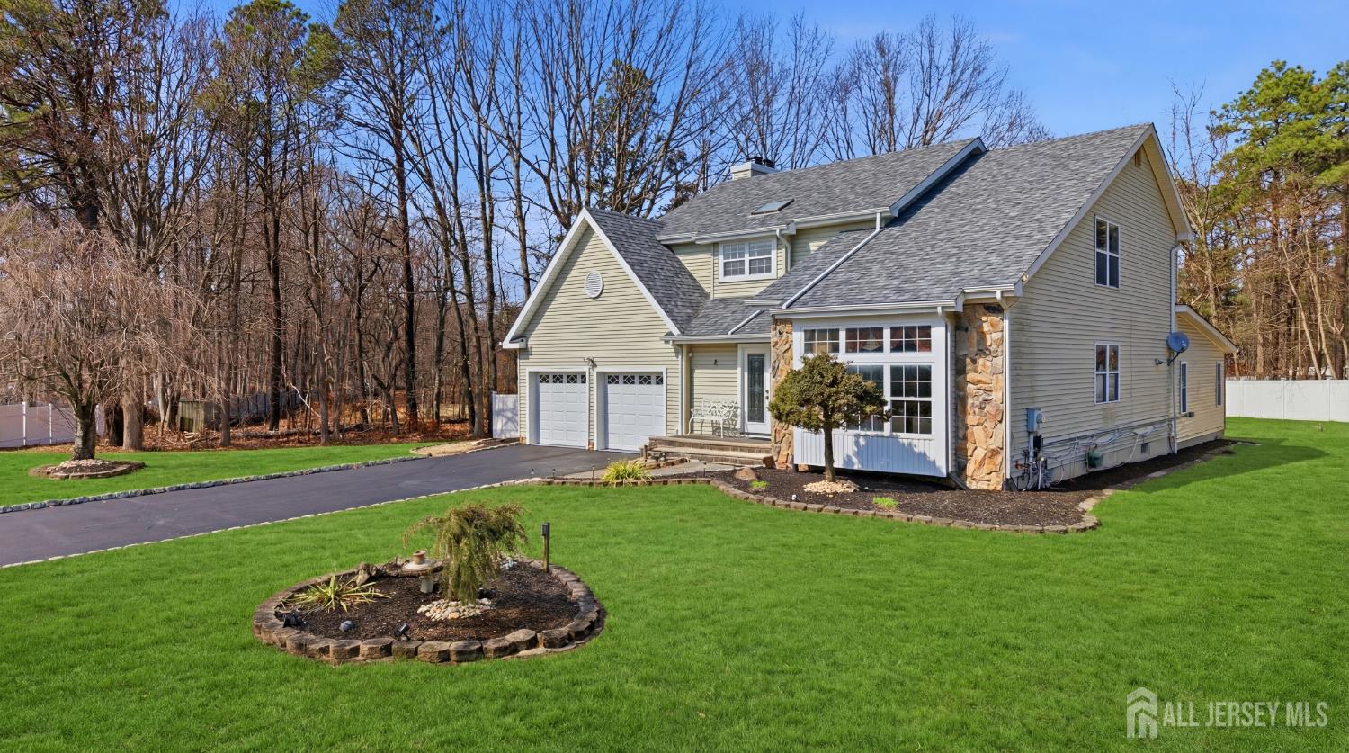 Welcome to this beautifully expanded and exceptionally well-appointed 4-bedroom, 3-full-bath Colonial offering approximately 3,100 square feet, including a stunning 900 square foot addition off the kitchen. Tucked away at the end of a cul-de-sac, this home makes an immediate impression with double entry doors opening to a diamond-cut ceramic tile foyer with coat closet and a full bath with shower stall on the main level. The formal living room features Pergo flooring, cathedral ceilings, dramatic picture and floor-to-ceiling windows, chandelier lighting, and flows seamlessly into the elegant dining room with matching Pergo floors, chair rail, decorative molding & recessed lighting. The spacious eat-in kitchen is beautifully appointed with oak cabinetry, Black Galaxy granite countertops and backsplash, stainless steel appliances, gas cooking vented outside, center island with breakfast bar, and a bright breakfast area with bay sliders (granite table & chairs included). Step down into the inviting family room with Pergo flooring, wood-burning fireplace, ceiling fan, recessed lighting, and views of the show-stopping 900 sq ft tiled addition featuring cathedral ceilings, walls of windows, recessed and track lighting, speaker system, large storage closet, decorative etched French doors, and double doors leading to the porch and fully fenced backyard, property does extends beyond the fence line. Upstairs offers four generously sized bedrooms, all with Pergo flooring, including a spacious primary suite with decorative cherry crown molding, recessed lights, extra large walk-in closet & additional storage, and a beautifully renovated bath with double cherry vanity, granite countertops, skylight, jetted tub, and oversized tiled shower. The renovated hall bath adds even more style and function. The fully finished basement expands the living space even further with recessed lighting, wet bar, bonus room, gym area & multiple storage closets. Additional highlights include 6-zone sprinkler system, security system, attic fan, and HVAC and roof updated approximately 2022. Minutes away from NYC Bus, train, shopping and all major roadways. Quick ride to the beach! Exceptional space, standout updates, and an unbeatable settingthis is the one.
