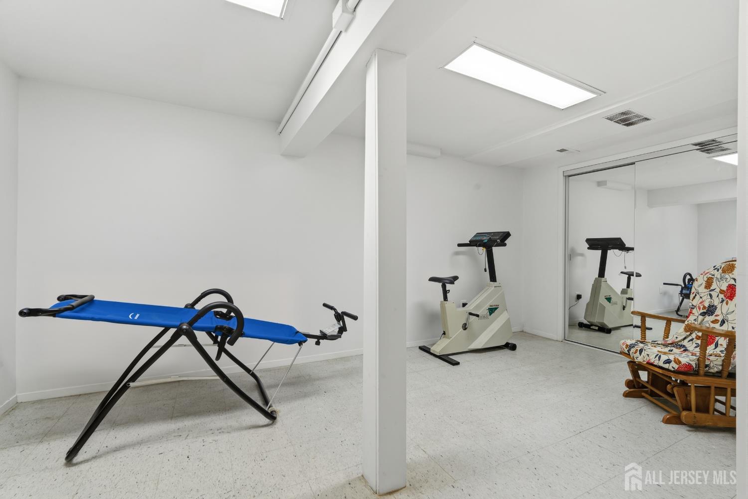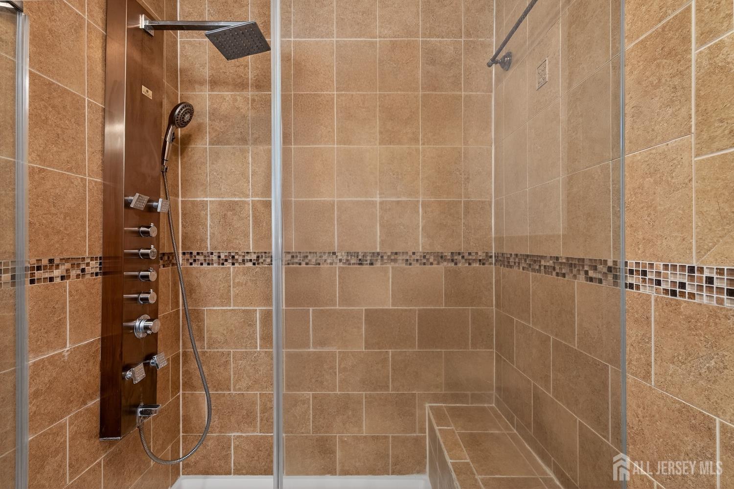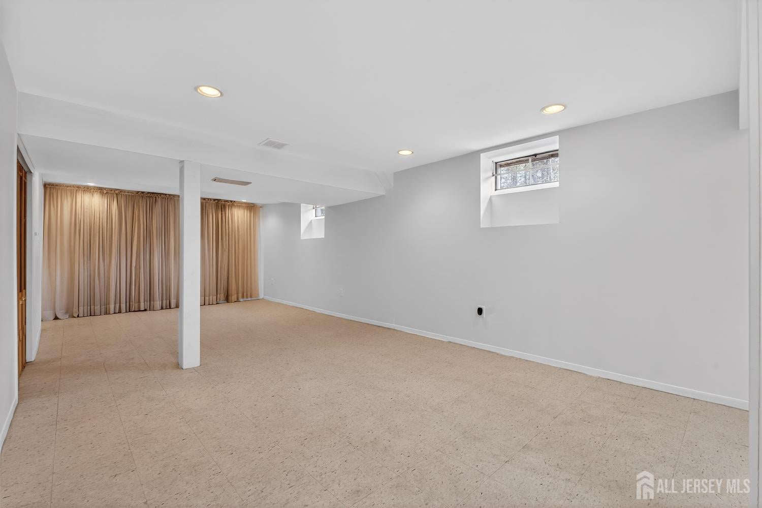 Welcome to this beautifully expanded and exceptionally well-appointed 4-bedroom, 3-full-bath Colonial offering approximately 3,100 square feet, including a stunning 900 square foot addition off the kitchen. Tucked away at the end of a cul-de-sac, this home makes an immediate impression with double entry doors opening to a diamond-cut ceramic tile foyer with coat closet and a full bath with shower stall on the main level. The formal living room features Pergo flooring, cathedral ceilings, dramatic picture and floor-to-ceiling windows, chandelier lighting, and flows seamlessly into the elegant dining room with matching Pergo floors, chair rail, decorative molding & recessed lighting. The spacious eat-in kitchen is beautifully appointed with oak cabinetry, Black Galaxy granite countertops and backsplash, stainless steel appliances, gas cooking vented outside, center island with breakfast bar, and a bright breakfast area with bay sliders (granite table & chairs included). Step down into the inviting family room with Pergo flooring, wood-burning fireplace, ceiling fan, recessed lighting, and views of the show-stopping 900 sq ft tiled addition featuring cathedral ceilings, walls of windows, recessed and track lighting, speaker system, large storage closet, decorative etched French doors, and double doors leading to the porch and fully fenced backyard, property does extends beyond the fence line. Upstairs offers four generously sized bedrooms, all with Pergo flooring, including a spacious primary suite with decorative cherry crown molding, recessed lights, extra large walk-in closet & additional storage, and a beautifully renovated bath with double cherry vanity, granite countertops, skylight, jetted tub, and oversized tiled shower. The renovated hall bath adds even more style and function. The fully finished basement expands the living space even further with recessed lighting, wet bar, bonus room, gym area & multiple storage closets. Additional highlights include 6-zone sprinkler system, security system, attic fan, and HVAC and roof updated approximately 2022. Minutes away from NYC Bus, train, shopping and all major roadways. Quick ride to the beach! Exceptional space, standout updates, and an unbeatable settingthis is the one.