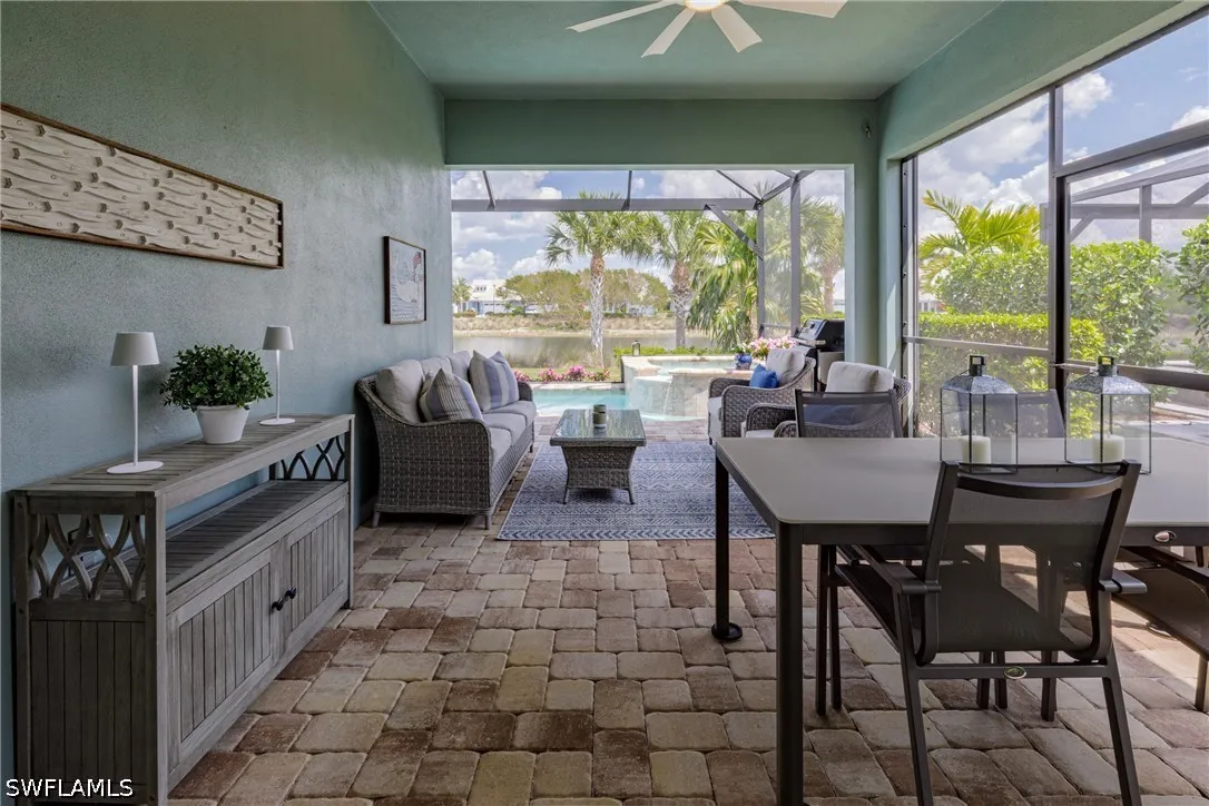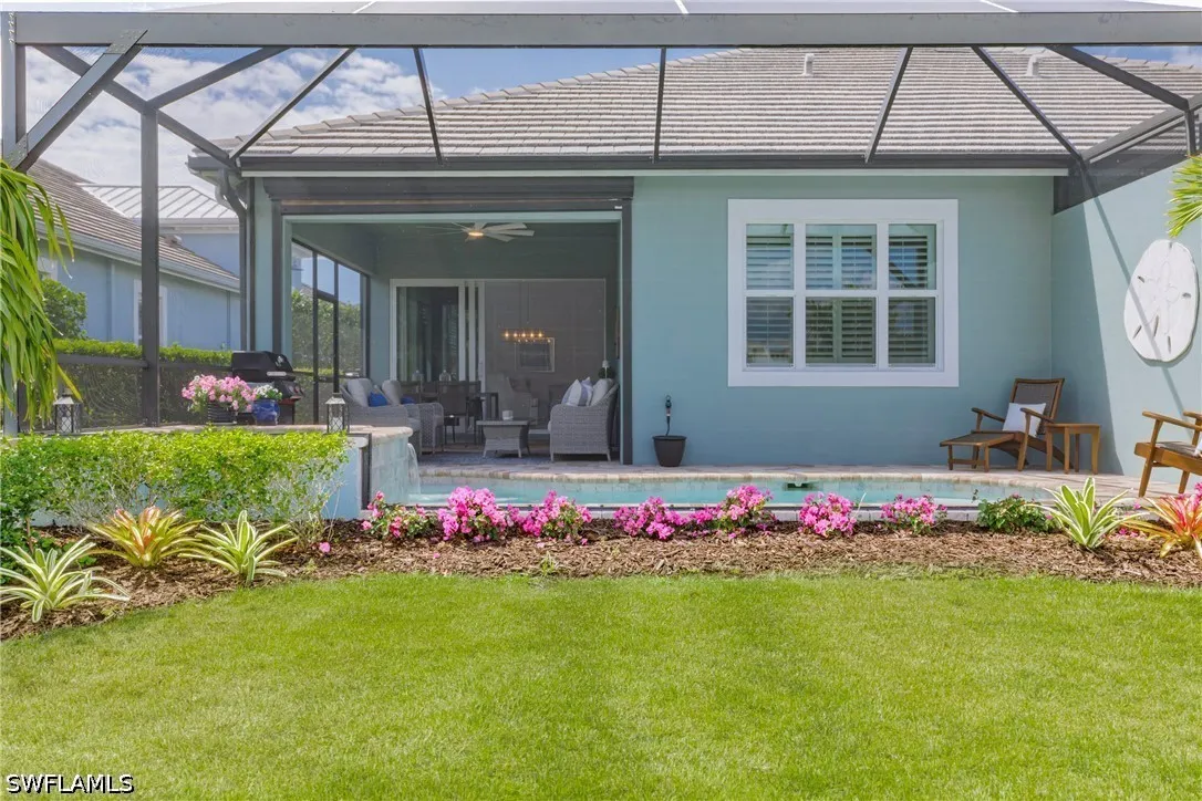 Welcome to this beautifully updated single-family home in the sought after Glen Eagles neighborhood in Pelican Sound, the areas finest bundled golf community. This elegant and tastefully updated home features an open great room floor plan designed for easy Florida living and entertaining. The chefs kitchen showcases granite countertops, Samsung stainless steel appliances, soft-close cabinetry, and a marble tile backsplash. The primary suite offers private lanai access, a walk-in closet, and a fully renovated en-suite bath with dual sinks, a walk-in shower with seamless glass, and a relaxing soaking tub. A separate guest wing provides two guest bedrooms and an updated bath with granite countertop and frameless shower door, ensuring comfort and privacy for visitors. Outdoor living shines with an expansive travertine-tiled lanai - perfect for alfresco dining or morning coffee - complete with an oversized in-ground spa and picture-frame screened enclosure overlooking the golf course and a stunning bougainvillea bush. Additional upgrades include new decorative ceramic tile throughout the living areas, hurricane screens, newer A/C and water heater, a new roof (2019), and a two-car garage with epoxy flooring and built-in storage cabinets. This home blends style, quality upgrades, and exceptional indoor-outdoor living. This home is being sold turnkey furnished, ready for its new owner to move in and start living a dream lifestyle! If you are looking for an active lifestyle look no further: 27 holes of Championship golf, 14 pickleball, 8 tennis and 6 bocce courts. State of the art fitness center that is professionally staffed. Pelican Sound is nestled up to the Estero River with access to the Gulf. The community offers dry boat storage, kayaks, canoes and paddle boarding, along with a shuttle boat to Lovers Key State Beach Park. Minutes from RSW International airport and surrounded by fabulous shopping and restaurants. Start living the dream!