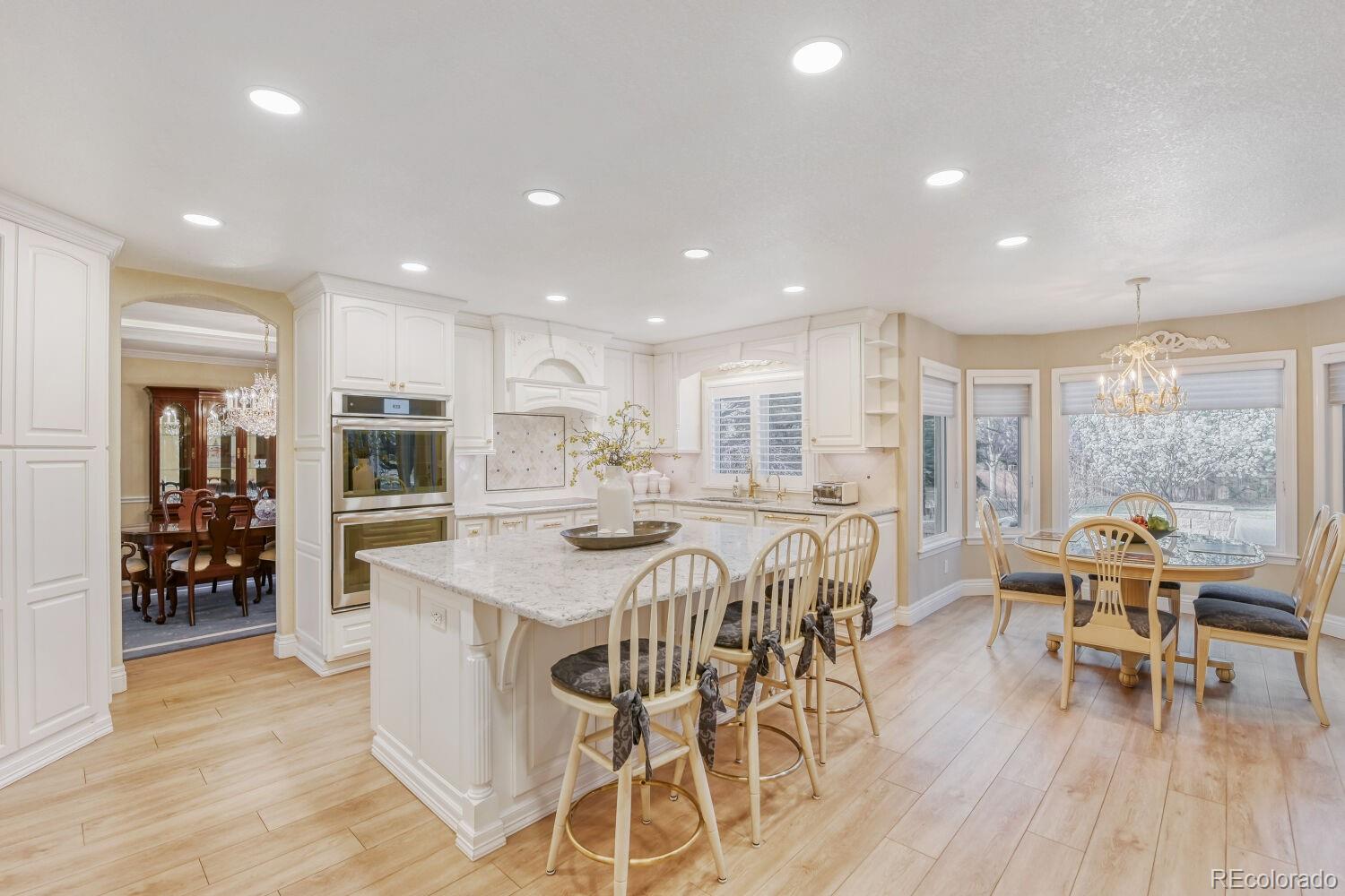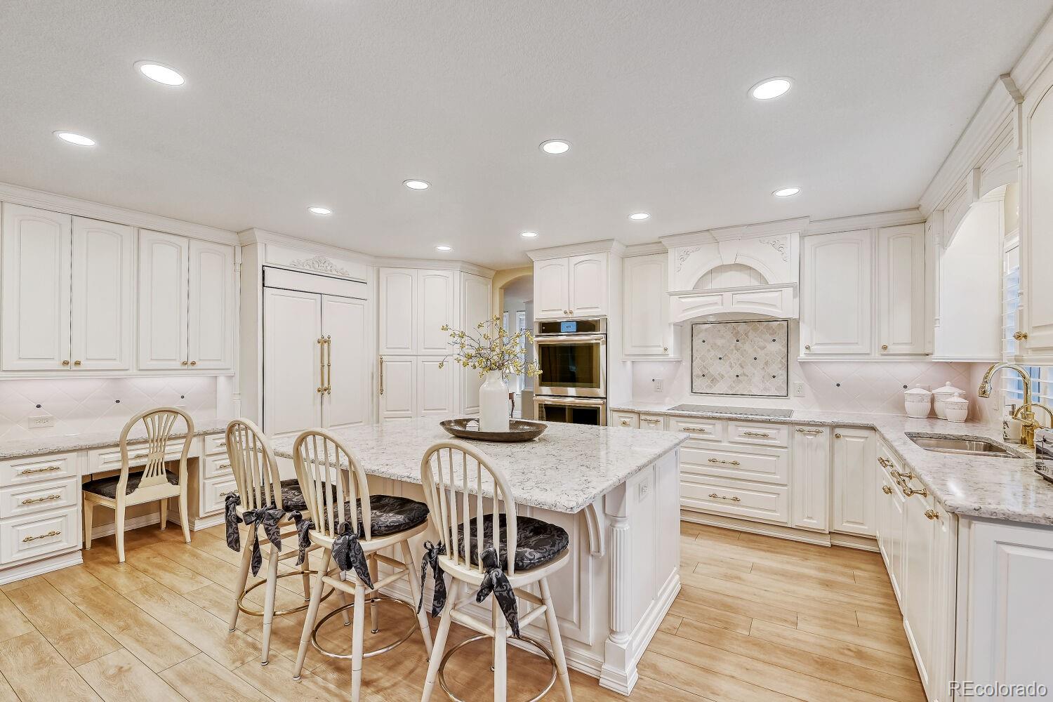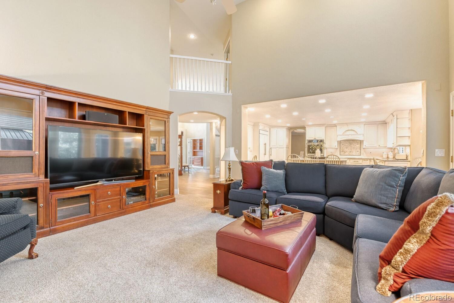 Highly sought-after Ranch Reserve 6-bedroom, 5-bath home offering expansive living spaces on a large, private lot. The beautifully landscaped yard features mature trees, curbing, a spacious back patio, and a charming backyard gazeboperfect for relaxing or entertaining. Inside, youll find a gourmet kitchen with a large quartz island, custom cabinetry, built-in refrigerator, island microwave, and an oversized walk-in pantry complete with multiple lazy Susans. The eat-in kitchen overlooks the serene, partially fenced backyard, while the formal dining room showcases elegant crown molding.The family room boasts soaring ceilings, a cozy gas fireplace, and built-in cabinets, creating a warm and inviting atmosphere. A large main-level office includes double built-in desks, drawers, and shelving. Additional main-floor highlights include a laundry room with sink, cabinets, built-in ironing board, LG washer and dryer, and a convenient half bath.Upstairs, the primary suite features double doors, a spacious sitting area, a 5-piece bath, and a large walk-in closet with organizers. Two linen closets provide extra storage. The upper level also includes a Jack and Jill bath and a third bedroom en suite with walk-in shower.The finished basement offers a large recreation room with a built-in bar area, microwave, and dishwasher, plus a bedroom with built-in cabinets and double closets, an additional bedroom with double doors and walk-in closet, a bathroom with solid surface counters and walk-in shower, and a dedicated storage room. Additional upgrades include radon mitigation, Culligan system, silhouette shades, plantation shutters, extended hardwood flooring, and a stunning stained glass front door.Complete with a 3-car garage featuring built-in cabinets and overhead storage, this home is ideally located near shopping, trails, transit, golf courses, DIA, and I-25.