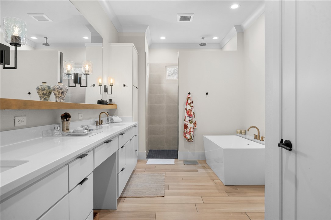 This stunning 4-bedroom, 4.5-bath modern home in Greens Prairie Reserve offers incredible space, thoughtful design, and high-end finishes throughout. Featuring double metal and glass front doors, charming private courtyards, and a striking brick-lined accent wall with fireplace. The open-concept living, kitchen, and dining area is ideal for entertaining or everyday living, with expansive windows that fill the home with natural light. The chef's kitchen features upgraded GE Cafe Series appliances, custom cabinetry, quartz countertops, a large island, morning bar, walk-in pantry, double ovens, microwave drawer, and a beverage/bar area with a second sink. From the kitchen, step directly into one of the home's two inviting courtyards, perfect for relaxing or hosting guests. An outdoor kitchen extends the entertaining space even further. The primary suite is a private retreat with large windows and soaring 12–13 ft ceilings with direct access to the second courtyard. Enjoy a freestanding soaking tub, oversized walk-in shower, and a custom closet that conveniently connects to the laundry room. Downstairs includes two additional bedrooms with en-suite baths and spacious closets, a powder bath, and a mud bench area for everyday convenience. Upstairs you'll find a fourth bedroom, full bath, and a spacious media/bonus room, along with walk-in attic access featuring extensive decked storage. Don't miss this opportunity and schedule your private showing today.