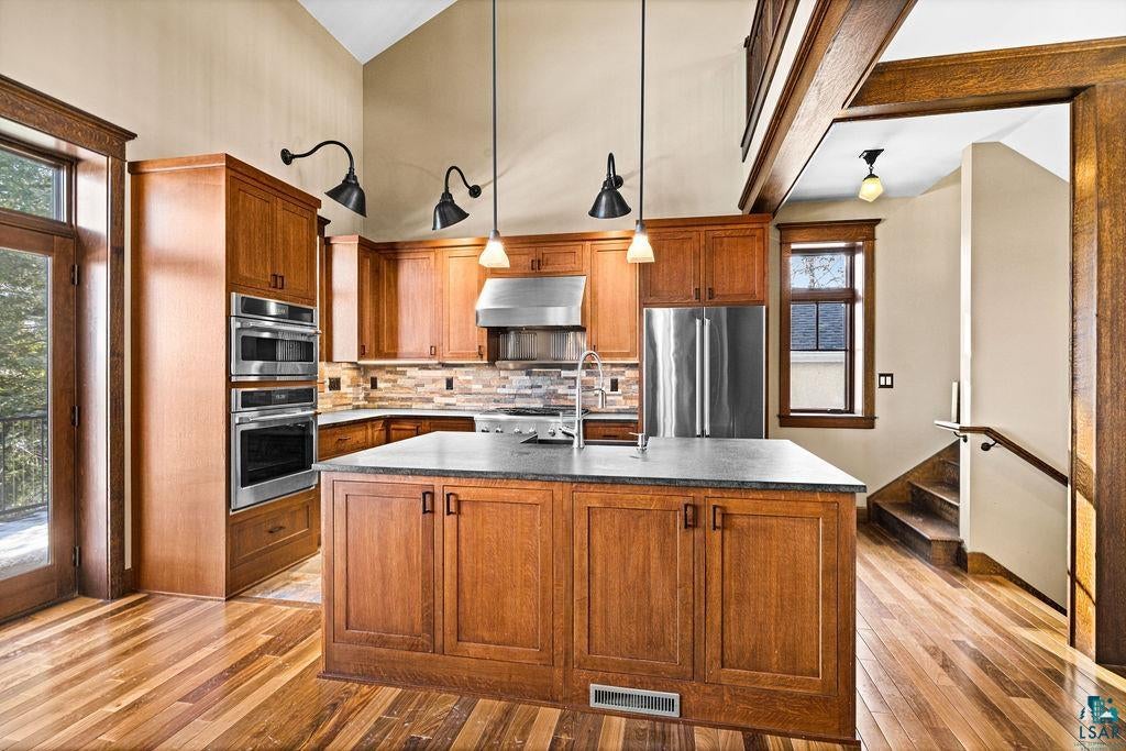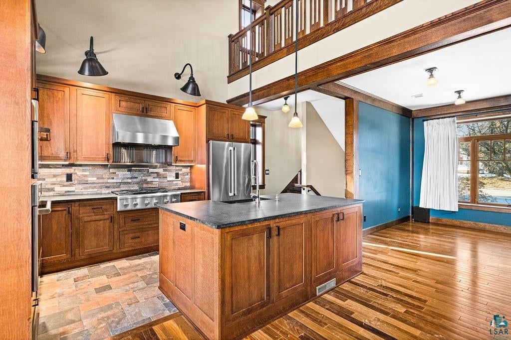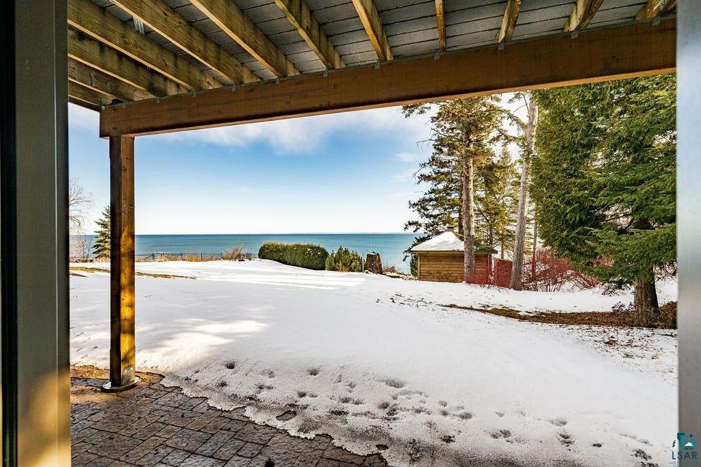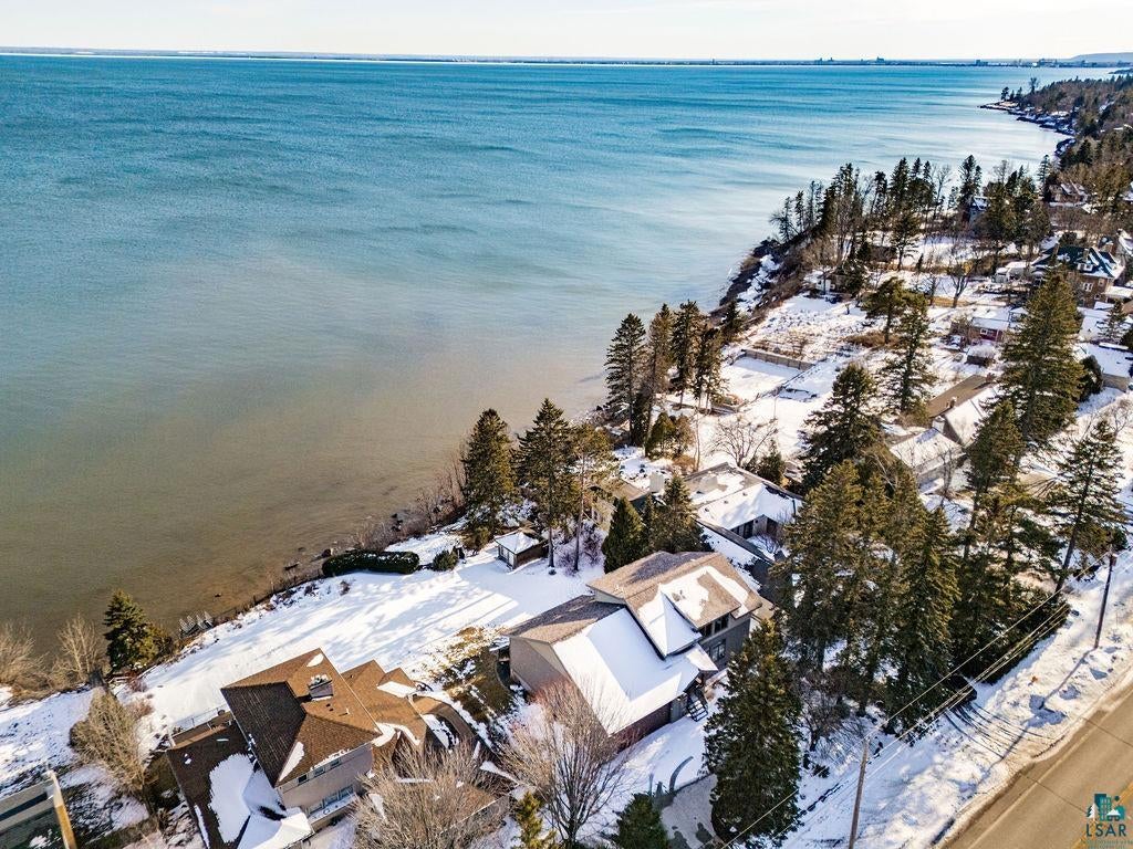 This architecturally designed, exceptionally constructed newer home on Lake Superior offers classic style, thoughtful design, and breathtaking waterfront views. Every detail reflects outstanding craftsmanship and quality, with premium materials chosen to complement its stunning lakeside setting. The open, light-filled main level features a seamless flow between the living room, dining area, and chef-inspired kitchen. Expansive windows and sliding glass doors open to a deck overlooking the waterperfect for effortless indoor-outdoor living. Vaulted ceilings and beautiful custom wood finishes add a sense of warmth and distinction to this impeccably designed space. A spacious loft overlooks the main level, creating a flexible retreat ideal for guests, a study, or a cozy lounge with panoramic lake views. On the walkout lower level, the primary suite offers a peaceful escape with a walk-in closet, private bath, and direct lake access. Additional highlights include a generous laundry room, pet-wash station, secure walk-in vault, and functional utility space. Outdoors, a charming screened lake room and brick fireplace invite evening gatherings by the shore, where every sunset reflects the artistry and beauty of Lake Superior living.