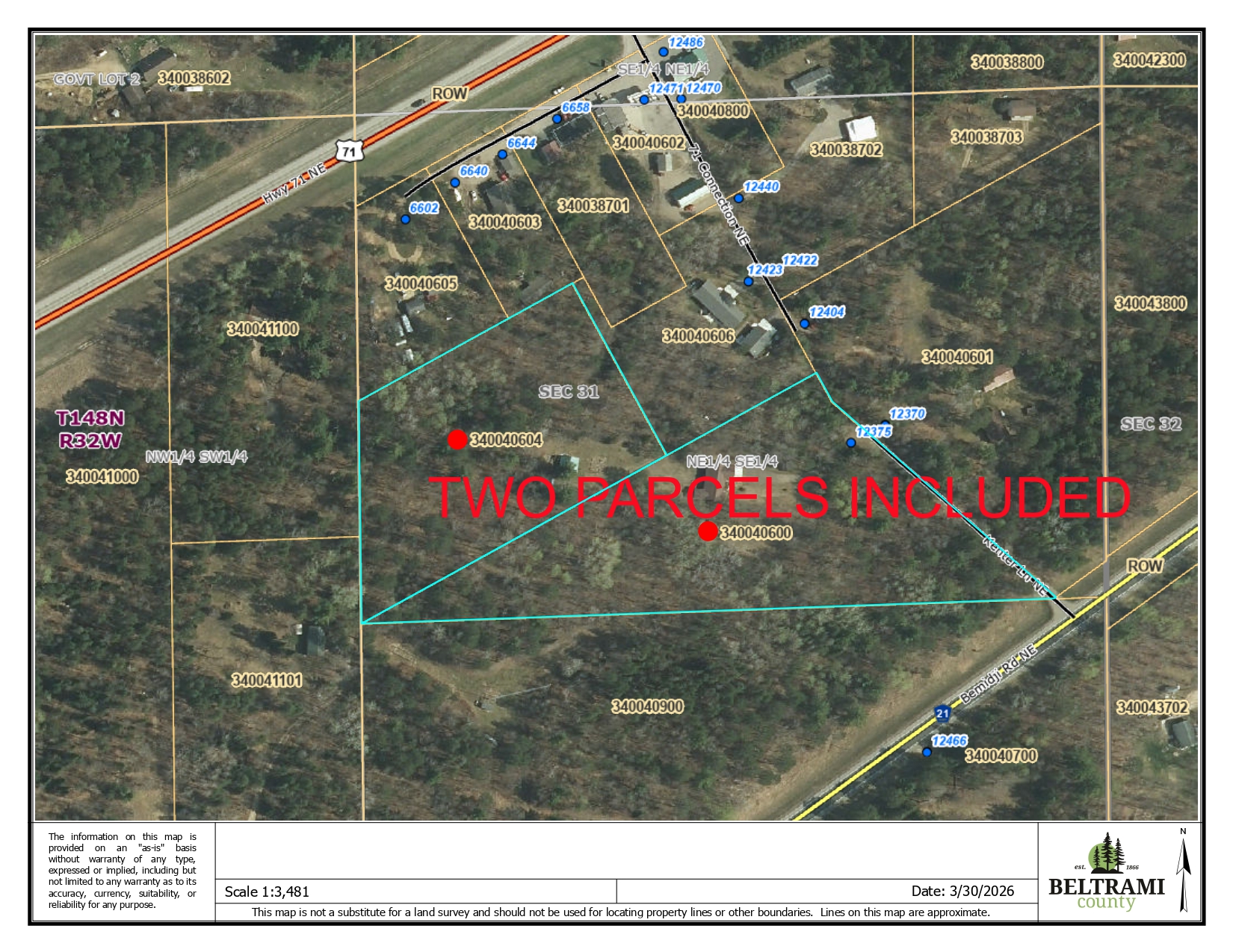 North on Bemidji Ave/ Old 71 to 12375 Kenter LN NE on north/left side of road turn left stay left to house.