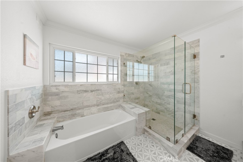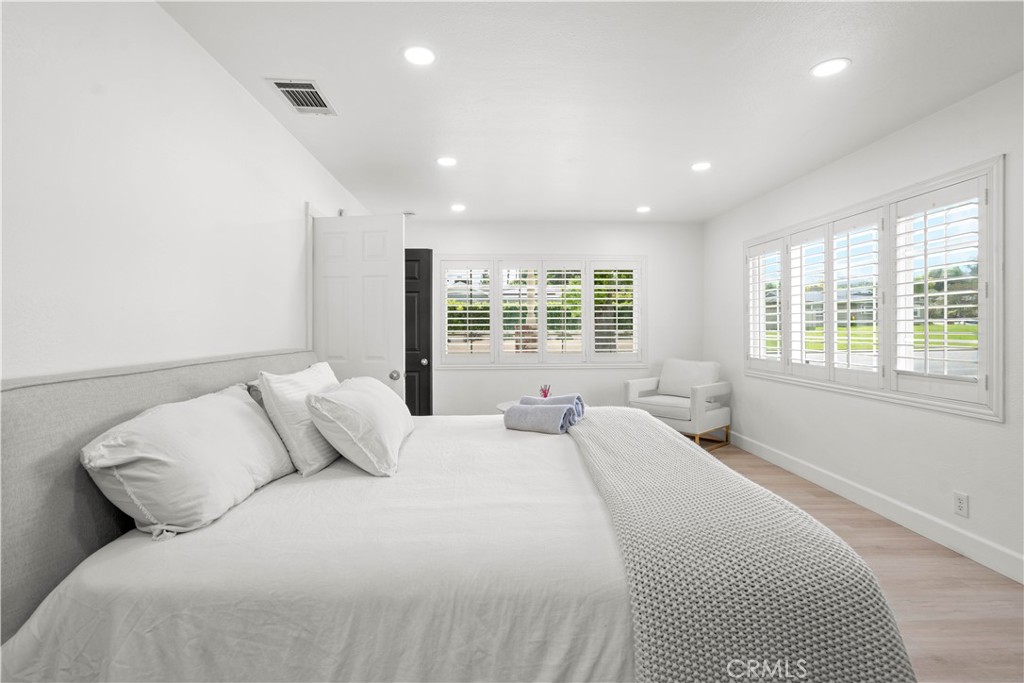 Beautifully upgraded 4-bedroom, 2.5-bathroom home offering a spacious and functional layout with modern finishes and resort-style outdoor living. Step inside to an open-concept floor plan featuring wide-plank flooring, recessed lighting, and abundant natural light throughout. The kitchen is a standout, showcasing quartz countertops, a large center island with seating, custom two-tone cabinetry, designer hardware, and stainless steel appliances including double ovens ideal for both everyday living and entertaining. The home offers multiple living areas, including a comfortable family room with a brick fireplace that creates a warm and inviting gathering space. The expansive primary suite serves as a true retreat, featuring its own fireplace, a spacious sitting area, and a large walk-in closet with built-in storage. Additional bedrooms are generously sized and thoughtfully laid out. Secondary bedrooms offer ample closet space and natural light, providing flexibility for guests, home office, or multi-generational living. One bedroom is well-suited for private guest quarters or workspace, while another offers comfortable proportions ideal for everyday living. The primary bathroom has been tastefully updated with dual vanities, a soaking tub, and a separate walk-in shower with modern finishes. The home includes well-appointed secondary bathrooms with updated finishes that complement the overall design. Step outside to a private backyard designed for relaxation and entertaining. The pool and spa are complemented by custom shade sails, creating a resort-like setting ideal for outdoor dining, lounging, and gatherings. Multiple patio areas and a low-maintenance layout enhance usability and year-round enjoyment. Additional features include plantation shutters, updated lighting, and a well-maintained interior with thoughtful upgrades throughout. Conveniently located near shopping, dining, schools, and major commuter routes, this home offers a blend of comfort, style, and functionality.