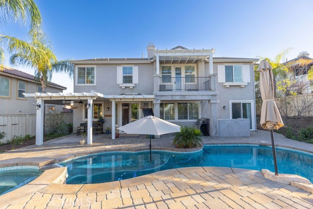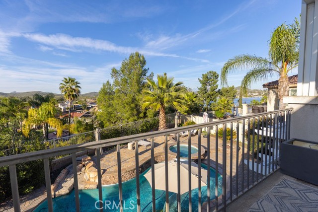 POOL SPA PAID-OFF SOLAR WHOLE HOUSE FAN MAIN LEVEL BEDROOM CANYON LAKE VIEWS CUL-DE-SACThis Stunning pool home is located on a cul-de-sac in the highly desirable Tuscany Hills community with panoramic hill and Canyon Lake views and no rear neighbors. This spacious 5-bedroom, 5-bath home offers 4,021 sq ft with a 3-car tandem garage on an 8,276 sq ft lot. Energy-efficient upgrades include paid-off solar, dual A/C units, a tankless water heater, and a whole-house fan.The backyard is an entertainer's dream with a saltwater pool, spa, waterfall, and fire pits—perfect for enjoying sunset views.Inside features cathedral ceilings, two gas fireplaces, and a gourmet kitchen ideal for entertaining. The flexible floor plan includes a main-level primary bedroom or private in-law suite with a full bath. Upstairs offers a loft, Jack & Jill bath, 4 additional Bedrooms, and a Home Theater with a Projector. The Primary suite includes a Private balcony, walk-in closets, a jetted tub, a walk-in shower, and dual vanities.Residents enjoy resort-style HOA amenities including pools, spa, clubhouse, tennis courts, parks, and playgrounds, just minutes from Tuscany Hills Elementary and about 20 minutes to Temecula Valley Wine Country.