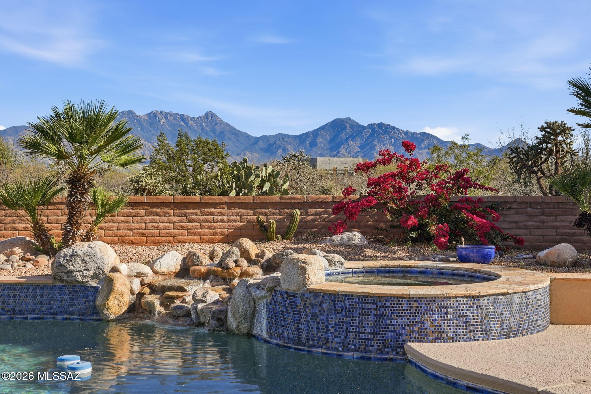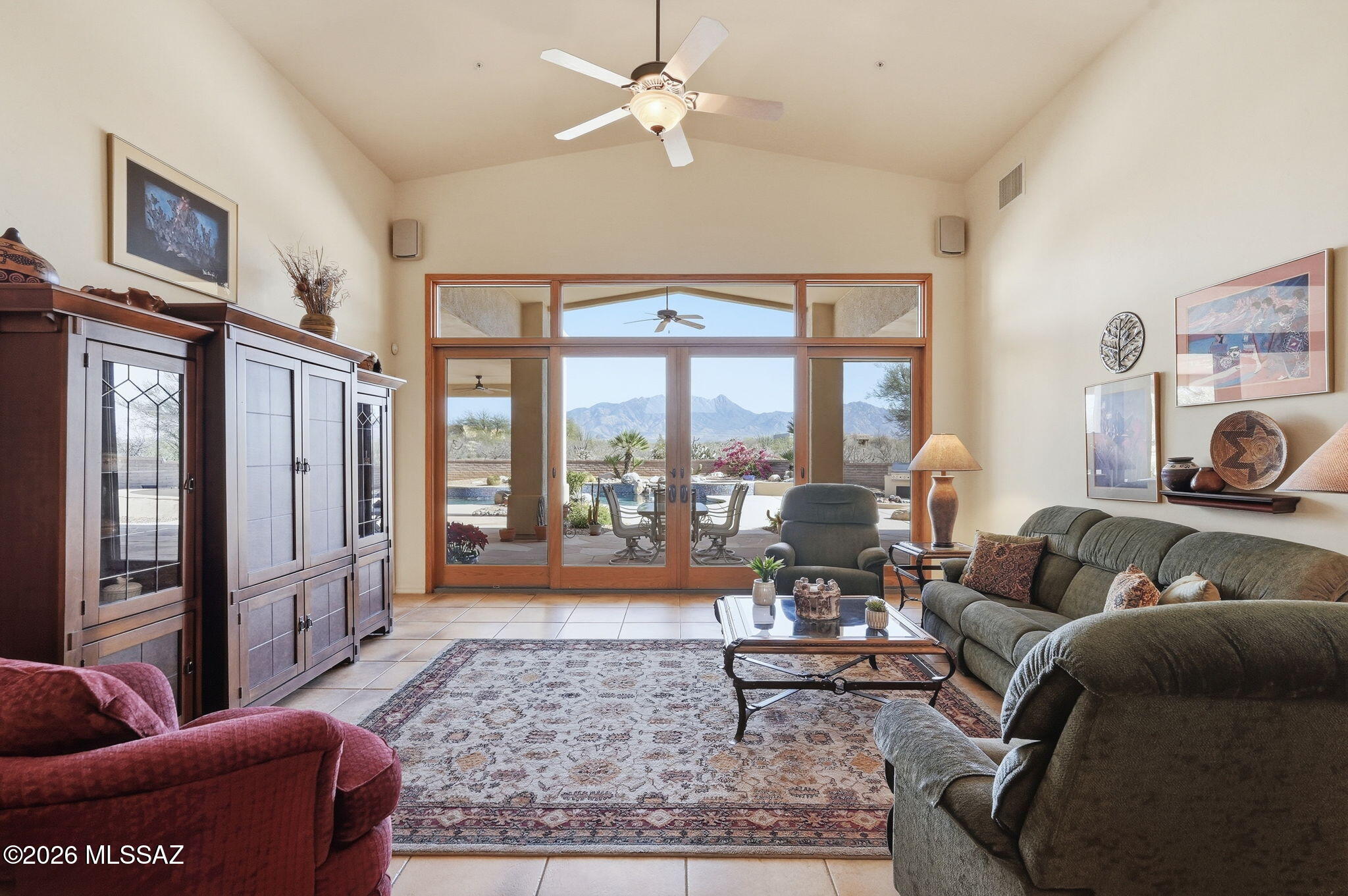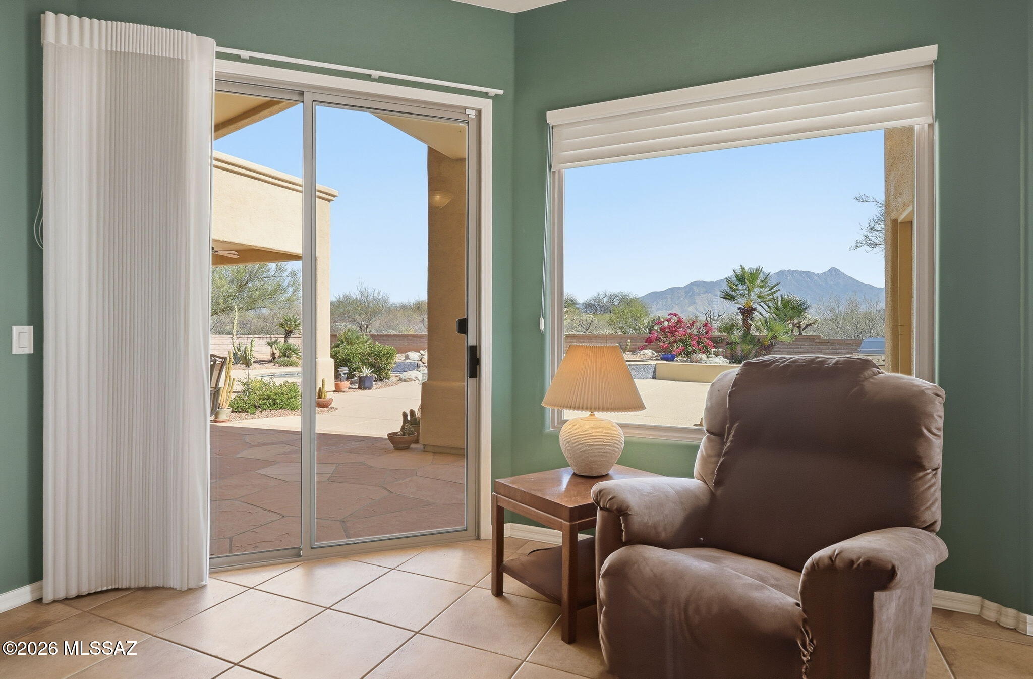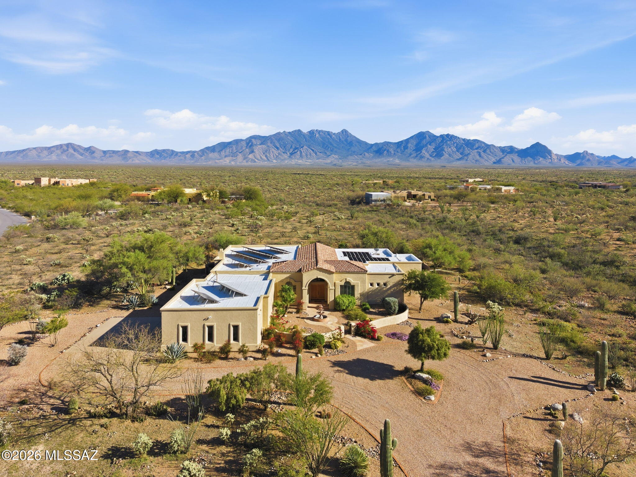 Framed by the breathtaking Santa Rita Mountains, this exceptional custom Dorn-built home in Pasadera sits on 4.14 private acres, offering sweeping desert views & refined Arizona living. A charming enclosed front courtyard with a decorative fountain welcomes you, setting the tone for the tranquility found throughout the property. The backyard is designed as a private desert retreat with a gas-heated pool & spa featuring a double waterfall, expansive Kool decking, a built-in BBQ, & a gas fire pit--perfect for entertaining while enjoying spectacular mountain sunsets. Inside, the home blends comfort & elegance. The gourmet kitchen features granite countertops, abundant custom cabinetry, double ovens, trash compactor, & under cabinet lighting. The adjoining family/game room is an entertainers dream with a billiards area, media center, and wet bar with wine fridge and mini fridge. A formal dining room with an illuminated tray ceiling adds a touch of sophistication for special gatherings. The split bedroom floor plan offers privacy, with the spacious primary suite capturing mountain views and featuring built-in cabinetry, dual vanities, a jetted soaking tub, custom tiled walk-in shower, and a large walk-in closet with custom organization. A dedicated office/den provides the perfect work-from-home space.Additional highlights include an expansive laundry room that doubles as a hobby room, a three-bay oversized garage with workshop and storage, and a soft-water hose bib for washing vehicles.Important upgrades include owned solar for low utility costs, HVAC replaced in 2016 (warranty through Sept 2026), dual-flush toilets, new service utility doors, and fresh exterior paint with updated landscape rock and drip irrigation.Surrounded by mature desert landscaping and towering saguaros, this remarkable property offers privacy, space, and unforgettable views. GVR membership is not included but can be added if desired.