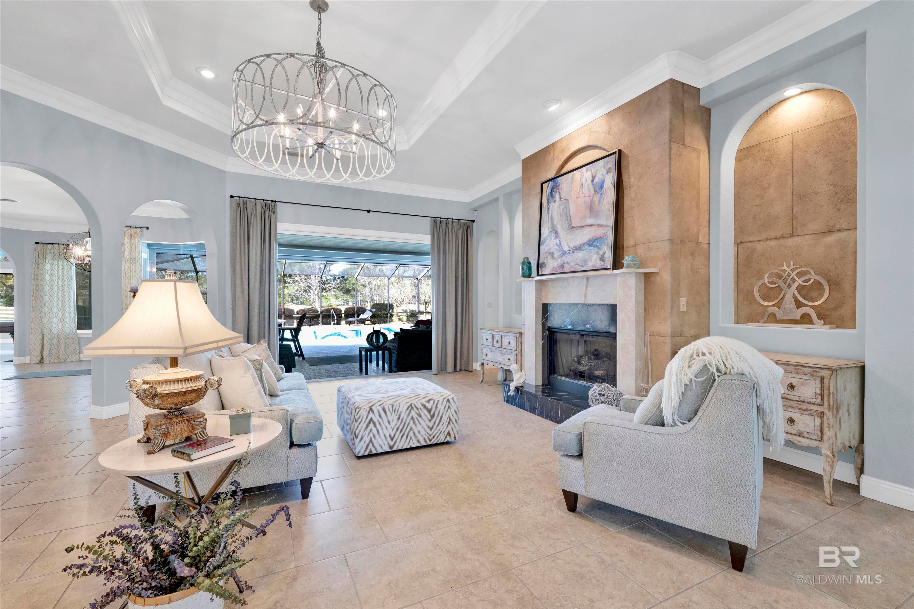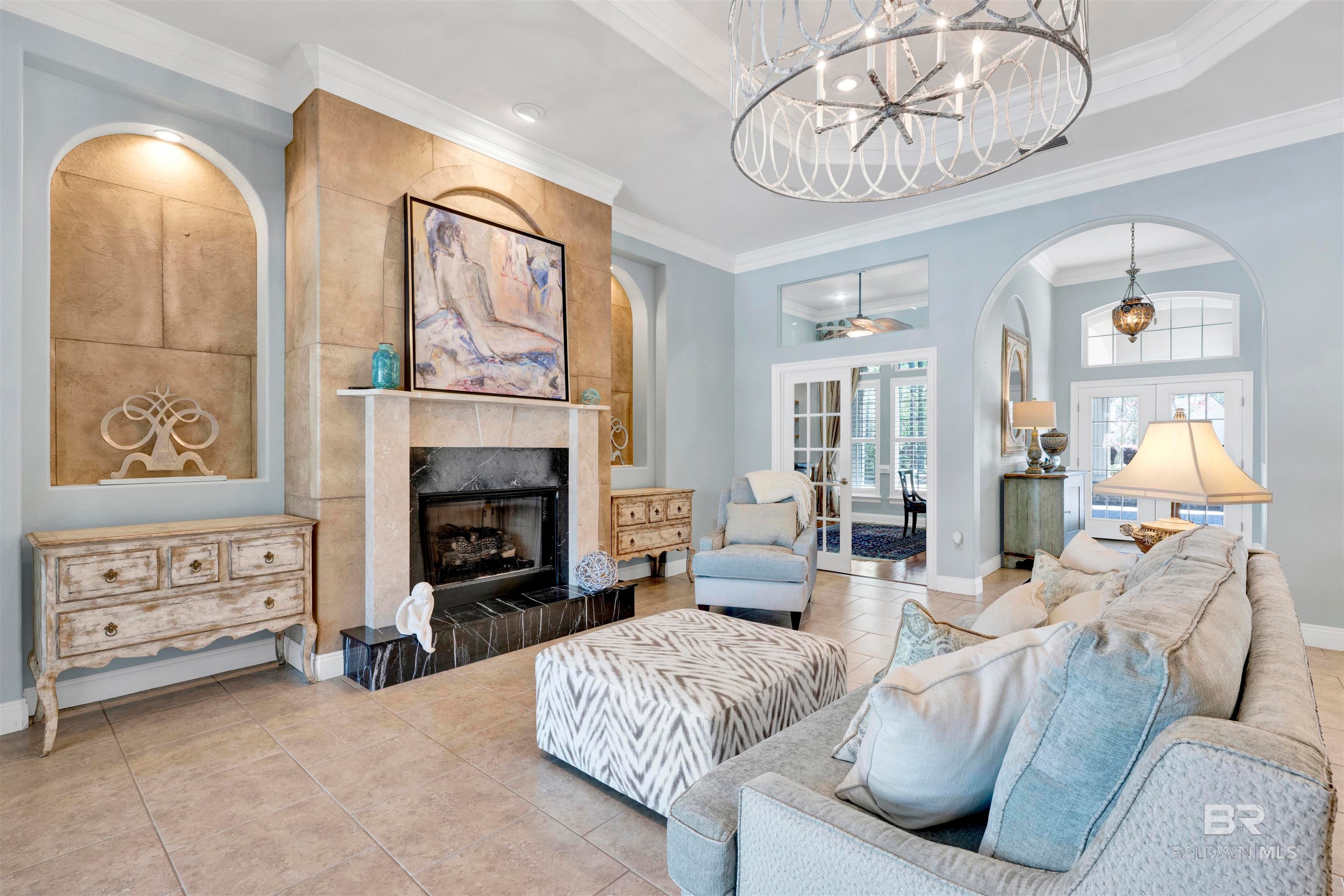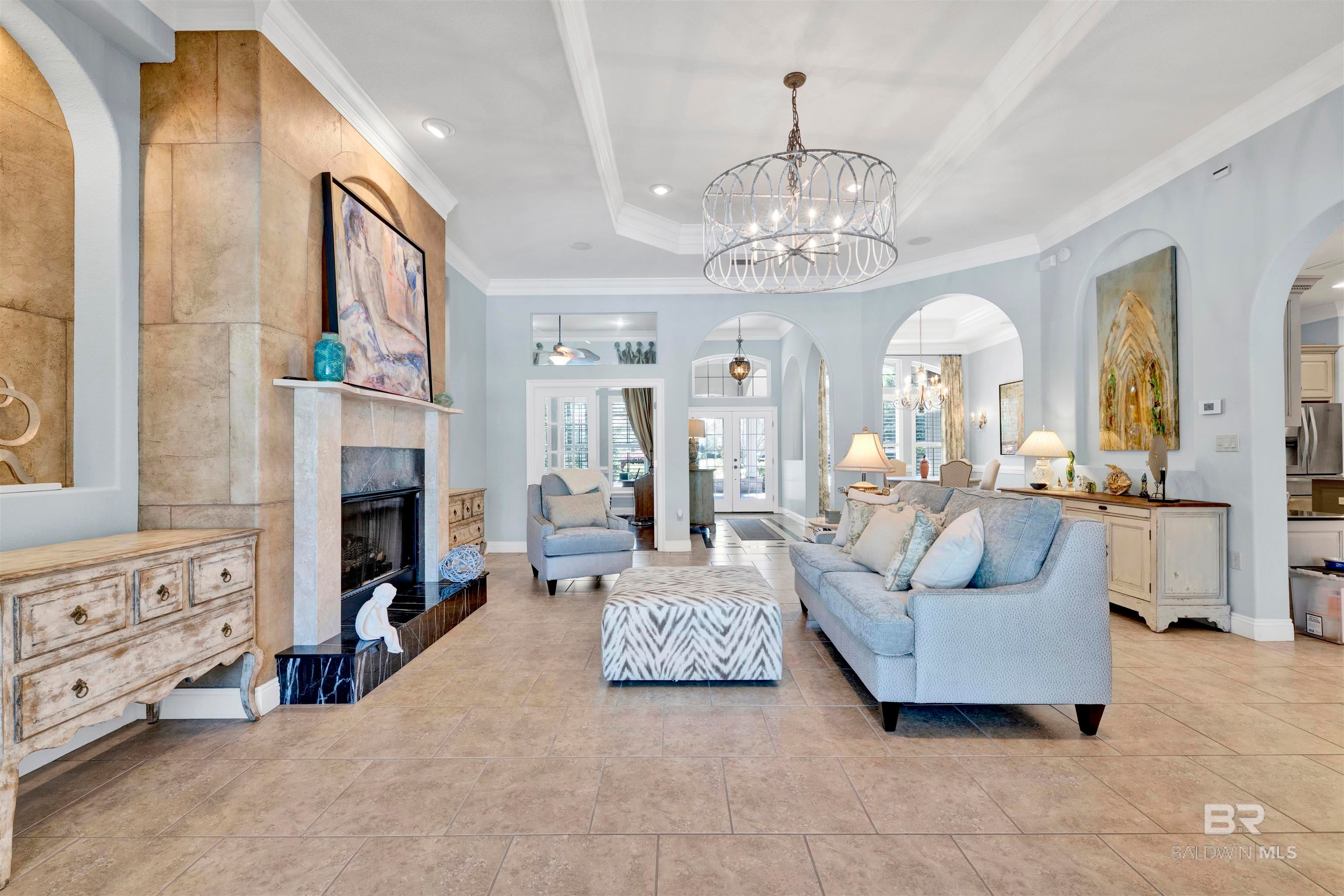627 Marina Circle greets you long before you step inside. Stately, mature trees cast dappled shade across mossy boulders and a gracefully curved driveway, setting a serene tone from the moment you arrive. The welcome continues with the soft gurgle of a tiered fountain just beyond the Saltillo tile breezeway.