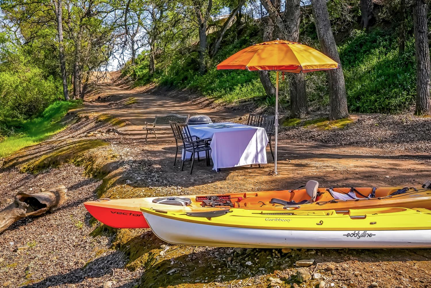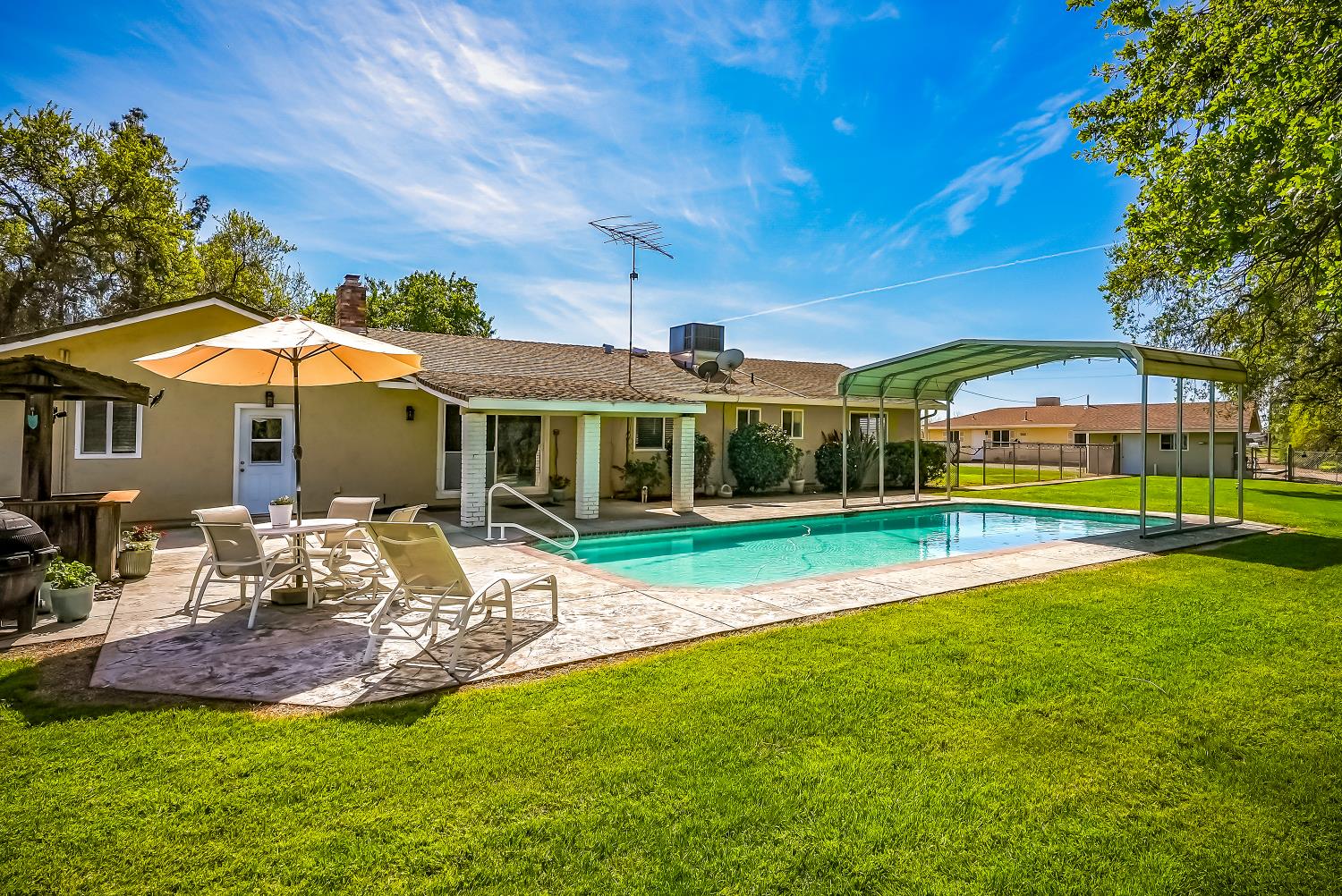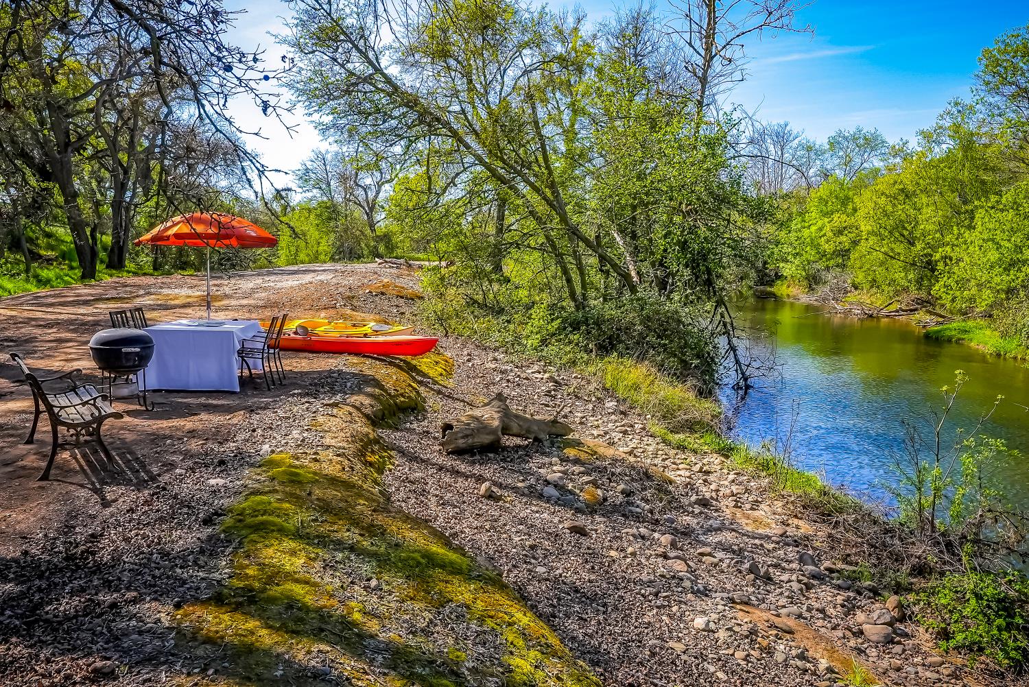 RIVER PROPERTY, 2 Homes, a rare find!!! Exceptional opportunity to own a private multi-residence ranch in the highly desirable Linden area. Set on 4.99 acres, this unique property features two single-story homes, a 3-bed, 2-bath main residence and a 2-bed, 1-bath secondary home, ideal for multi-generational living, rental income, or guests. Nestled among beautiful trees & surrounded by mature orchards and vineyards, the property offers an impressive 1,144 feet of treed waterfront with a private beach inside the electric-gated entry, providing a rare combination of privacy, natural beauty, and recreation. Equestrian-ready with a four-stall horse barn & tack room, cross-fencing, and plenty of space for horses, livestock, RVs, and toys. Additional improvements include a large shop with three 10-foot roll-up doors, a charming vintage barn, and a detached game room for flexible use. The main home features a spacious family room overlooking the pool and scenic grounds, gas fireplace, automatic sprinklers, and a two-car garage with a third bay converted to a private office. Owned solar adds efficiency and value. If you prefer horseback riding, ATV adventures, fishing, swimming or hiking on this scenic property, youll find it all within the ranchs fenced boundaries. Set in the heart of the highly desirable Linden area, there is plenty to explore on and off the Ranch. This property offers the perfect blend of comfort, convenience & outstanding amenities. With its versatile layout and stunning setting, this property also offers excellent potential as an event venue, wedding destination, or private retreat. Conveniently located just minutes from Lodi, Stockton, and Modesto, with easy access to the San Francisco Bay Area, this one-of-a-kind ranch blends privacy, functionality, and accessibility.