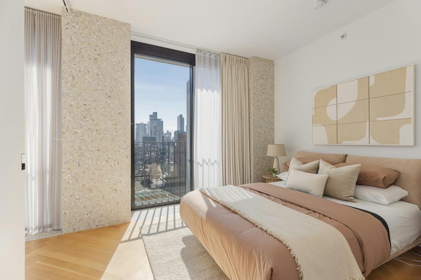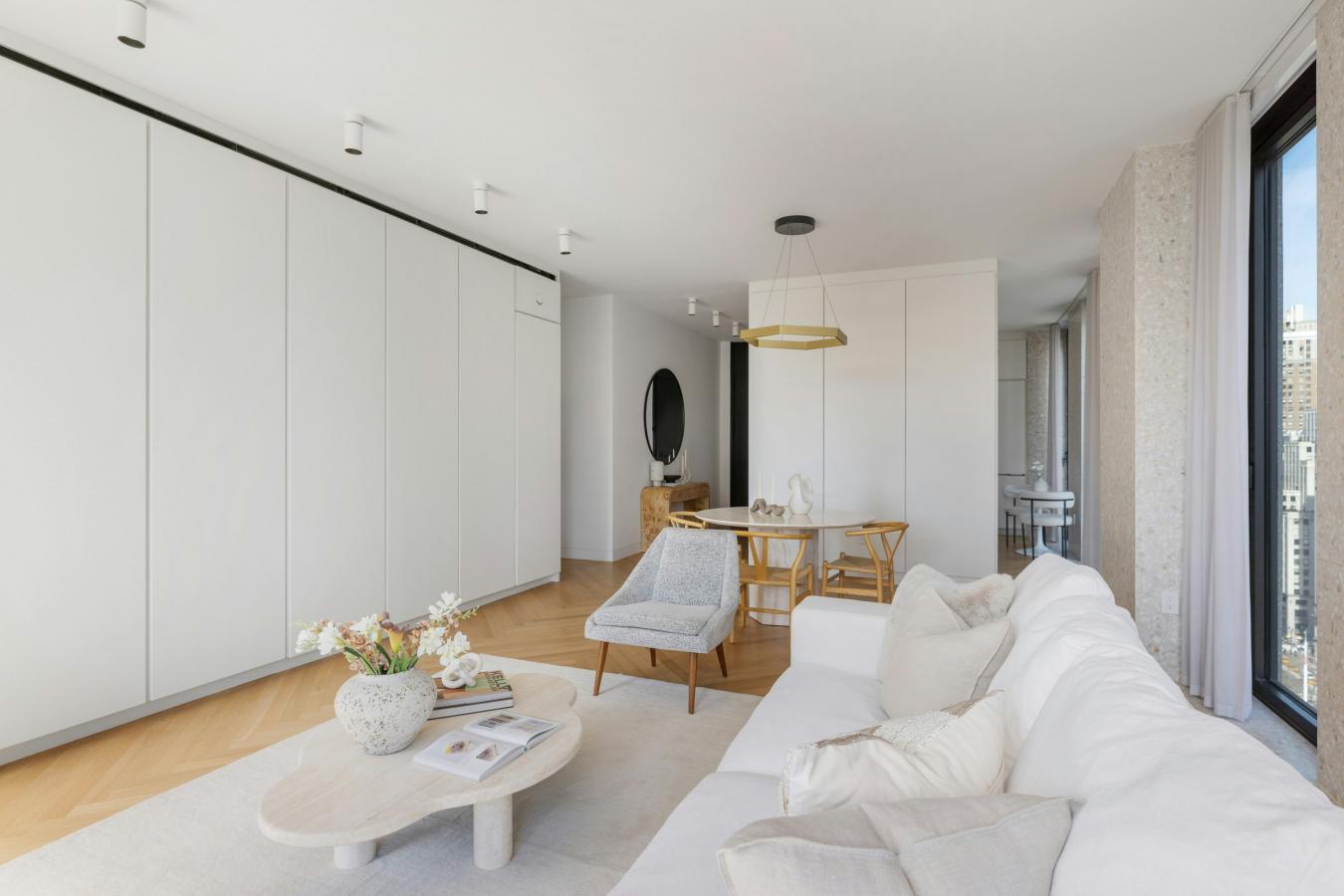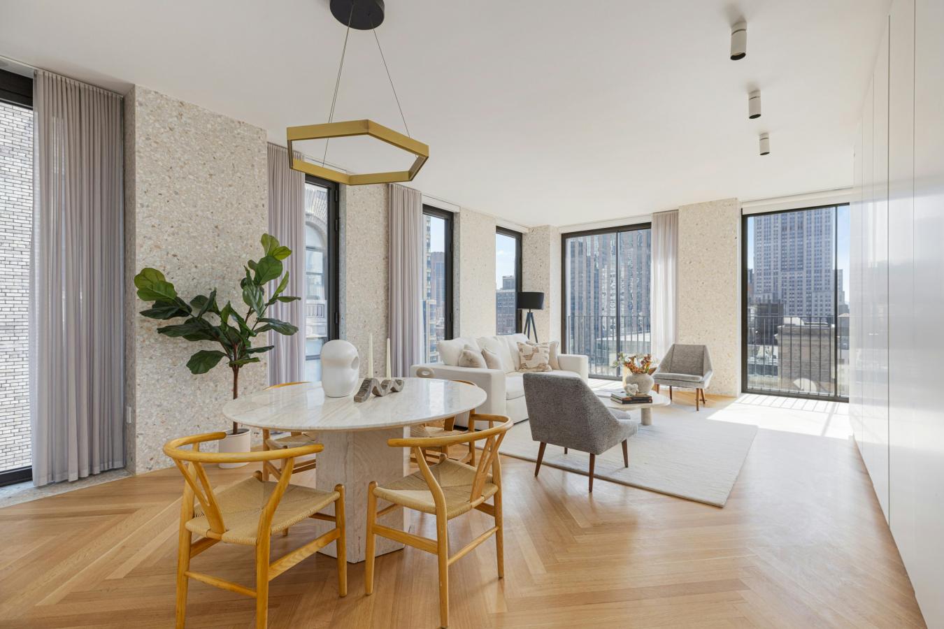 Residence 21D at The Bryant offers a rare opportunity to own a high-floor, corner one-bedroom with sweeping skyline views and a direct, unobstructed view of the Empire State Building. Spanning 1,067 square feet, this expansive home is flooded with natural light from twelve floor-to-ceiling windows with southern and eastern exposures.