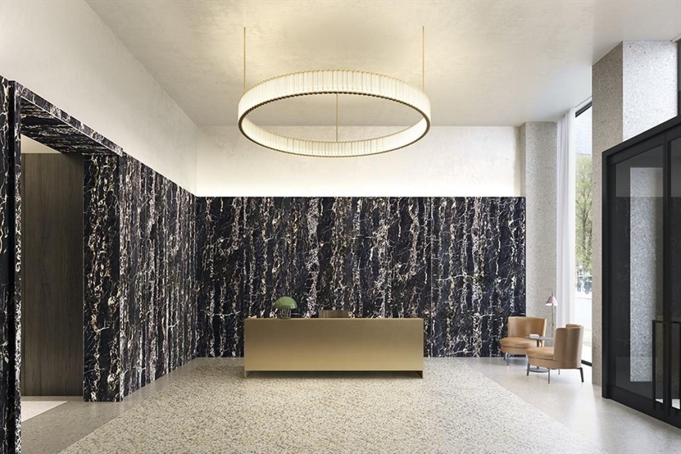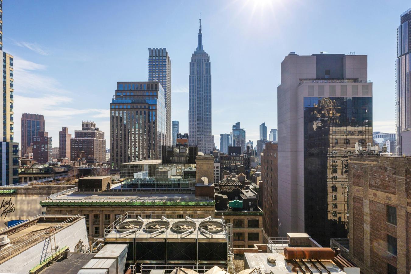 Residence 21D at The Bryant offers a rare opportunity to own a high-floor, corner one-bedroom with sweeping skyline views and a direct, unobstructed view of the Empire State Building. Spanning 1,067 square feet, this expansive home is flooded with natural light from twelve floor-to-ceiling windows with southern and eastern exposures. Striking Vitrocsa sliding glass doors open to Juliet balconies, inviting fresh air while showcasing panoramic views of Lower Manhattan. A gracious entry foyer leads into a bright and airy living and dining area, perfectly suited for both everyday living and entertaining. The separate, windowed chefs kitchen is thoughtfully designed with sleek white lacquer cabinetry, Calacatta Gold marble countertops and backsplash, and a full suite of premium Gaggenau appliances, including a fully vented range. The residence showcases the buildings signature custom marble terrazzo detailing, which extends seamlessly into the interiors, creating refined architectural lines and a modern aesthetic. These design elements are complemented by 96" ceilings and beautiful heated oak herringbone floors throughout. The south-facing bedroom enjoys stunning Empire State Building views and ample custom closets. The spa-like ensuite bathroom is elegantly finished in Statuarietto marble with terrazzo floors, and includes a marble vanity and a luxurious wet room with a rain shower and deep soaking tub enclosed in custom Bendheim glass. Additional highlights include central air conditioning, motorized shades, and an in-unit miele washer and dryer. Designed by Pritzker Prize-winning David Chipperfield Architects, the residence features bespoke millwork exclusive to The Bryant, seamlessly concealing storage, appliances, and mechanical systems for a clean, sophisticated look. The Bryant, located at 16 West 40th Street directly across from Bryant Park, is a boutique full-service condominium offering a 24-hour attended lobby, fitness center with sauna, resident lounge, and exclusive access to the Terrace Club with fireplace and full bar. Ideally positioned in the heart of Manhattan, the building provides immediate access to world-class shopping along Fifth Avenue, as well as premier dining and cultural destinations. We look forward to hearing from you and would be delighted to show you this exquisite home.