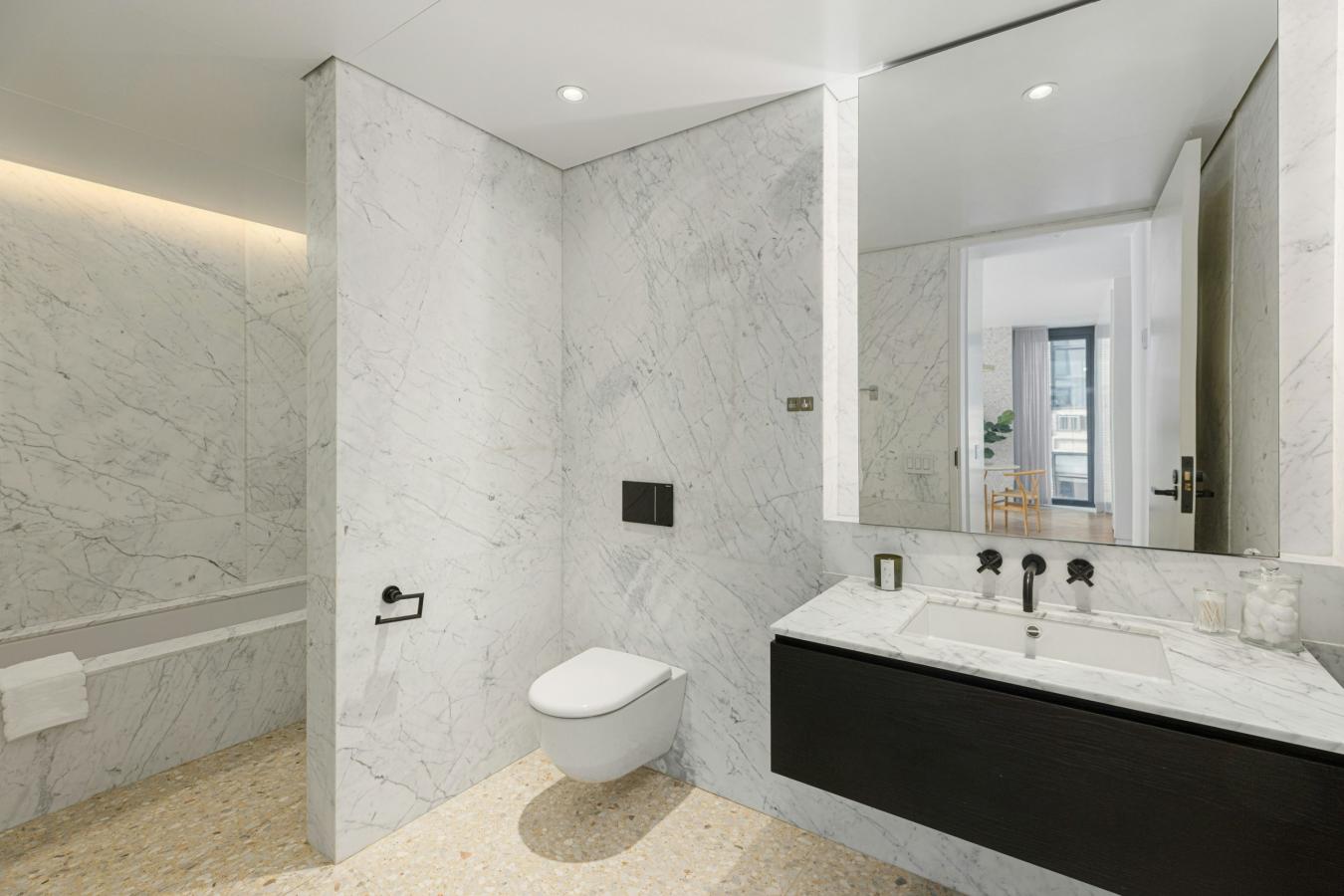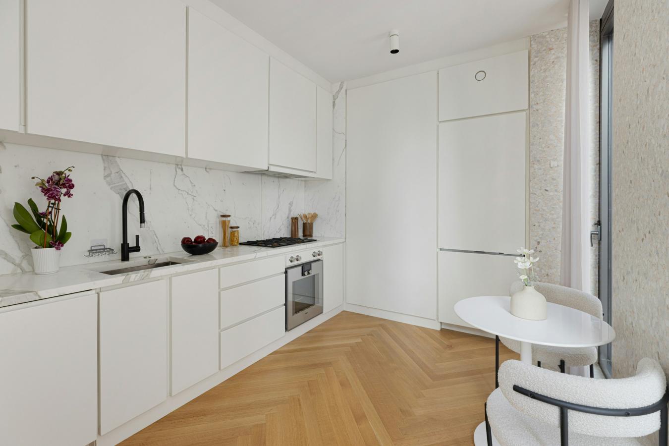 Downtown buyers are often forced to choose: light or separation, views or calm, or architecture or ease. This home is compelling because it resolves those tradeoffs unusually well. At 1,681 square feet, this two-bedroom, two-and-a-half-bath residence is laid out in a way that makes daily life feel easier from the moment you enter. The living and dining space is open and bright, but not loose or undefined. Floor-to-ceiling windows pull in the Hudson River and skyline, while 10-foot ceilings and wide-plank white oak floors give the apartment real depth without making it feel cold. The effect is not just visual. The room feels lifted, composed, and easy to live in. The kitchen is part of that experience. It stays connected to the room without taking it over, with a large island that works equally well for breakfast, conversation, or serving a full dinner. White oak cabinetry, lava stone countertops, Miele appliances, and Zucchetti fixtures keep the material palette refined yet durable rather than merely decorative. It is a kitchen designed for someone who actually uses it. What sets the apartment apart is the way it handles separation. The primary suite is not simply large; it feels removed. South-facing and quiet, it gives you a real shift away from the gathering rooms. The bathroom continues that logic with dual sinks, an oversized shower, a deep soaking tub, and a separate water closet, all finished in a restrained palette that feels restorative rather than showy. The second bedroom sits on the opposite side of the home, which matters. It gives guests, your household, or a work-from-home setup genuine independence instead of token privacy. Its western exposure brings in sunset light and river views, and the en-suite bath is finished with the same level of care, so the room never feels secondary. A proper entry foyer, powder room, vented laundry, and multi-zoned climate control remove friction. The apartment works because it anticipates how you actually live. 565 Broome Street is a 30-story, 112-unit full-service luxury condominium designed by Pritzker Prize-winning architect Renzo Piano and developed by Bizzi & Partners in 2016. The building pairs architectural pedigree with a level of service and infrastructure that makes day-to-day life materially easier, beginning with a private covered porte-cochre for discreet, seamless arrival. Its 17,000 square feet of amenities are comprehensive without feeling excessive: a 55-foot indoor heated pool, a steam room, a sauna, a fitness studio, a yoga room, a playroom, and a landscaped residents lounge with a live green wall and library. A 24-hour doorman and concierge complete the experience, giving the building the kind of support system that buyers at this level expect and use. Homes like this are rare not because of any one feature, but because so few combine light, outlook, separation, and full-service support without requiring something larger, less efficient, or harder to live in. Once you see how cleanly this residence resolves those tradeoffs, it becomes difficult to replace.