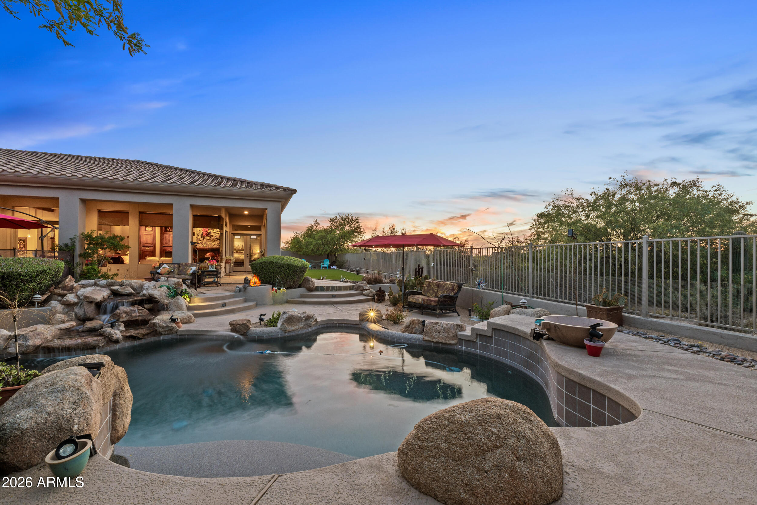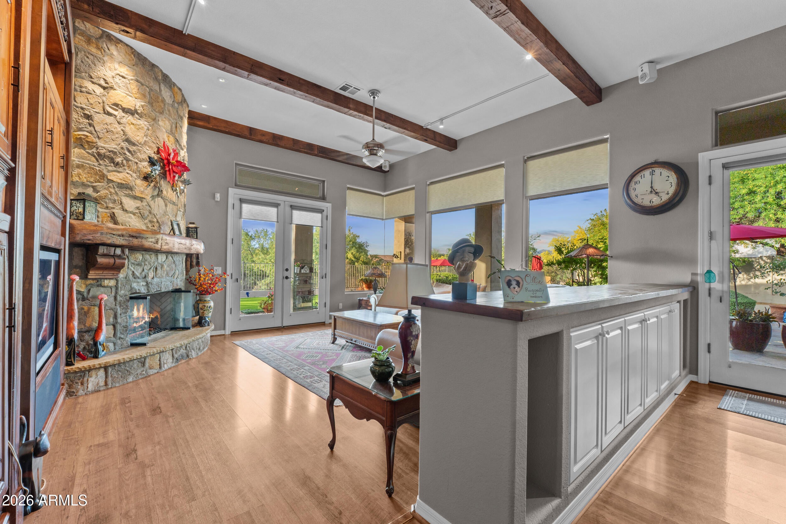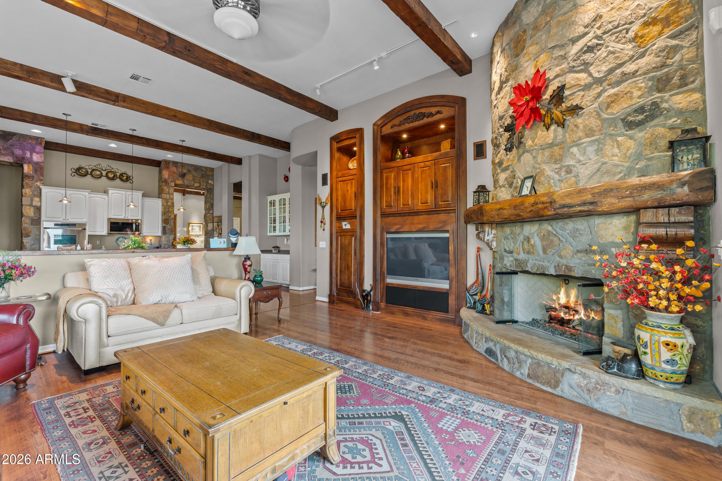 Enjoy the best of both worlds--just a 15-minute, stress-free drive from the new TSMC chip plant, yet tucked away in the peaceful Sonoran Desert countryside of Cave Creek. This meticulously upgraded early 21st-century desert gem offers 3,680 sq ft of living space and over 5,500 sq ft under roof, blending timeless craftsmanship with modern efficiency.Inside, the home features R-42 insulation and insulated interior walls for superior energy efficiency and sound control. The main living areas are enhanced with custom architectural solid wood beams, elegant built-in wood features, and striking natural fieldstone accents that flow seamlessly through the living room, kitchen, bar, and family spaces.Crypto is accepted A breathtaking 12-foot custom stone fireplace with a dual A&B flue system allows for both wood-burning and natural gas use, topped with a one-of-a-kind mantel crafted from a 100-year-old reclaimed Michigan barn beam.A standout feature is the fully customized art studio by California Closets, complete with built-in cabinetry, a retractable desk, hidden sliding double doors, and five expansive windows, including a dramatic negative-edge window that fills the space with natural light.The home offers a highly desirable private guest suite/mother-in-law quarters with 2 bedrooms, 1 full bath, three private entrances, and a connecting door to the mudroom--ideal for multi-generational living, guests, or rental income.The garage is fully upgraded with over 10,000 in custom-built storage and workspace solutions, complemented by sleek epoxy flooring.Step outside to your own private retreat featuring a newly remodeled lagoon-style PebbleTec pool (2025) with elevated Kool Deck, multi-speed pump, and stunning natural stone water features, including a two-way waterfall and decorative water bowls. Additional exterior highlights include 600 sq ft of artificial turf for low-maintenance living.Recent updates provide peace of mind, including fresh interior and exterior paint (2023 & 2025), new Berber carpet (November 2025), hand-refinished Corian countertops (May 2025), and a roof inspection, maintenance, and certification completed in May-June 2025.This exceptional property offers a rare combination of luxury finishes, functional design, flexibility, and income potential--all set within a serene desert landscape with surrounding natural open spaces. A truly one-of-a-kind opportunity in Cave Creek.