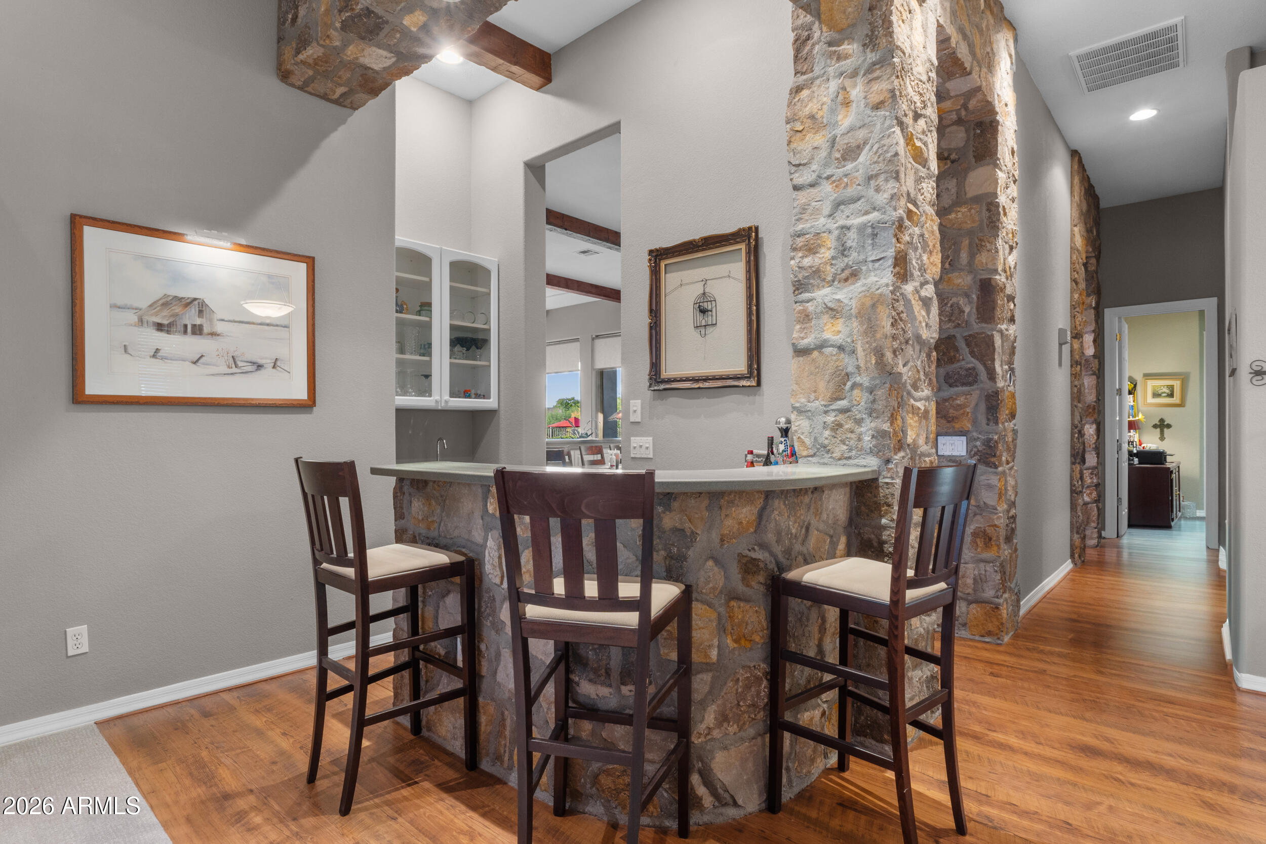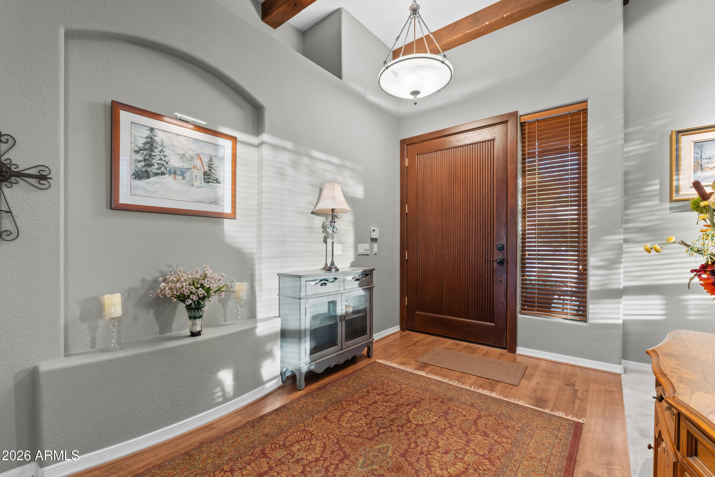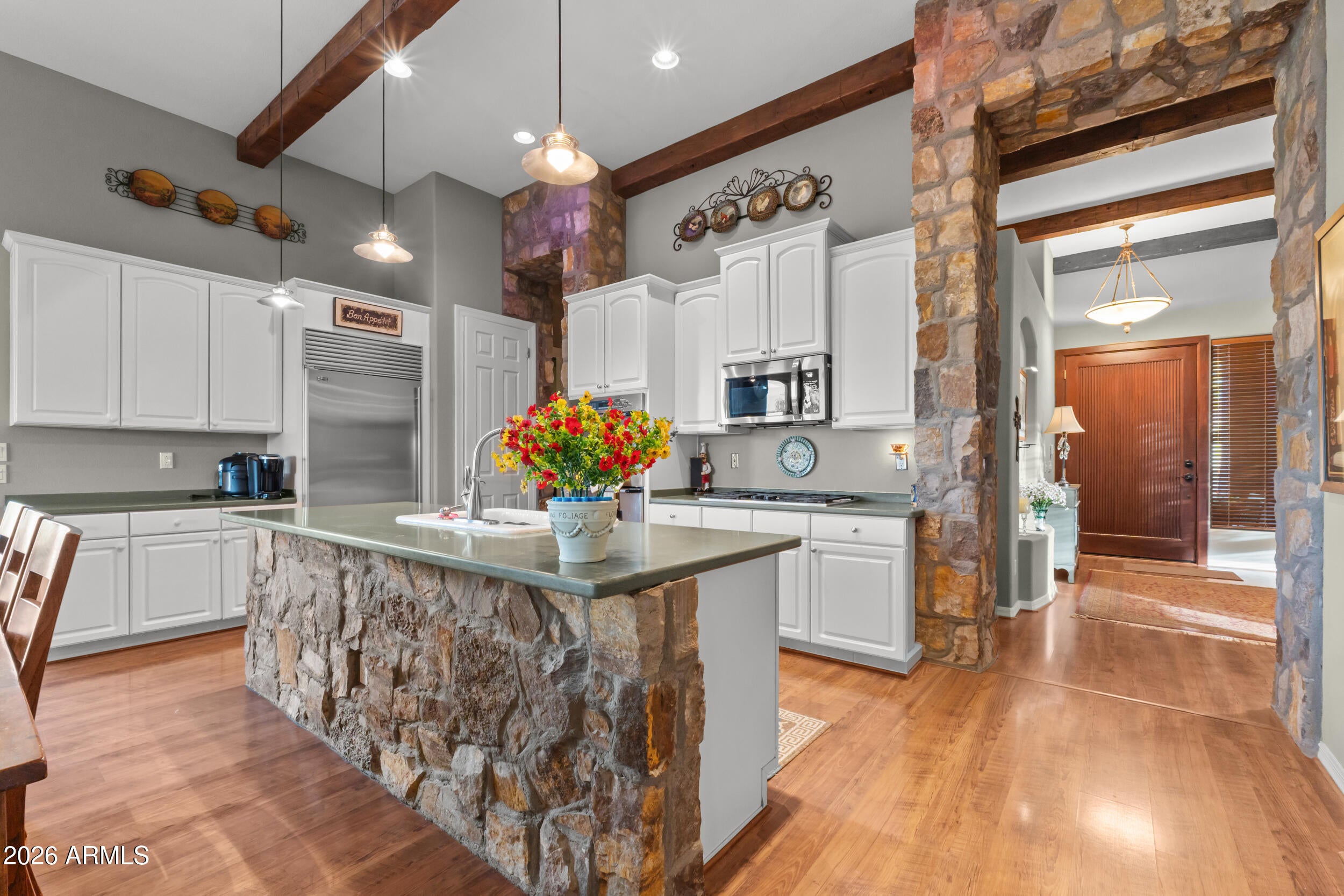Enjoy the best of both worlds--just a 15-minute, stress-free drive from the new TSMC chip plant, yet tucked away in the peaceful Sonoran Desert countryside of Cave Creek. This meticulously upgraded early 21st-century desert gem offers 3,680 sq ft of living space and over 5,500 sq ft under roof, blending timeless craftsmanship with modern efficiency.Inside, the home features R-42 insulation and insulated interior walls for superior energy efficiency and sound control. The main living areas are enhanced with custom architectural solid wood beams, elegant built-in wood features, and striking natural fieldstone accents that flow seamlessly through the living room, kitchen, bar, and family spaces.Crypto is accepted A breathtaking 12-foot custom stone fireplace with a dual A&B flue system allows for both wood-burning and natural gas use, topped with a one-of-a-kind mantel crafted from a 100-year-old reclaimed Michigan barn beam.A standout feature is the fully customized art studio by California Closets, complete with built-in cabinetry, a retractable desk, hidden sliding double doors, and five expansive windows, including a dramatic negative-edge window that fills the space with natural light.The home offers a highly desirable private guest suite/mother-in-law quarters with 2 bedrooms, 1 full bath, three private entrances, and a connecting door to the mudroom--ideal for multi-generational living, guests, or rental income.The garage is fully upgraded with over 10,000 in custom-built storage and workspace solutions, complemented by sleek epoxy flooring.Step outside to your own private retreat featuring a newly remodeled lagoon-style PebbleTec pool (2025) with elevated Kool Deck, multi-speed pump, and stunning natural stone water features, including a two-way waterfall and decorative water bowls. Additional exterior highlights include 600 sq ft of artificial turf for low-maintenance living.Recent updates provide peace of mind, including fresh interior and exterior paint (2023 & 2025), new Berber carpet (November 2025), hand-refinished Corian countertops (May 2025), and a roof inspection, maintenance, and certification completed in May-June 2025.This exceptional property offers a rare combination of luxury finishes, functional design, flexibility, and income potential--all set within a serene desert landscape with surrounding natural open spaces. A truly one-of-a-kind opportunity in Cave Creek.