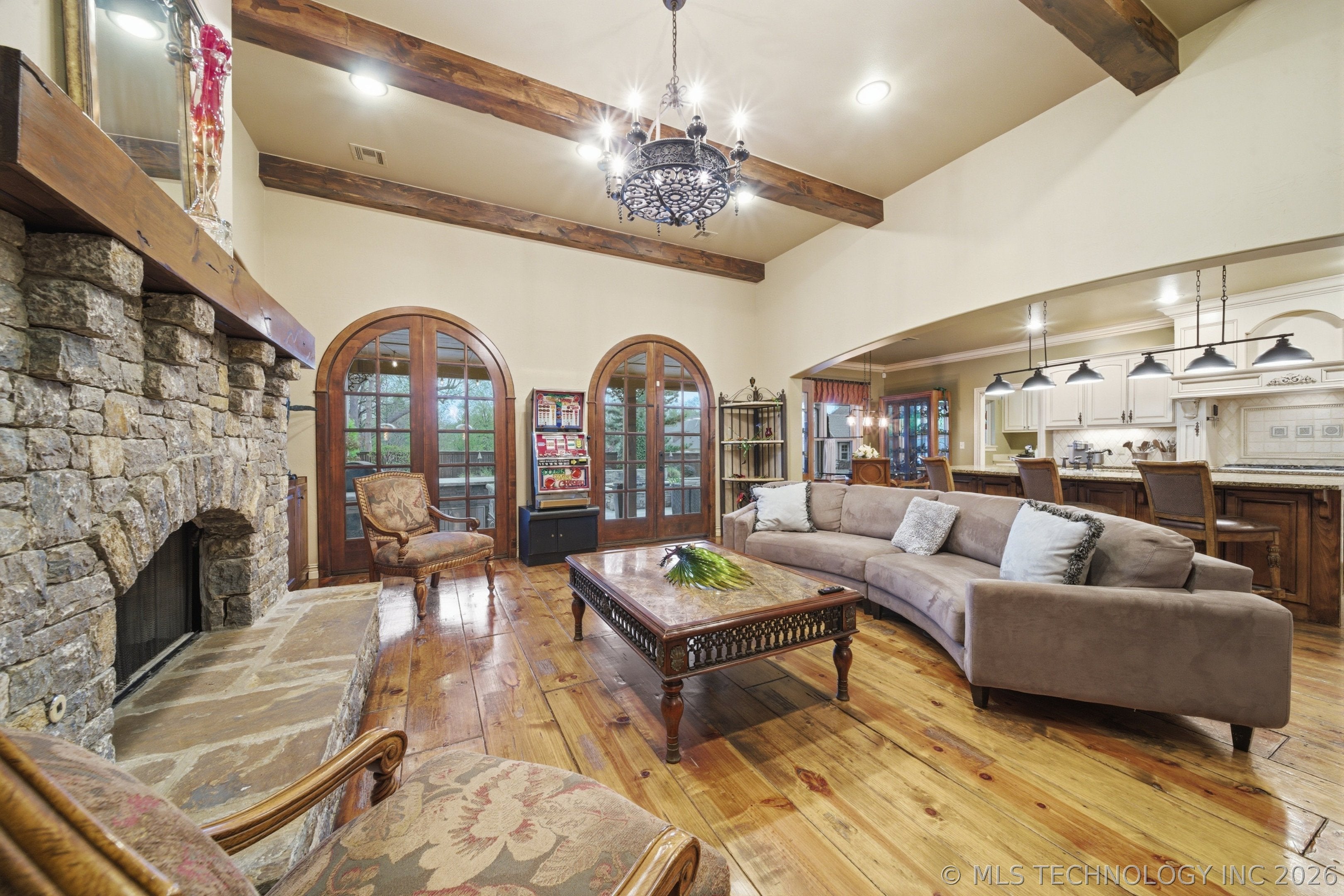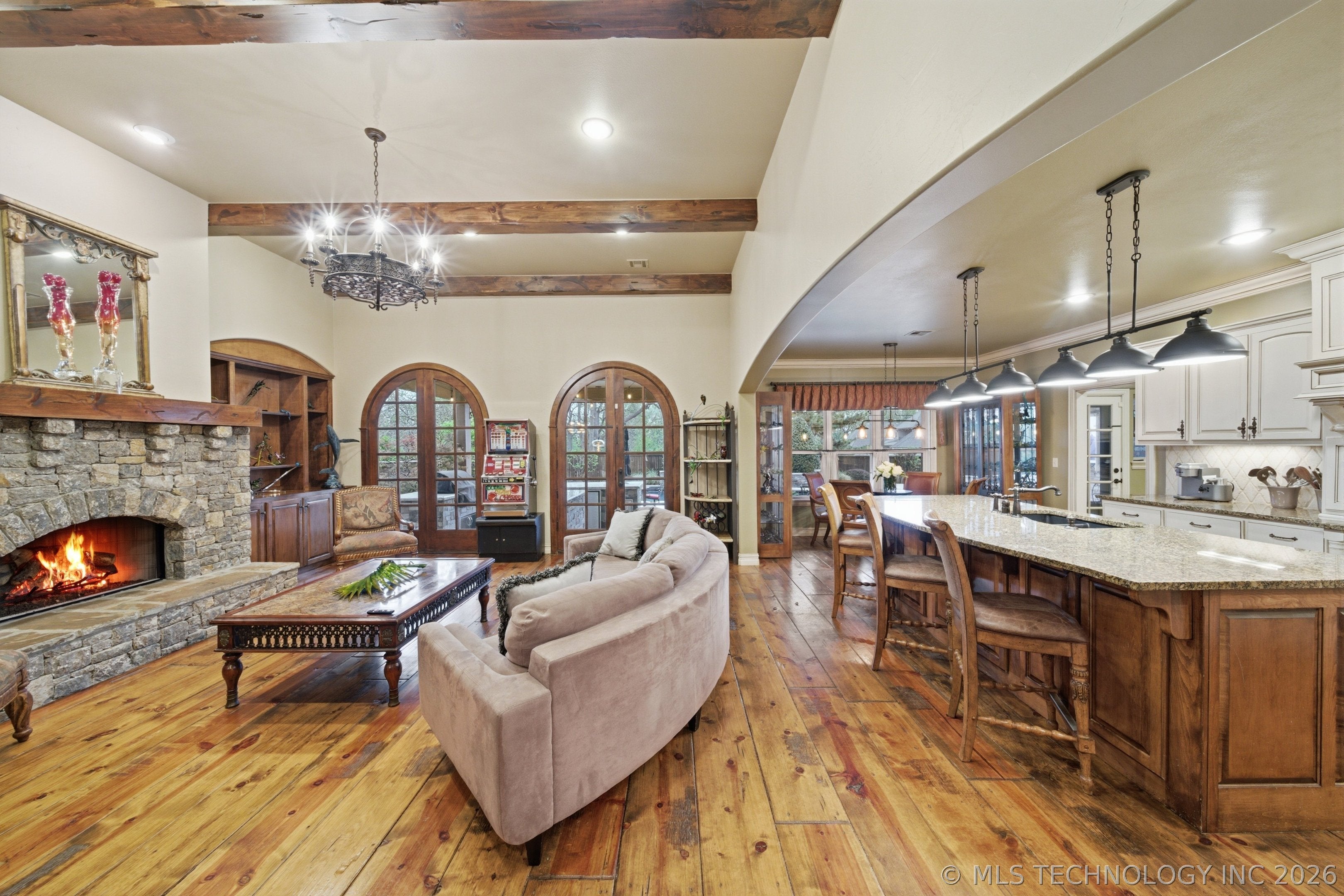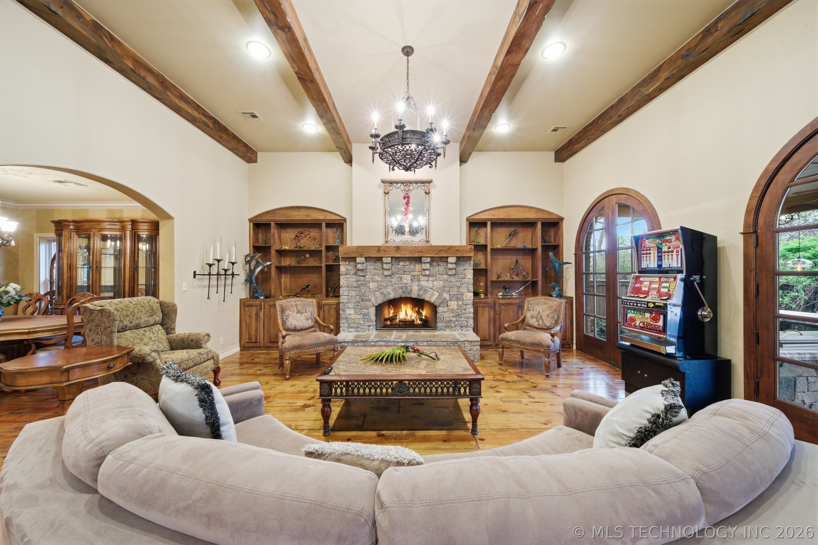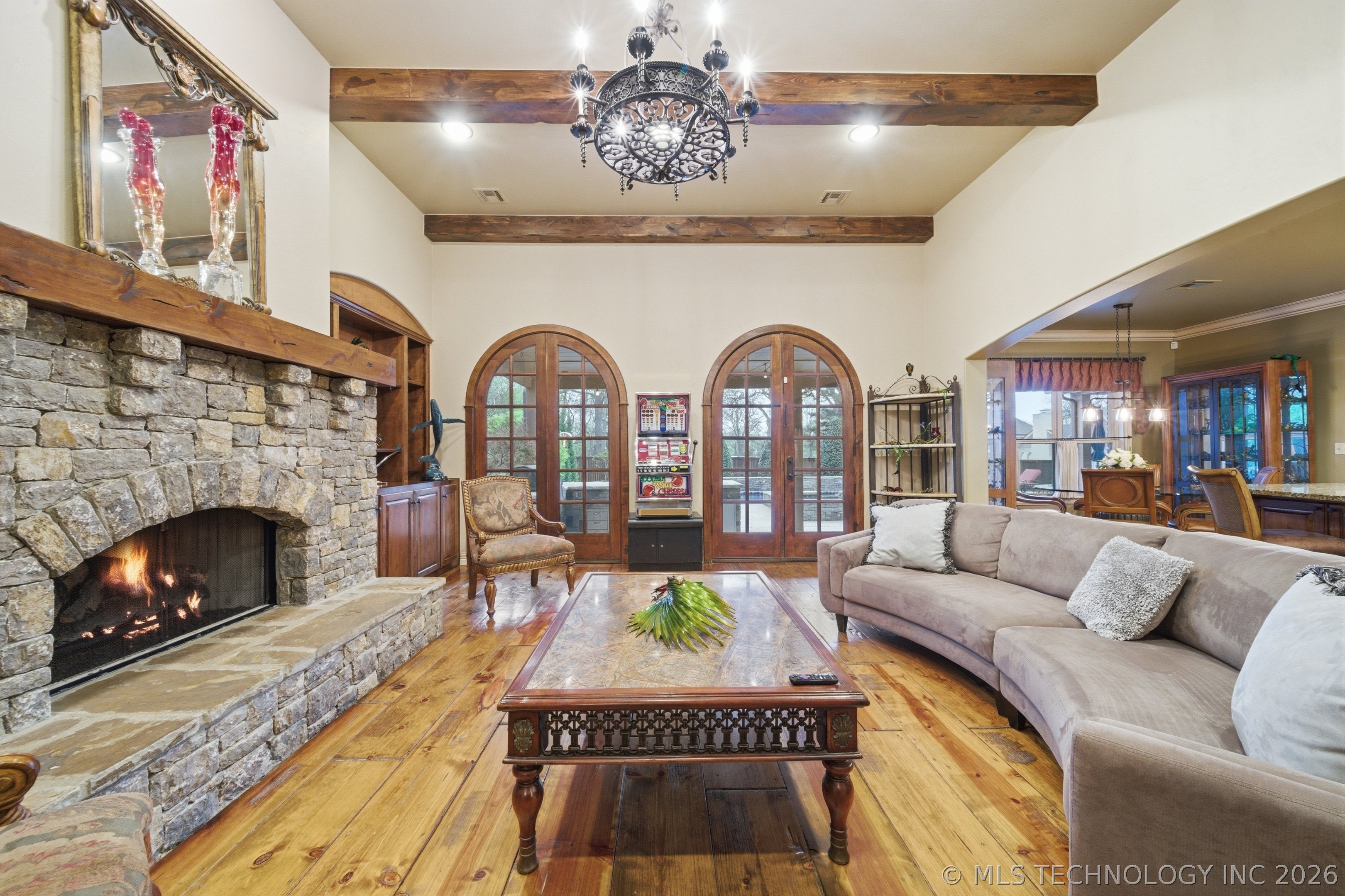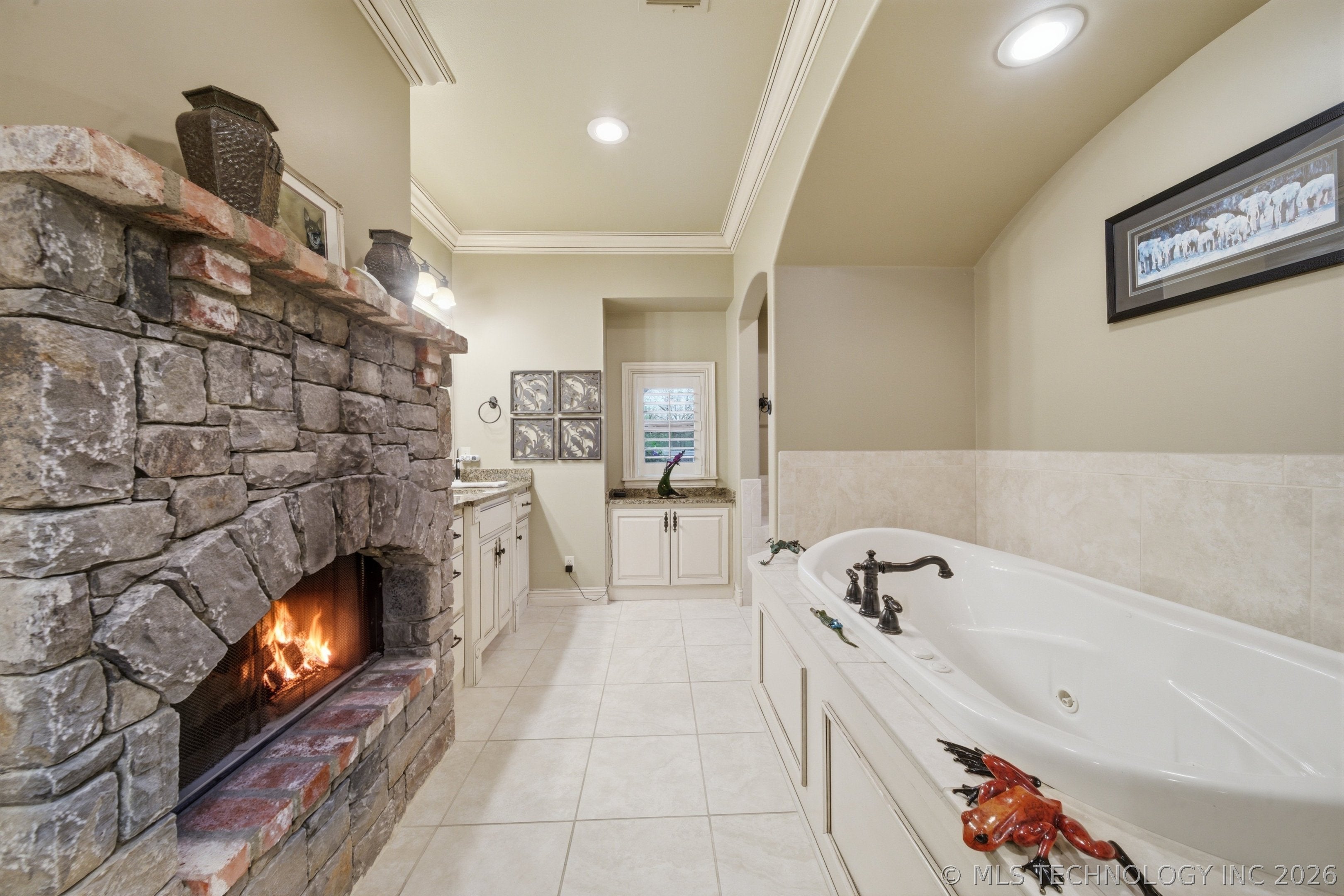 Experience exceptional lakefront living at 61 Blue Heron Drive, perfectly situated on nearly half an acre backing to a private lake with mature landscaping and breathtaking views. Enjoy lake access with non-motorized boats or electric trolling motors and fishing allowed. A grand entry with hardwood floors welcomes you and features a striking dual-sided fireplace that opens to the formal living room with access to a covered deckideal for indoor-outdoor entertaining. The main level also includes a private study with wainscoting, French doors, and built-ins, along with a formal dining room showcasing a tray ceiling, crown molding, custom archways, and a designer chandelier. The gourmet kitchen is equipped with a gas range, granite island with seating, abundant cabinetry, and an attached kitchen nook with deck access and built-ins. The adjacent family room offers a newly updated fireplace with custom stone, built-ins, and a wet bar with beverage fridge. The primary suite is a true retreat with a three-sided fireplace, private sitting area, deck access, and a spa-like five-piece bath with dual vanities, soaking tub, walk-in shower, and walk-in closet. An additional upstairs bedroom features an ensuite bath, plus a convenient laundry room. The finished basement is designed for entertaining and relaxation with a theater room (projector, screen, surround sound), additional bedrooms including one with ensuite bath, a hall 3/4 bath, and gym with patio access. A large storage room provides direct backyard access. Enjoy the incredible outdoor setting with covered deck and patio, and peaceful lake views. Additional features include newer roof, gutters, furnaces, A/C units, water heaters, exterior paint, new main-level carpet and paint, and a 4-car garage with newer doors.