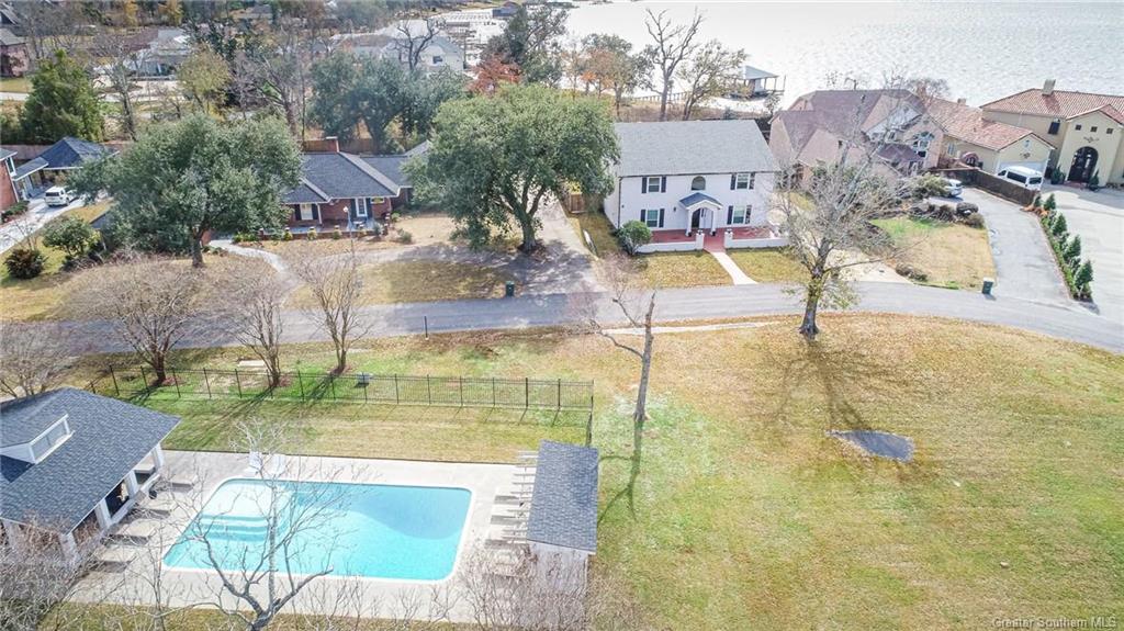 Waterfront home located on Prien Lake at the end of a winding single street subdivision near the Lake Charles Country Club. Property is just under 1.5 acres and situated on a bluff with over 125 feet of water frontage with deep water access for virtually any size boat. Home has over 6000 square feet of living with additional workshop and pool house.